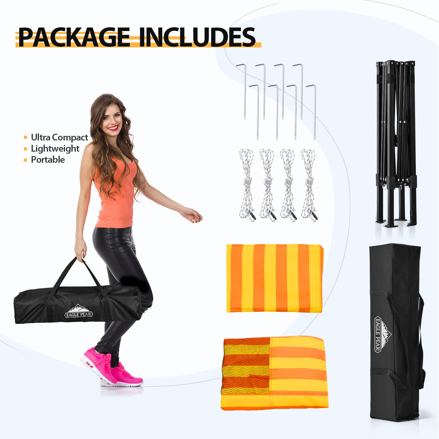 • WHAT’S INCLUDED: Canopy Frame, 140g polyester top fabric, sidewalls with easy-entrance zipper for complete enclosure, 2 hooks to hang clothes, towels etc, a mesh storage pocket, carry bag, and 4 additional storage pockets in the lower corners for weights.