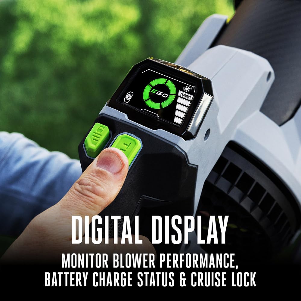 Details: The EGO POWER+ 880 CFM Cordless Blower is our most powerful handheld blower, delivering up to 880 CFM and air speeds up to 200 MPH. It features a digital display to monitor blower speed, battery charge status, and cruise lock in real time. Use the variable speed trigger to adjust your airflow from 270 CFM to 700 CFM for ultimate control. Activate turbo mode when you need to power through heavy debris including wet leaves, rocks, mud, and snow to unleash 880 CFM and up to 200 MPH with the tapered nozzle attached. This cordless leaf blower features a high-efficiency brushless motor that delivers long runtimes, low vibration, and an extended motor life. The turbine fan engineering, inspired by advanced aeronautics technology, performs better than premium gas leaf blowers. The lightweight carbon fiber body makes this cordless blower extra lightweight durable. The included tapered and spread nozzles make clearing debris in all conditions easy, and IPX4 weather-resistant construction delivers protection from the elements. The cordless electric blower delivers up to 90 minutes of average runtime with two included 4.0Ah ARC Lithium™ batteries. The kit includes the cordless blower, (2) 4.0Ah batteries, 320W charger, tapered nozzle, spread nozzle, and shoulder strap. Experience Power Beyond Belief™ with the EGO POWER+ 880 CFM Cordless Blower.