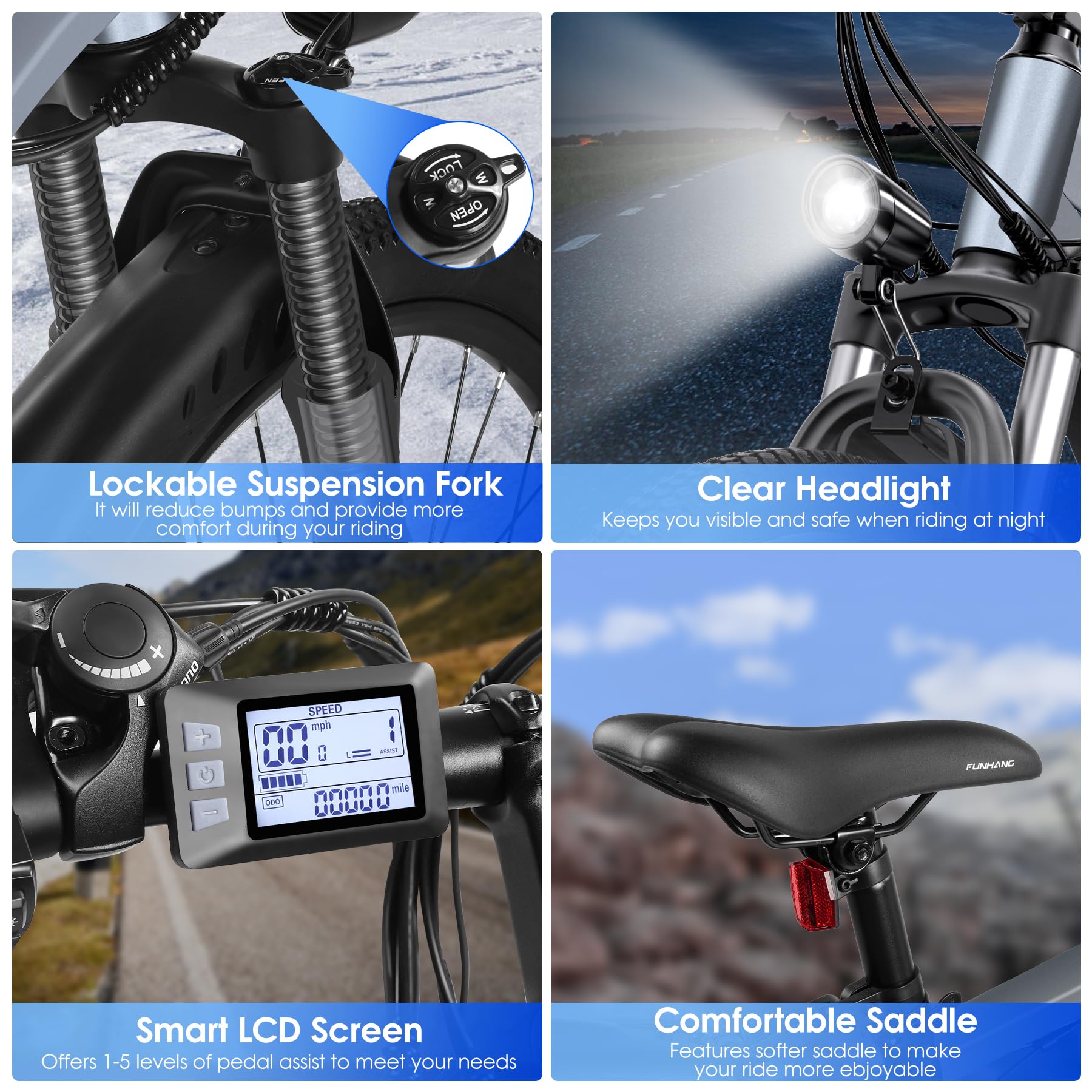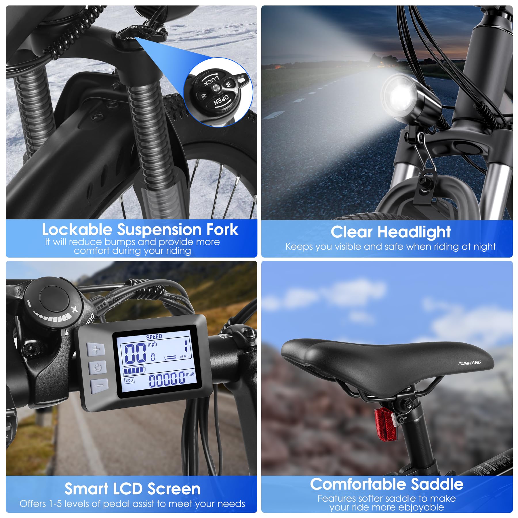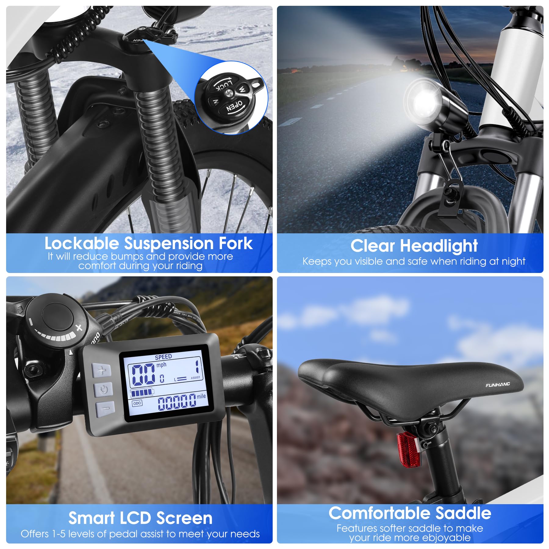 Funhang adult electric bike is equipped with a headlight that is bright enough to keep you visible and safe when riding at night.