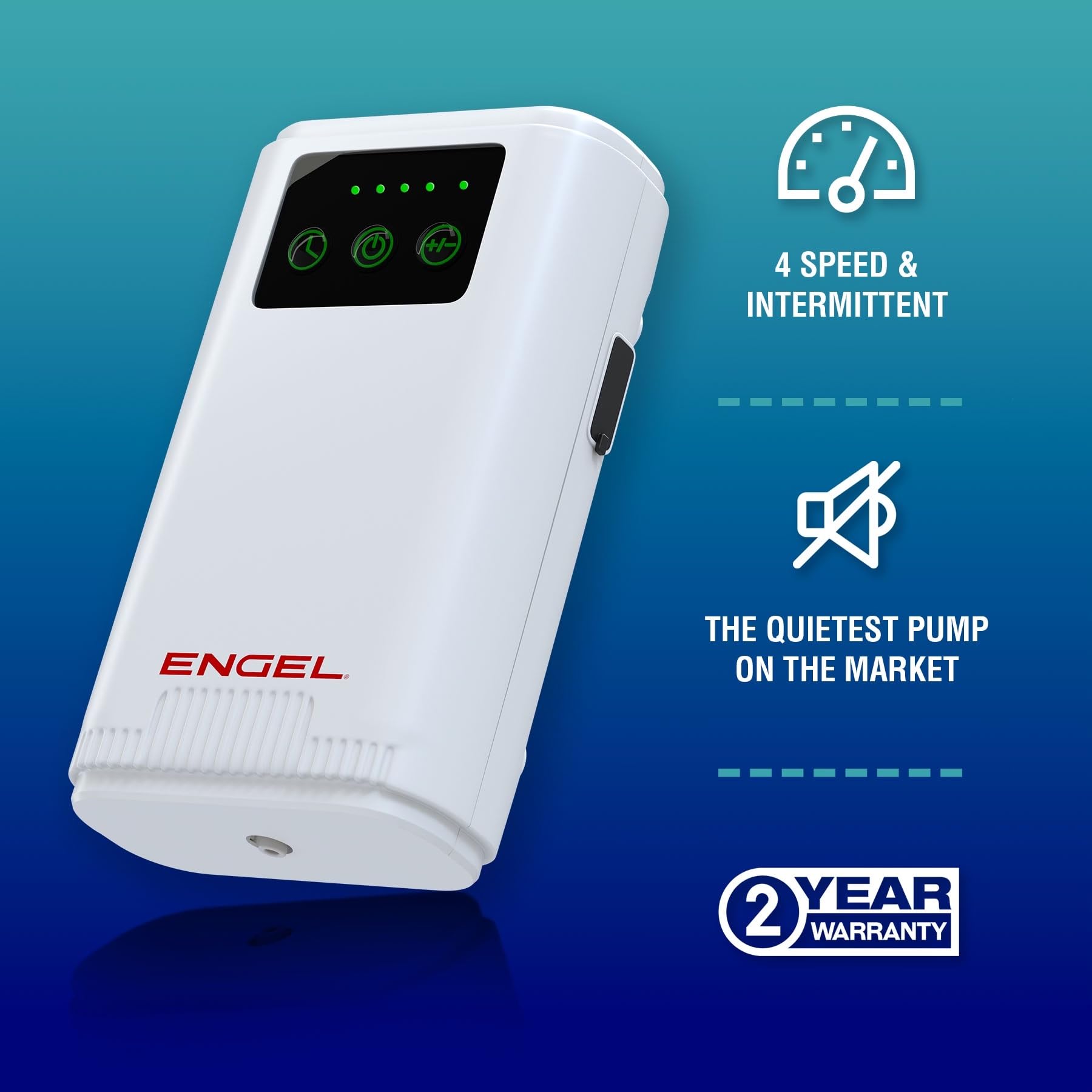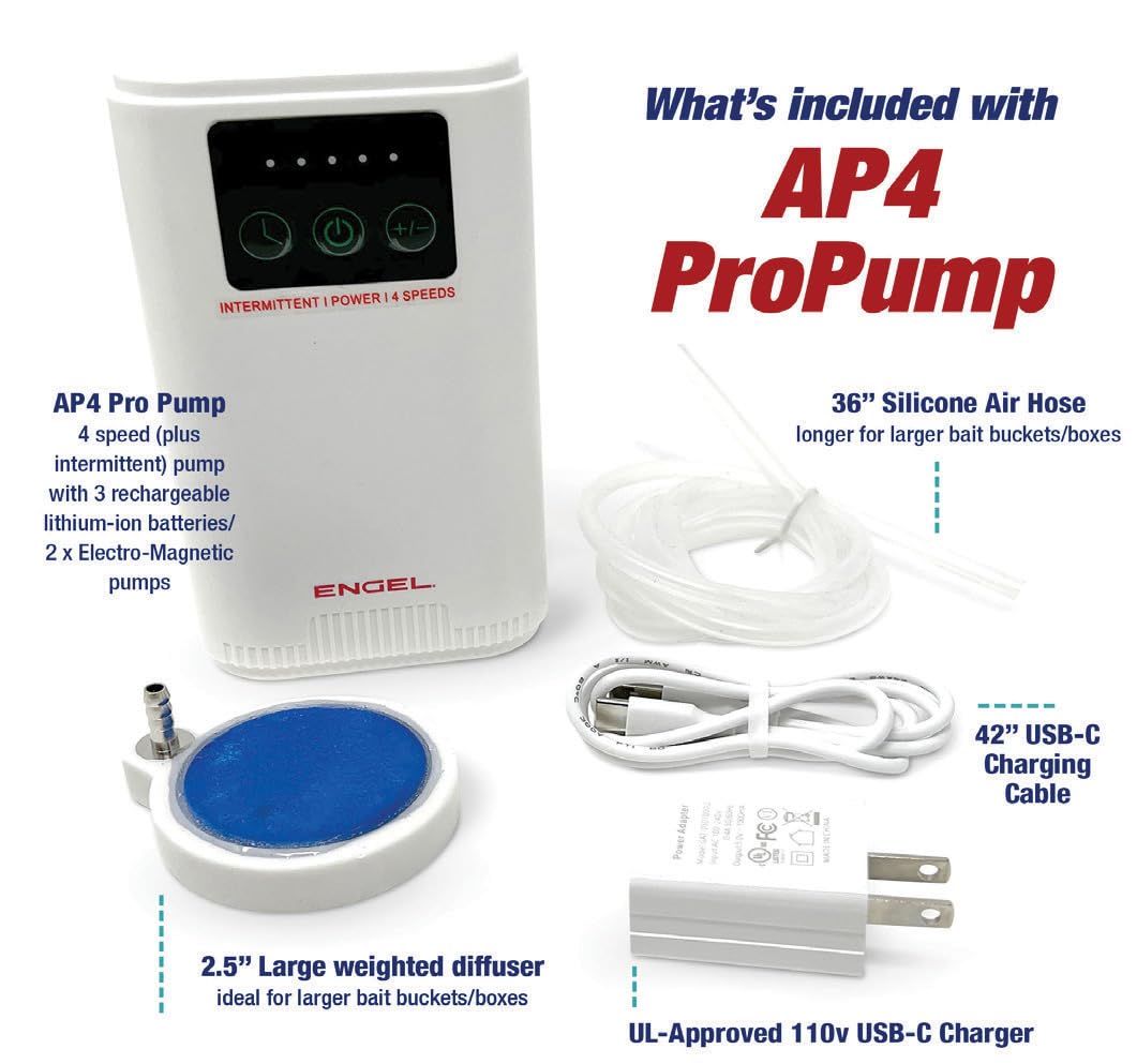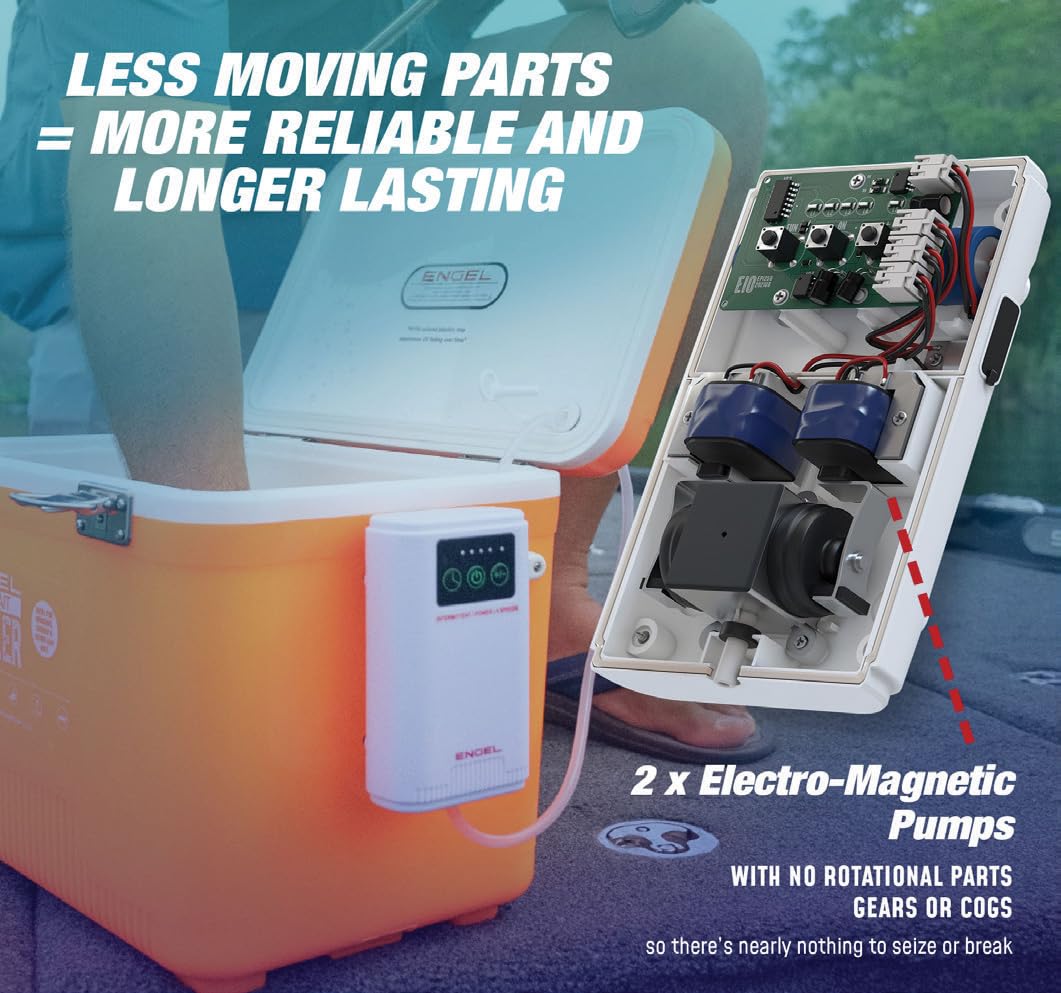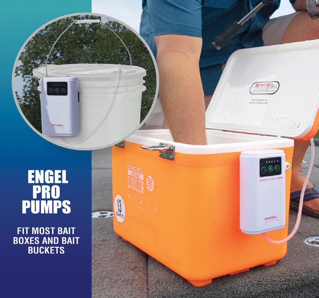 - ENJOY THE QUIET: We are proud to have the quietest bait air pump on the market. When tested against other leading brands, the Engel air bubbler is by far the quietest.
