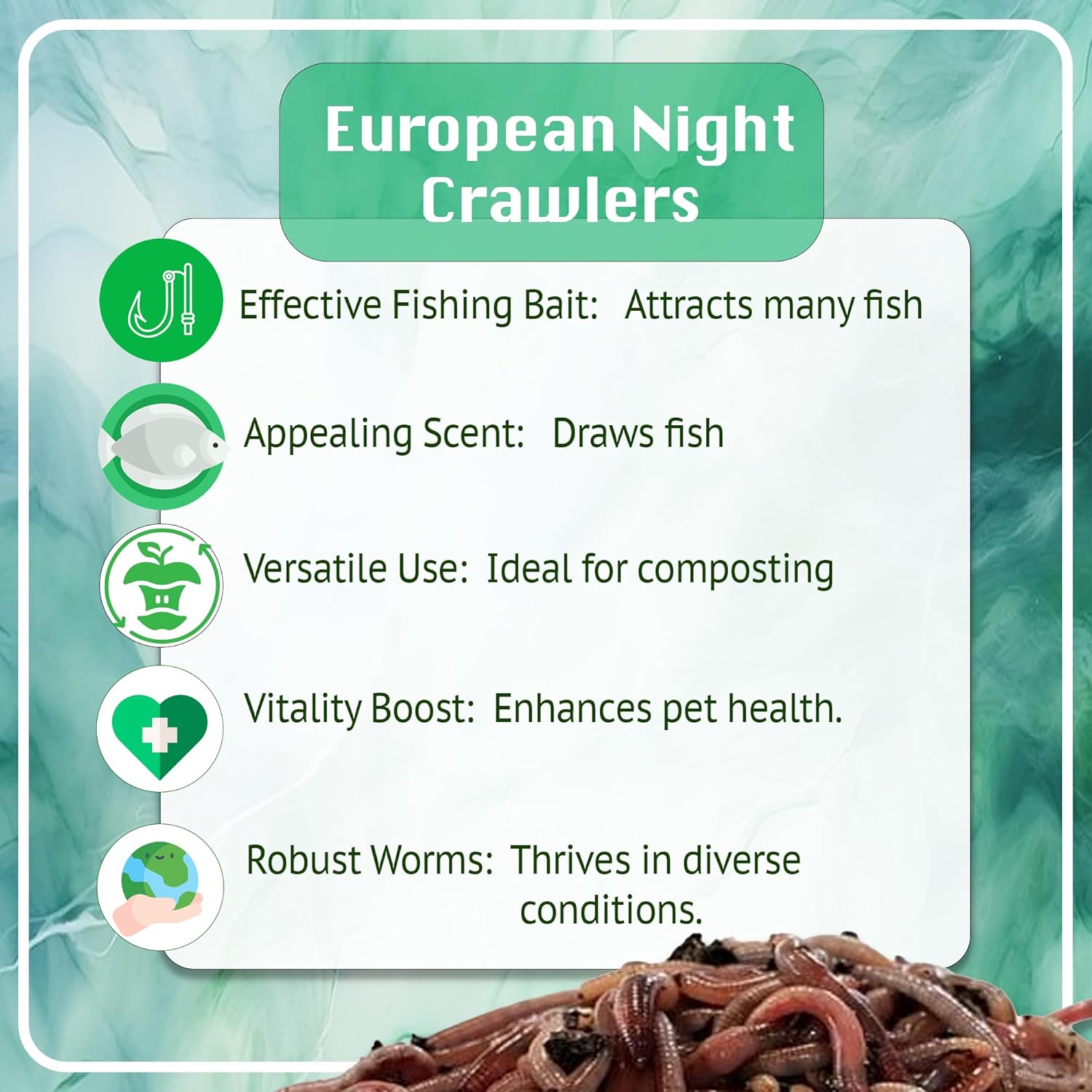 - High-Performance Bait: European Nightcrawlers, measuring 2 to 3 inches, are perfect for fishing a wide range of species, including trout and panfish. Their lively movement and appealing reddish-brown color make them an effective and versatile bait choice for various fishing scenarios.
