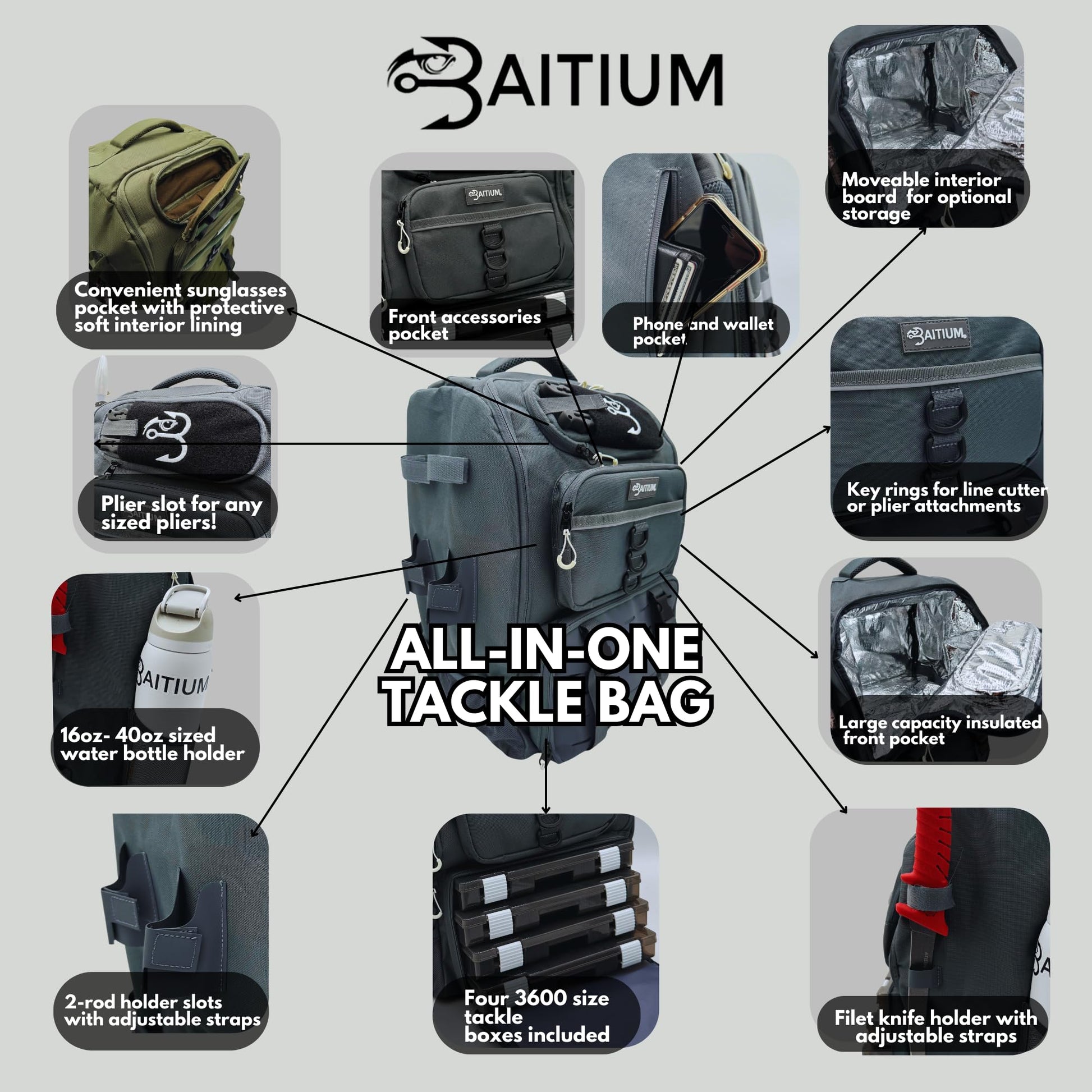 • Convenience Redefined- Elevate your fishing expeditions with Baitium’s 40L Fishing Tackle Backpack, meticulously designed for maximum convenience. This versatile backpack boasts intelligently placed rod holders, allowing for hassle-free transportation of your fishing rods. Additionally, its thoughtfully designed insulated top pocket preserves bait freshness, while the inclusion of four 3600 size tackle boxes ensures you're equipped for any angling scenario.