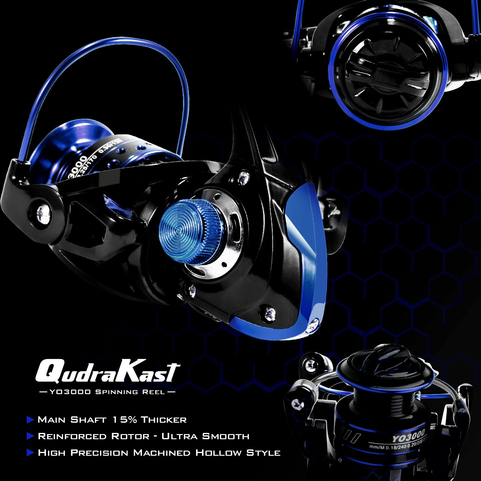 - QudraKast YO-3000 Fihisng Reel: 12+1 Full Metal Body and Sideplate with High Carbon Fiber Machined Aluminum Reel Seat, Hydrophobic Line Roller Bearing, Over 100,000 Tests High-Intensity Anti-Corrosion, Split Design Grip for maximized lightness and comfort, Gear ratio: 5.2:1.