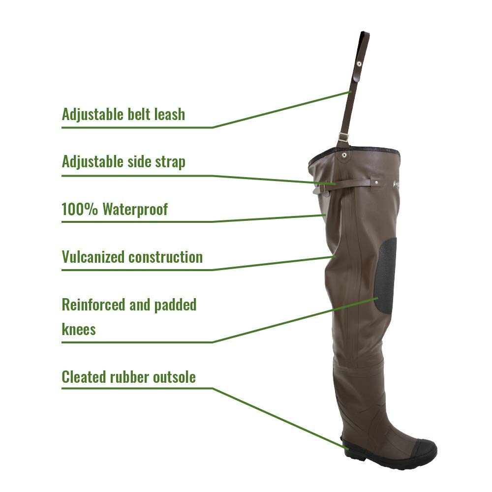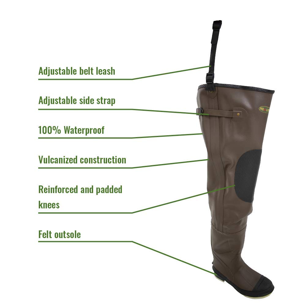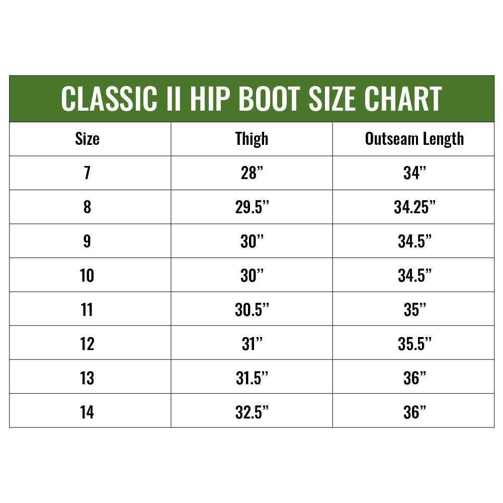 Rapid rivers. Quiet streams. Lapping lakes. Endless surf. You're an avid fly fisherman and you just can’t stay out of them. And you shouldn't. Gear up instead with the frogg toggs Classic II Hip Boot Waders. They'll allow you to go in deep for a chance at bringing in the fish of a lifetime. You'll appreciate the 100% waterproof vulcanized construction. Keep stable and on your feet with the help of the non-slip felt outsoles. Padded knees give you a little extra comfort to keep on fishing on! Sizing info: Foot Size 7/8: 31" max. inseam; 27" max thigh; Foot Size 9: 32" max. inseam; 27.5" max thigh; Foot Size 10: 33" max. inseam; 28" max thigh; Foot Size 11/12: 34" max. inseam; 28.5" max thigh; Foot Size 13/14: 35" max. inseam; 29" max thigh; Mfg. Number: 5716347F