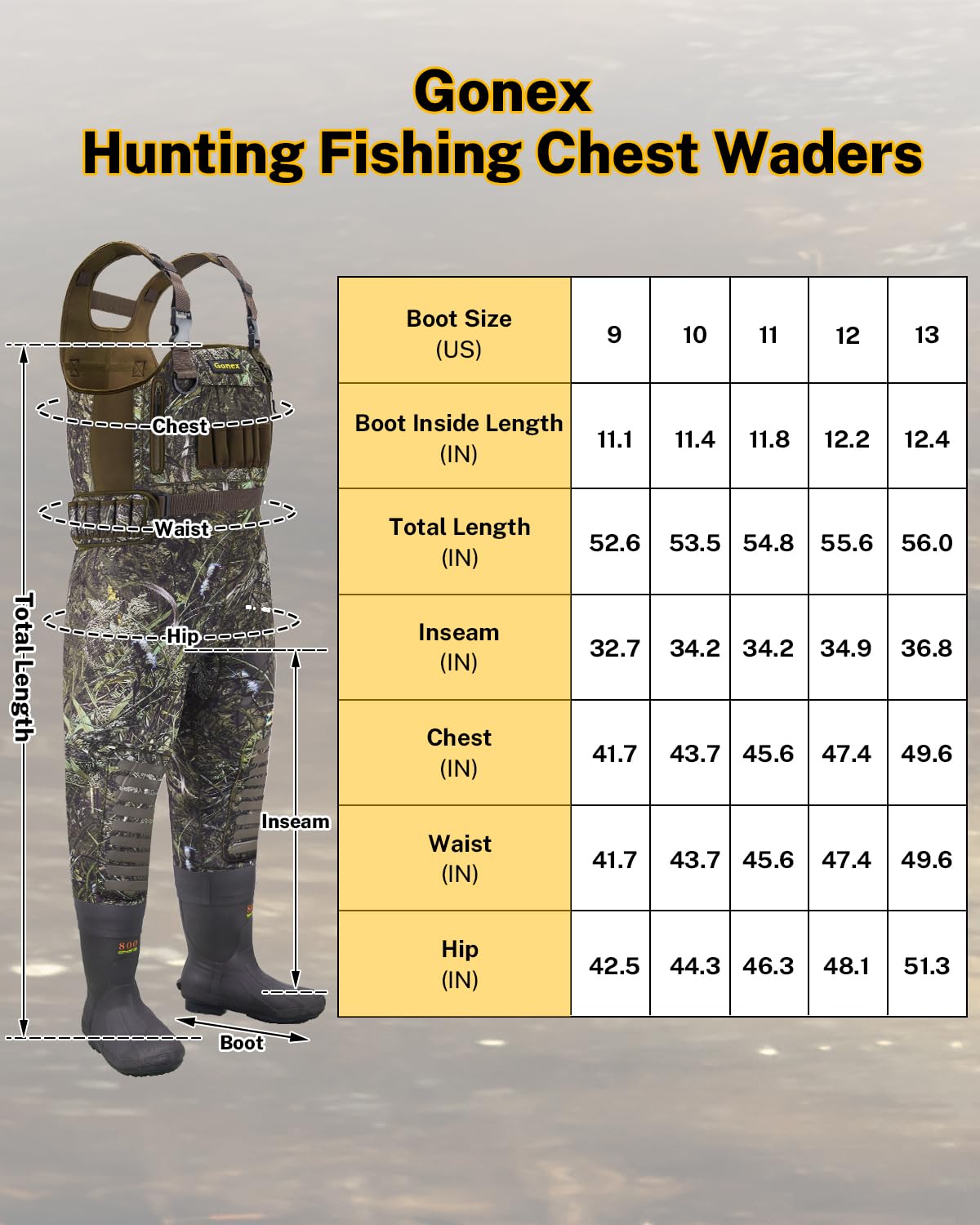 - 4.5MM Neoprene Waterproof & Warm: Gonex chest waders for men and women are made from warm and flexible 4.5 mm neoprene, laminated to polyester jersey and stretch liner. And the hunting waders feature double-stitched sealed seams for enhanced durability and reliable waterproof