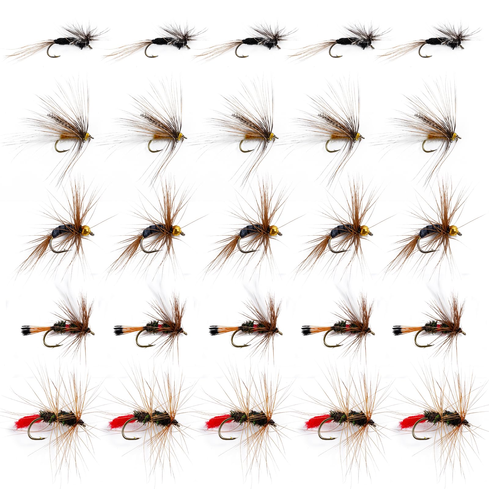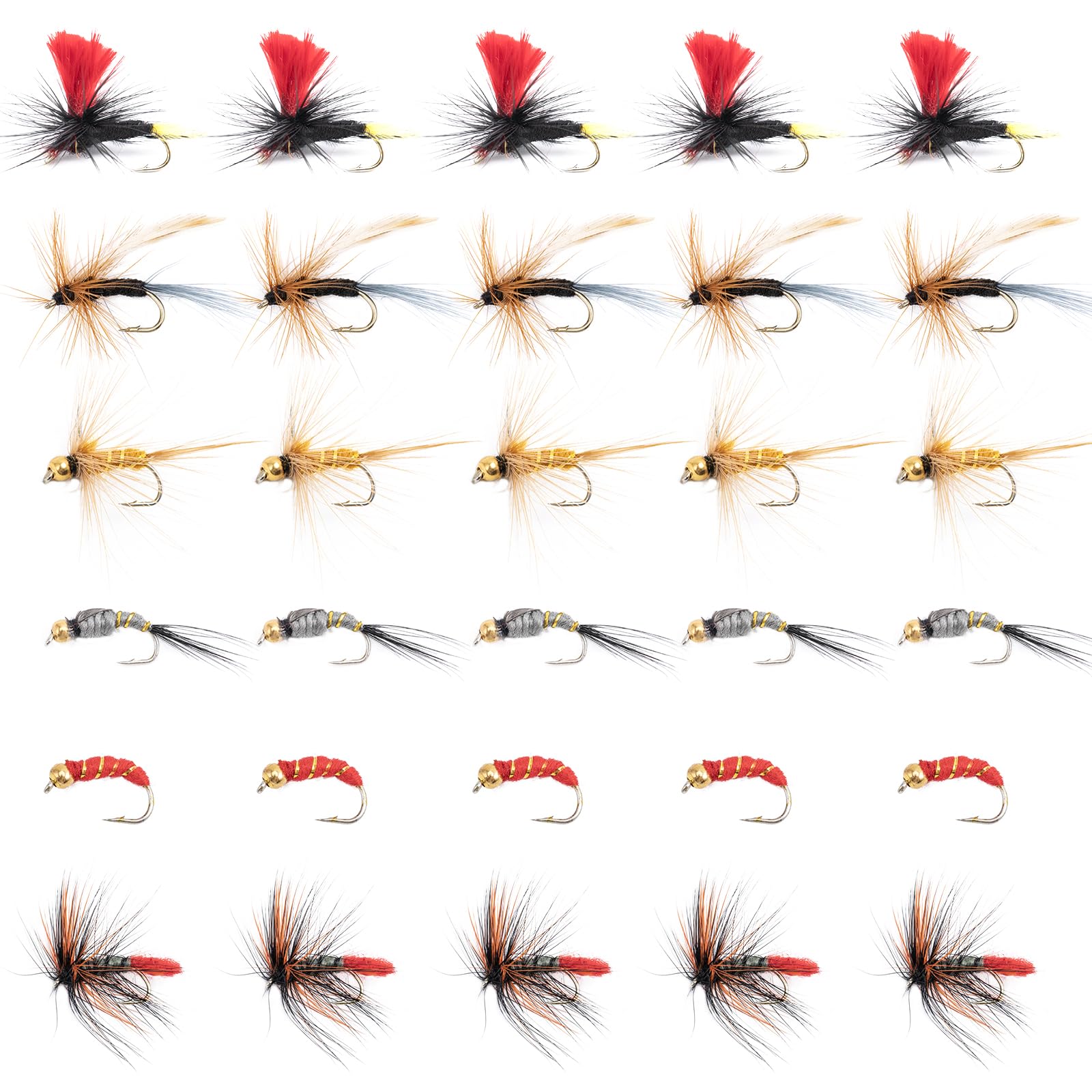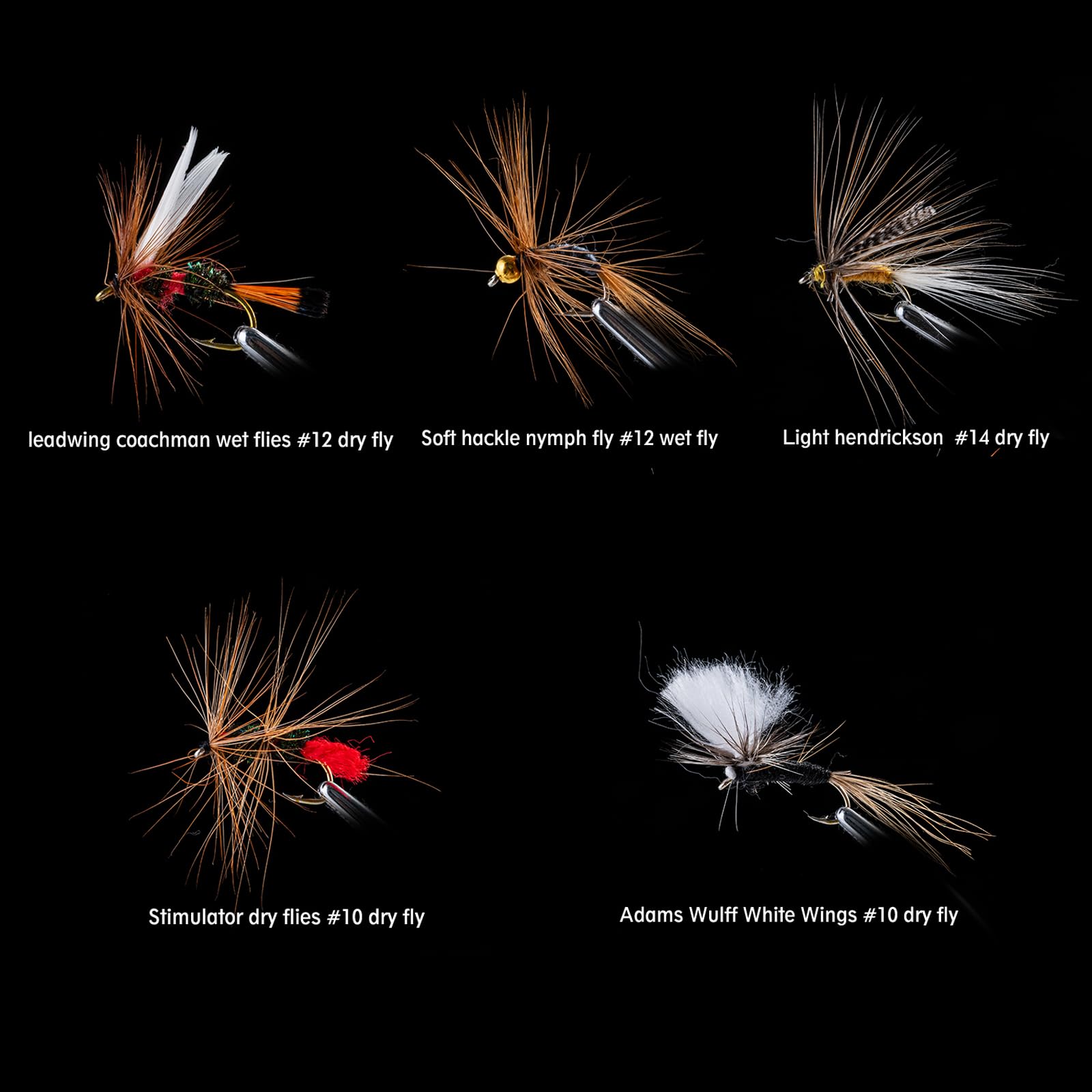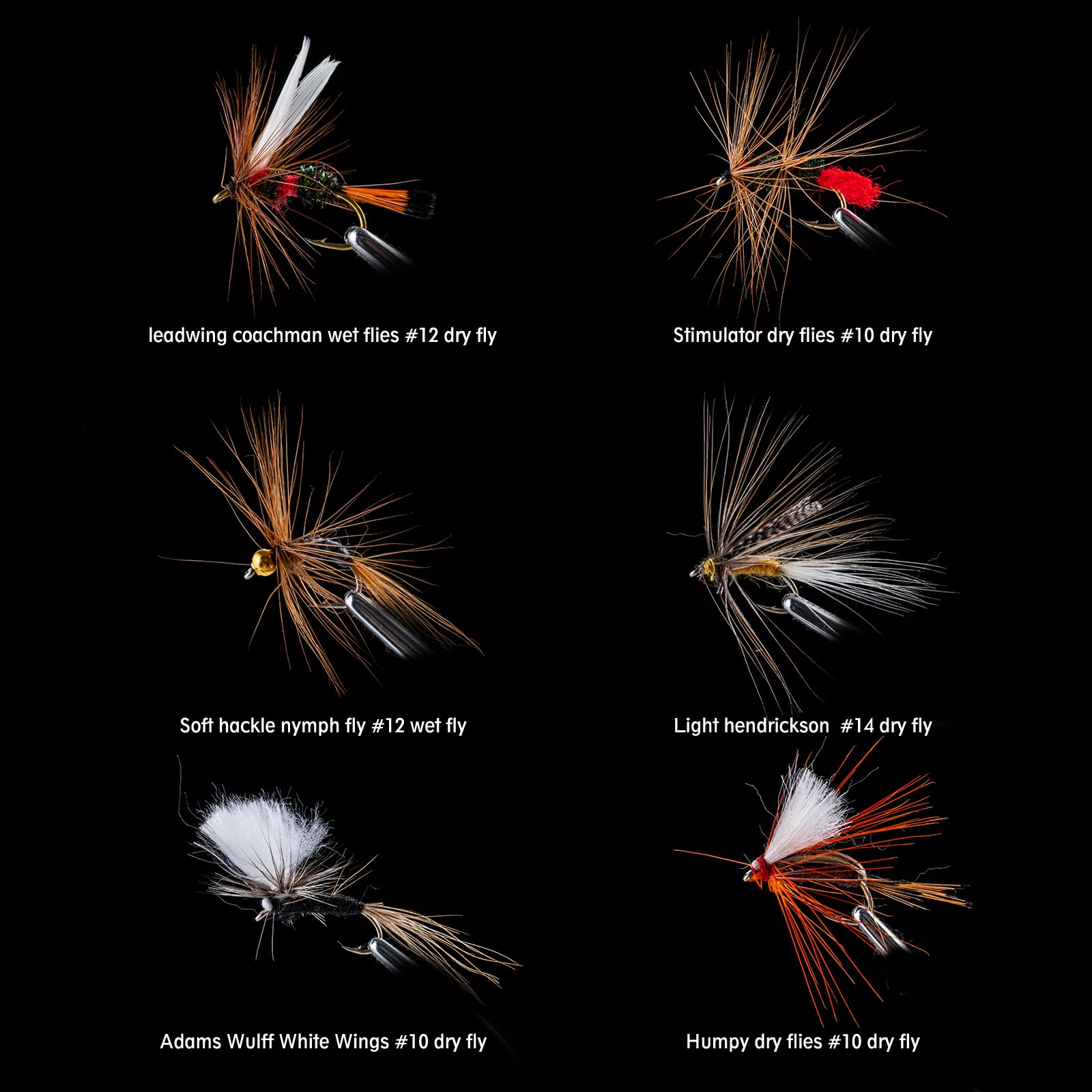 - Widely Applied: Multiple types of flies are available. The fly fishing flies assortment kit includes wet flies and dry flies. The 30pcs fishing flies set include 6 different styles of flies (such as Light hendrickson, Adams Wulff White Wings, Humpy dry flies, and so on). Great for catching Trout, Bass, Salmon, Steelhead, Pike, Carp, etc.