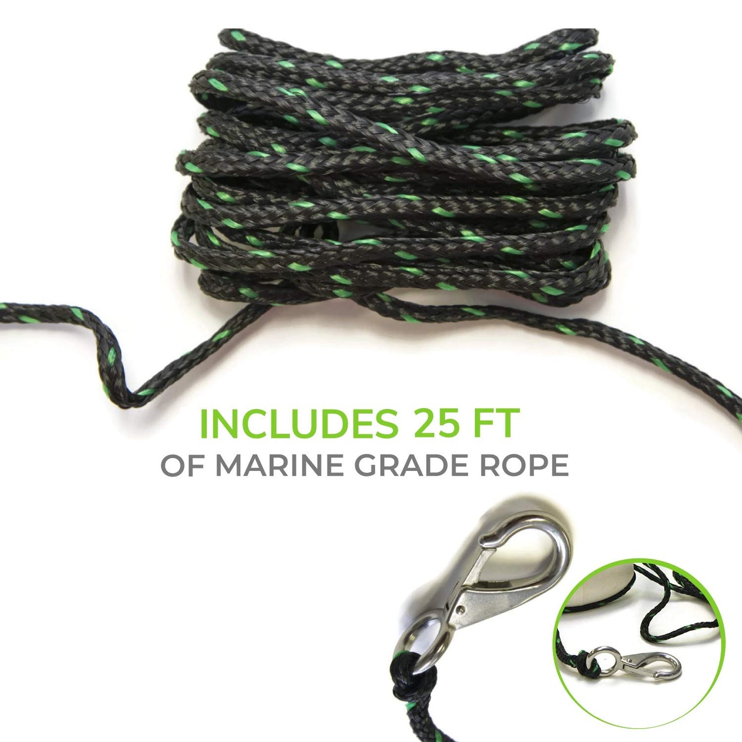 Includes a padded storage bag, 25 feet of marine grade rope (7mm thick) and s a PVC flotation buoy