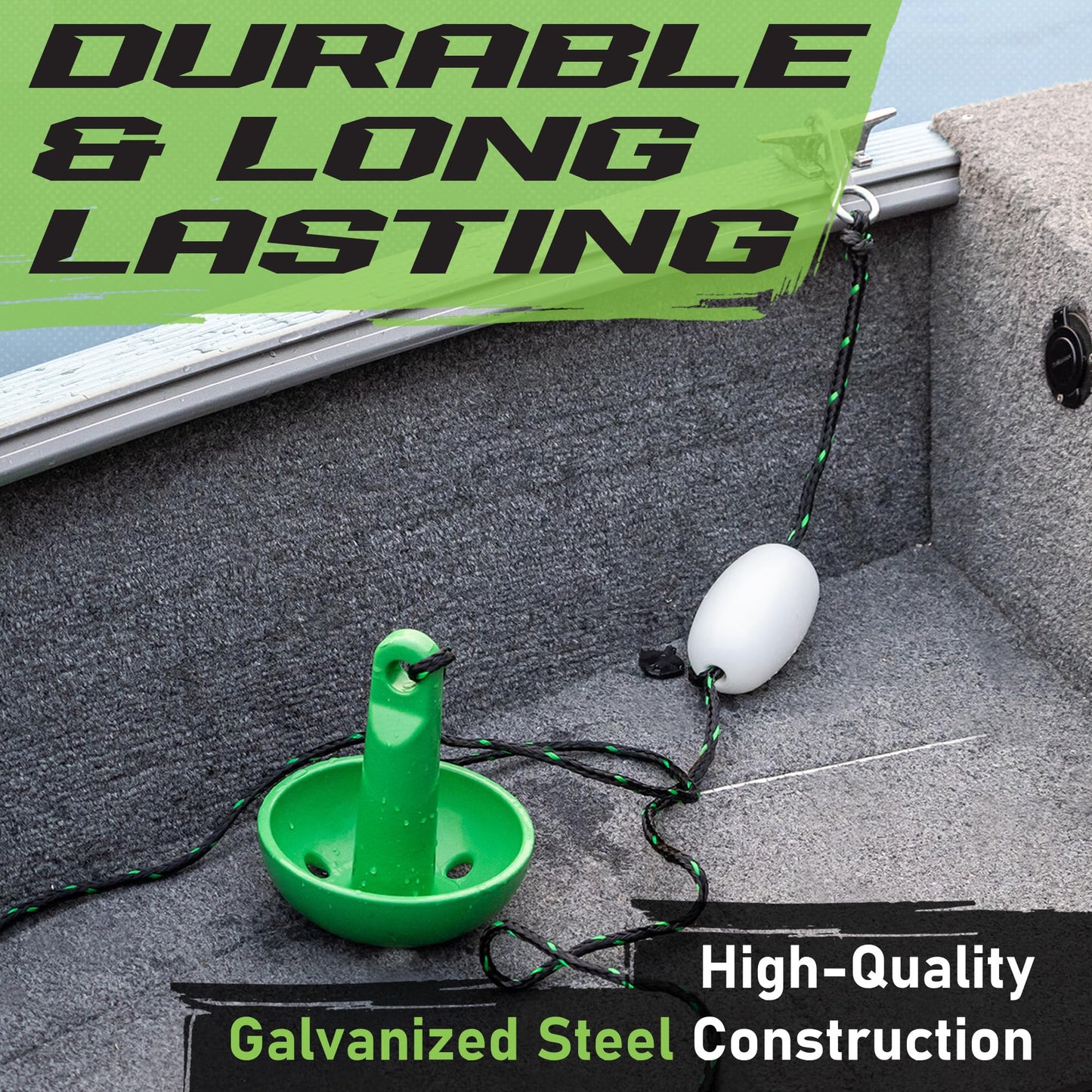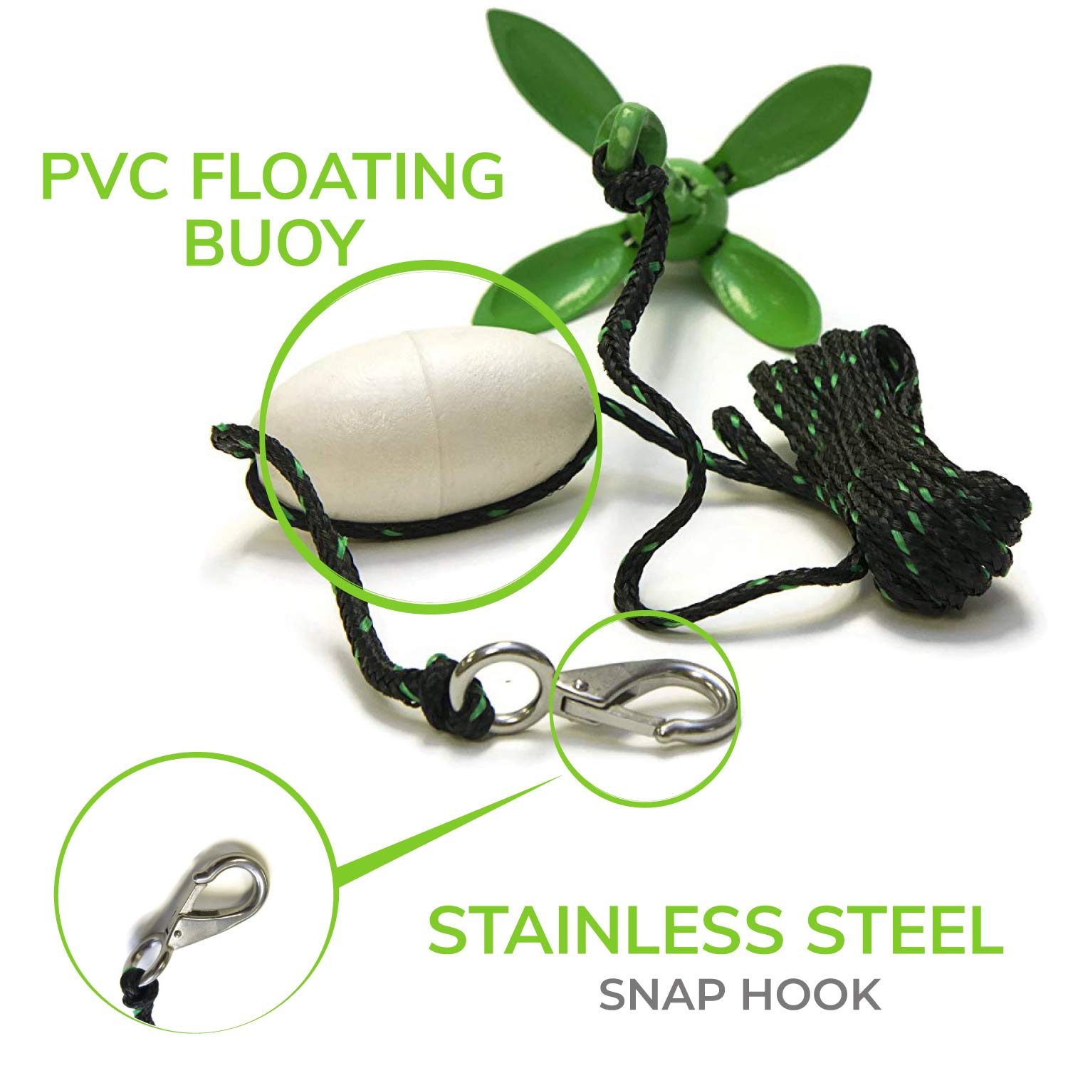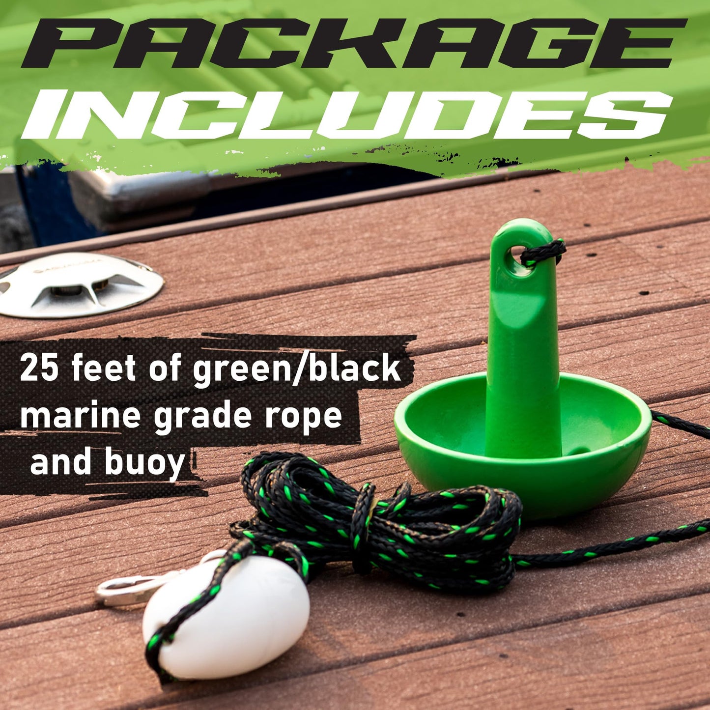 - 𝐌𝐀𝐑𝐈𝐍𝐄 𝐆𝐑𝐀𝐃𝐄: The small boat anchor is rust resistant with 25 feet of green/black marine grade rope (7mm thick). It also includes a PVC flotation buoy and stainless steel snap hook for quick and easy connections.