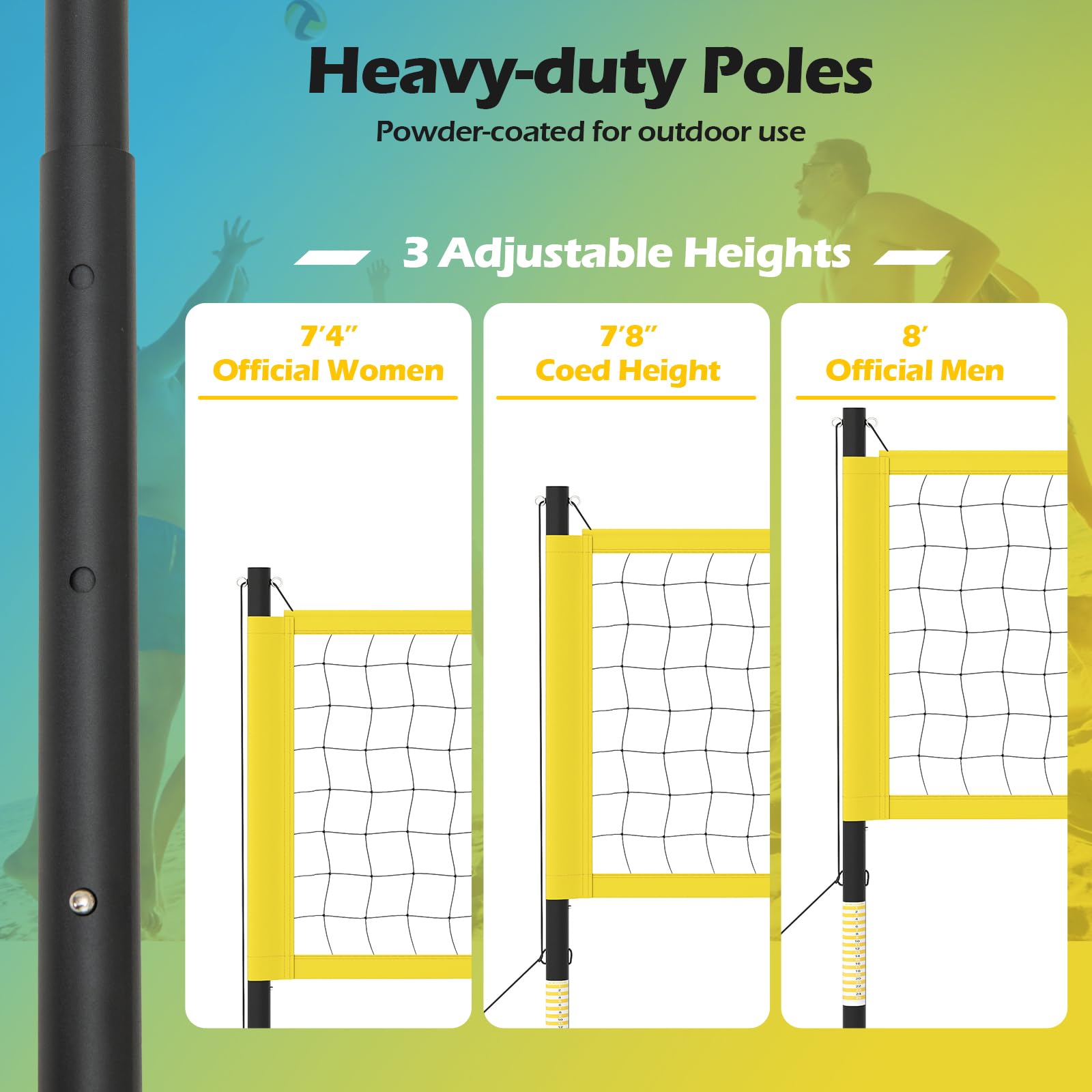 3 adjustable official heights for women’s, coed, and men’s volleyball