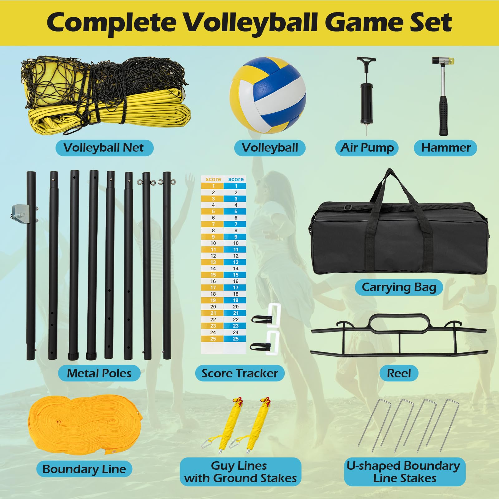 - Complete Volleyball Game Set: Along with the net, carrying bag, boundary line, and poles, the volleyball set comes complete with a forearm-friendly soft volleyball. It also includes guy lines and stakes for wind-stability, and score trackers stickers for keeping game points.