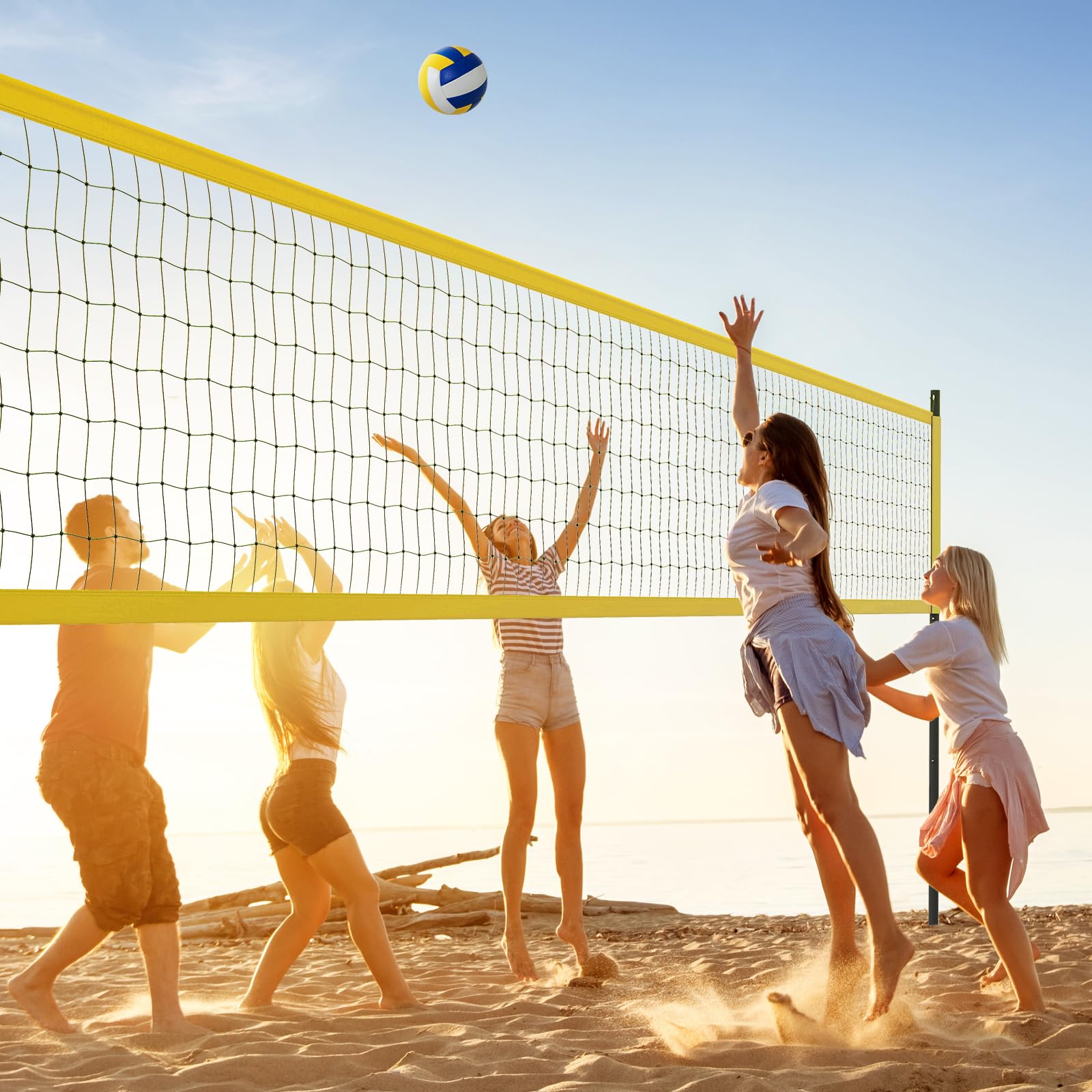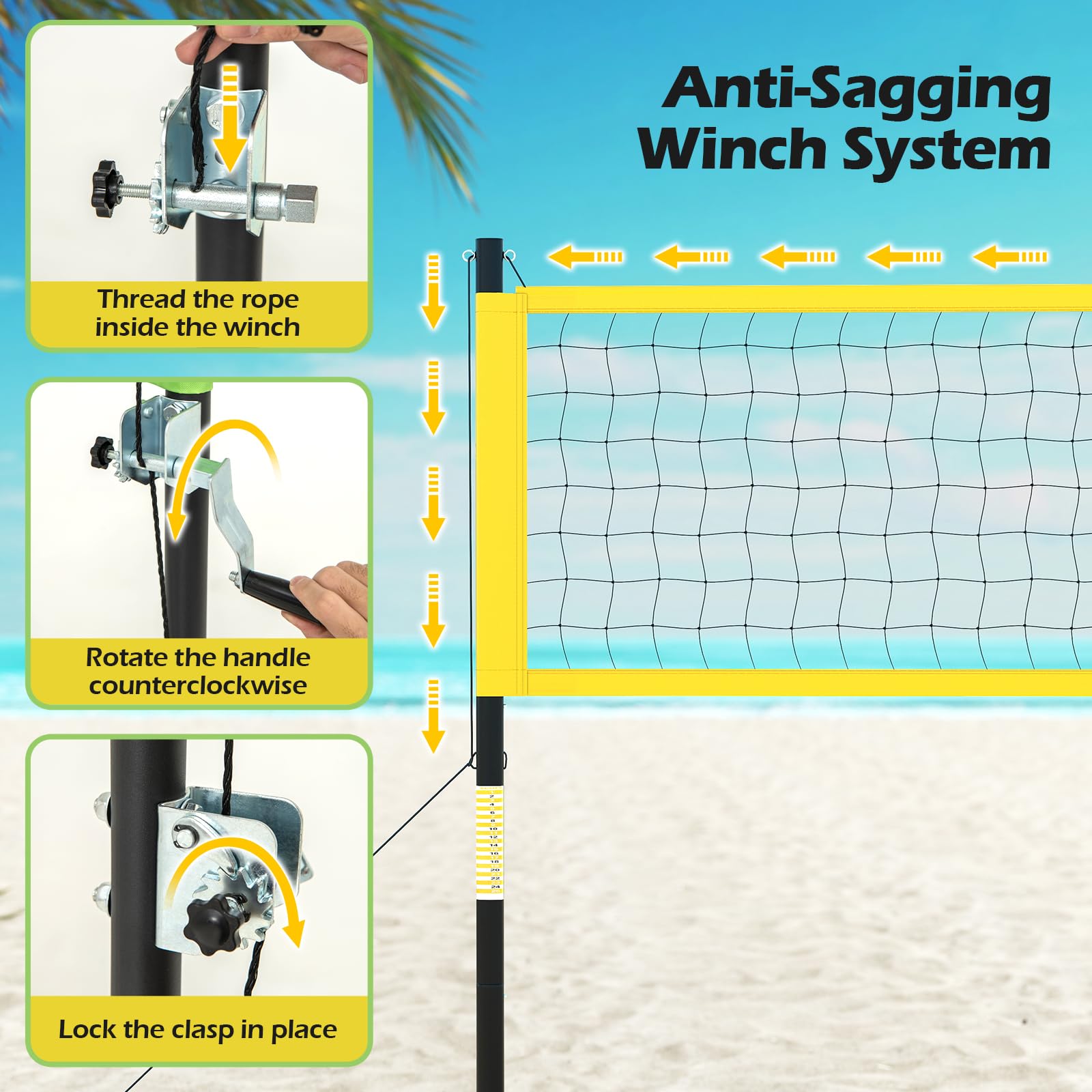 GYMAX Volleyball Net, Portable Volleyball Set with Adjustable Poles & Anti-Sag Design, Includes Beach Stakes, Scoreboard, Boundary Line and Carry Bag for Outdoor Backyard Beach Grass (Yellow)