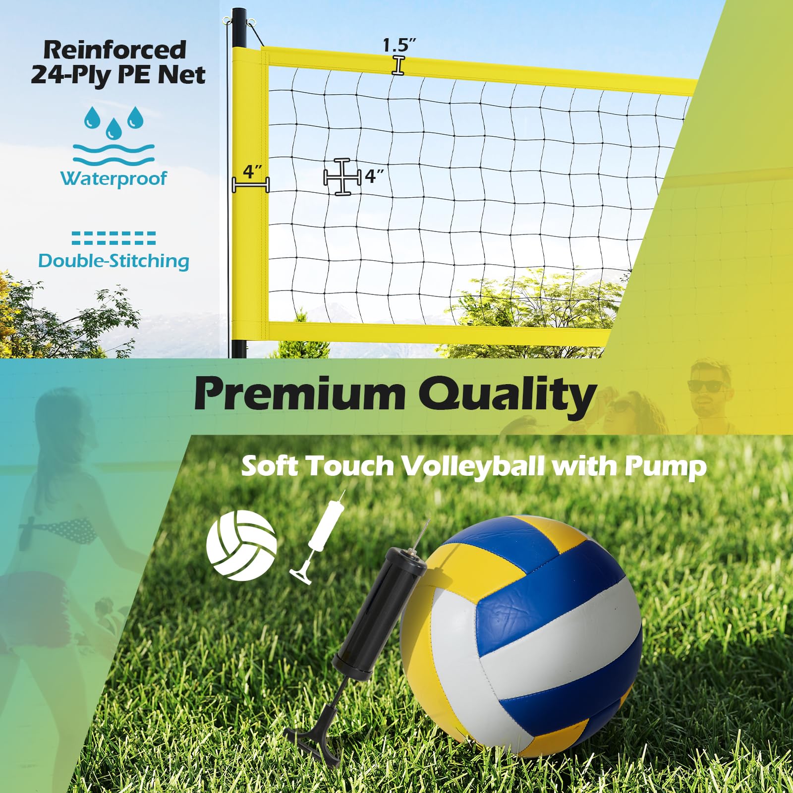 - Heavy-Duty Volleyball Net Set: GYMAX volley ball game set features waterproof 24-ply PE net with wide edge and double-stitching for all-weather durability. The powder-coated metal poles are designed to withstand sun, rain, and intense use, ensuring longevity season after season.