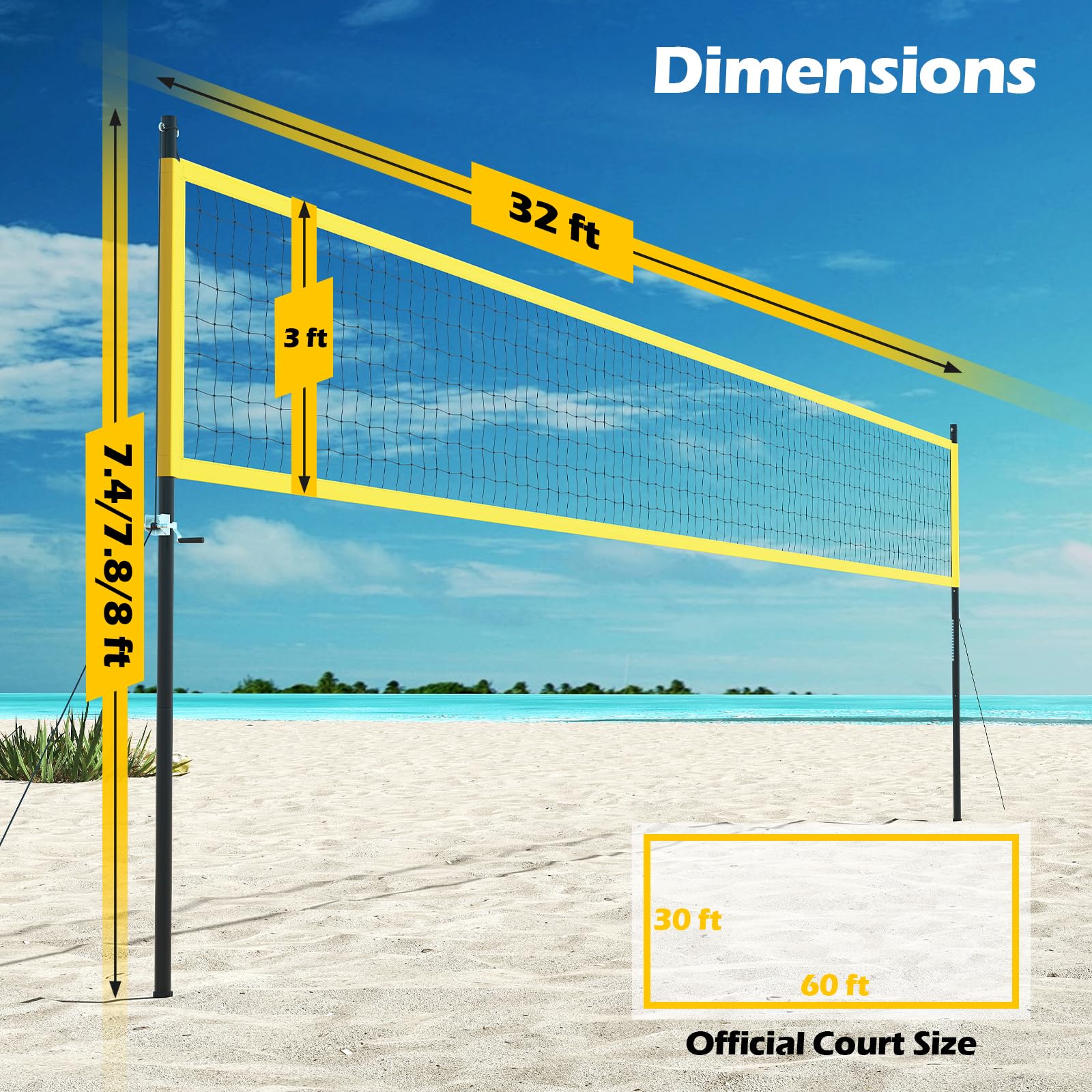 - Standard Size: Adjustable in 3 heights (7’4” official women/7’8” coed/8’ official men), this volleyball net would be a pro-level gear for your backyard battles. Meanwhile, the regulation-size 32' x 3' volleyball net, along with a 60' x 30' boundary line would offer an official court size.