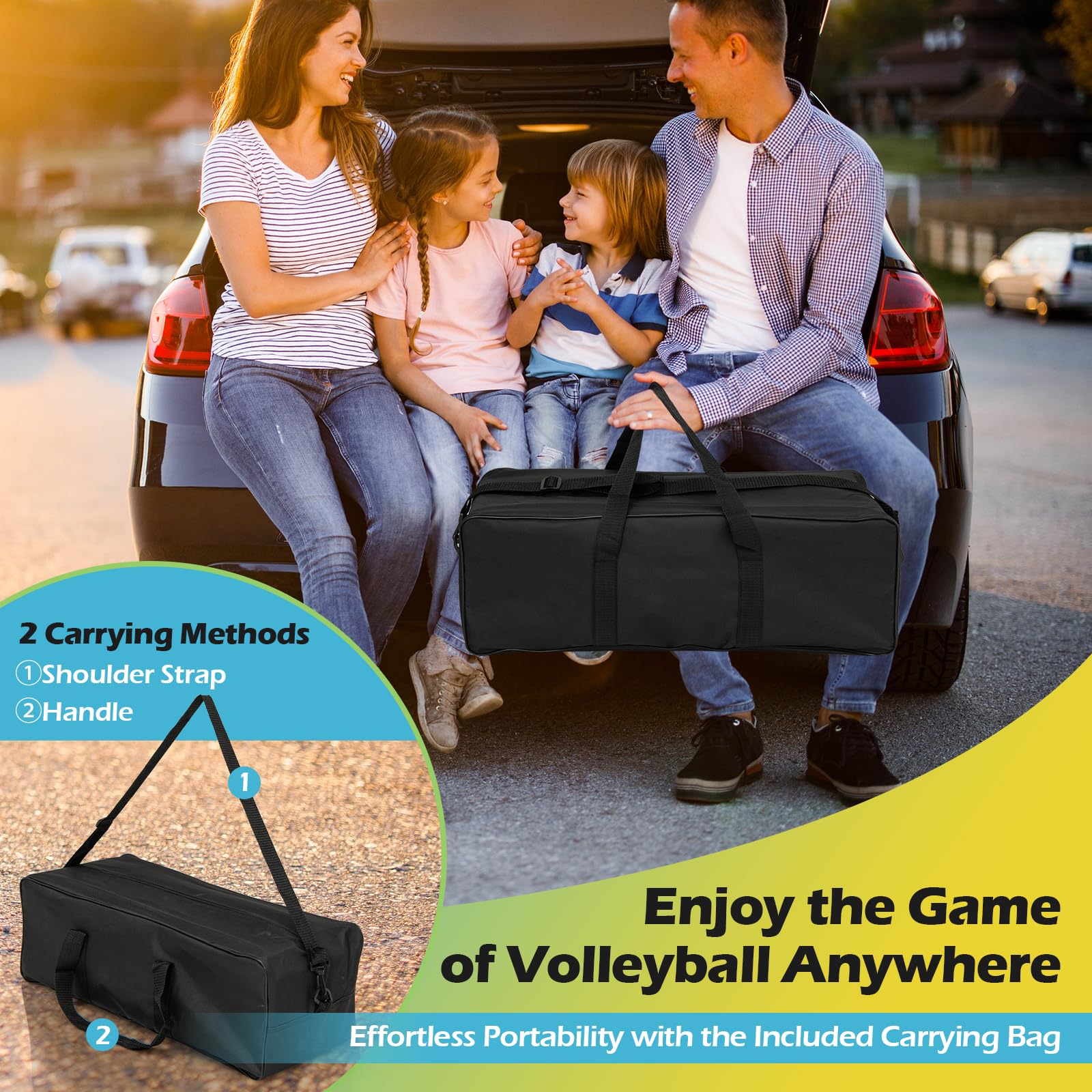 - Easy to Carry: The volleyball set comes with a convenient carrying bag, enabling you to set up a game at the beach, park, or in your yard effortlessly. The bag offers two carrying options, including a shoulder strap and a handle, for personalized and convenient transportation.