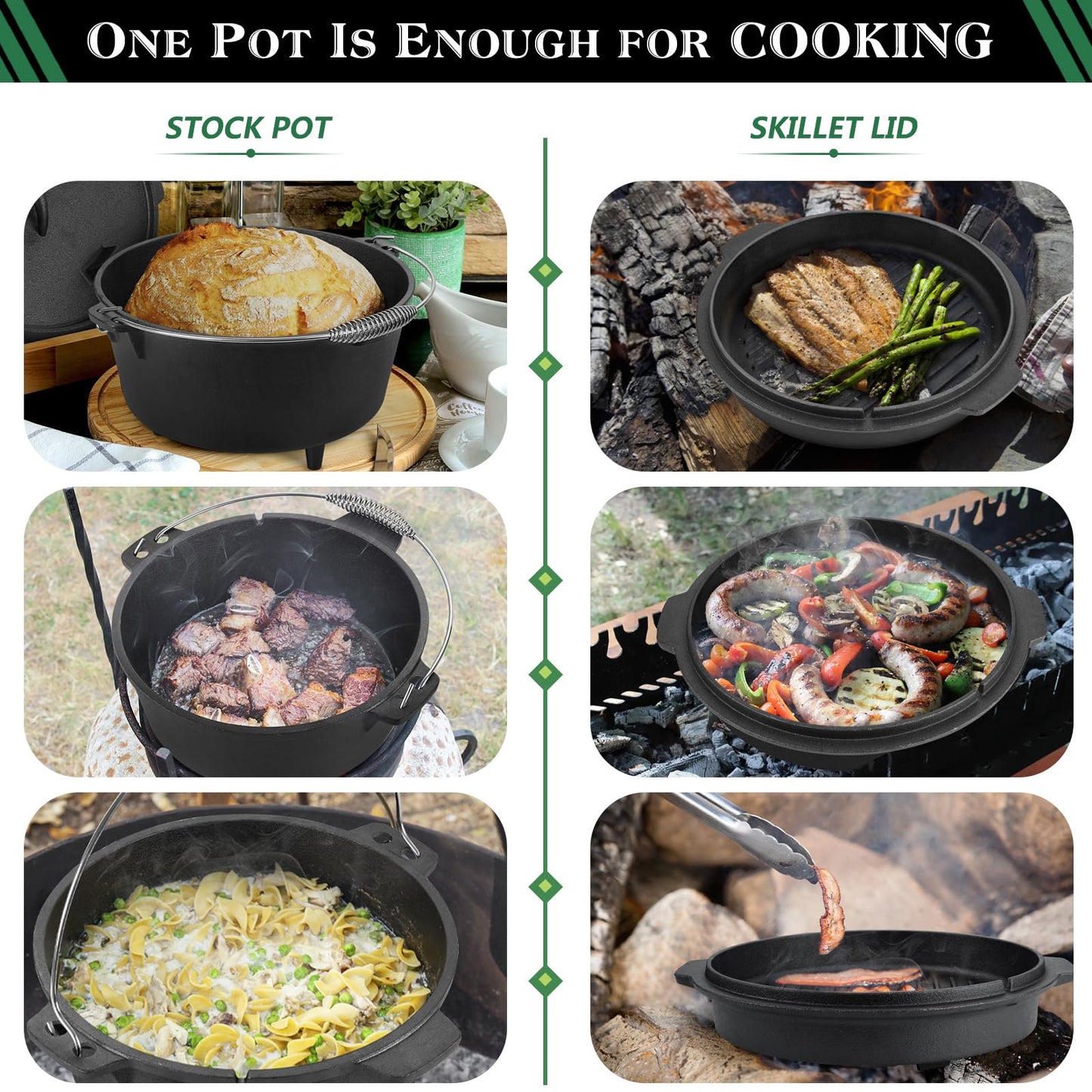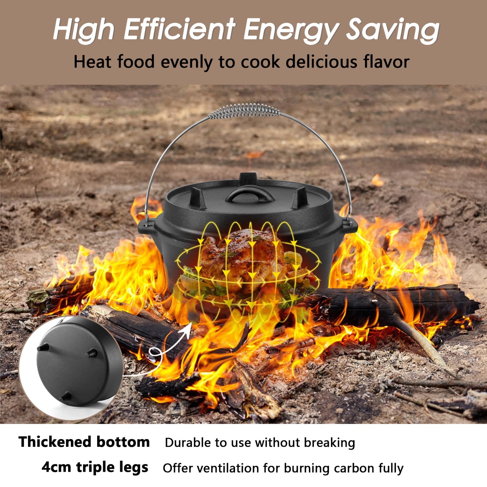 - [Features]: Cast iron’s great heat retention and heat conductivity are born to cook, won’t lose heat when you put some cold food on its surface, also can keep high temperature evenly on the inconsistent campfire, Dual side handles are connected by wire bail handle with bold hollow design for safe hanging, Both of the pot and the lid have 3 legs under bottom, provide ventilation for burning carbon fully, also allow more fuel under the bottom to offer more heat