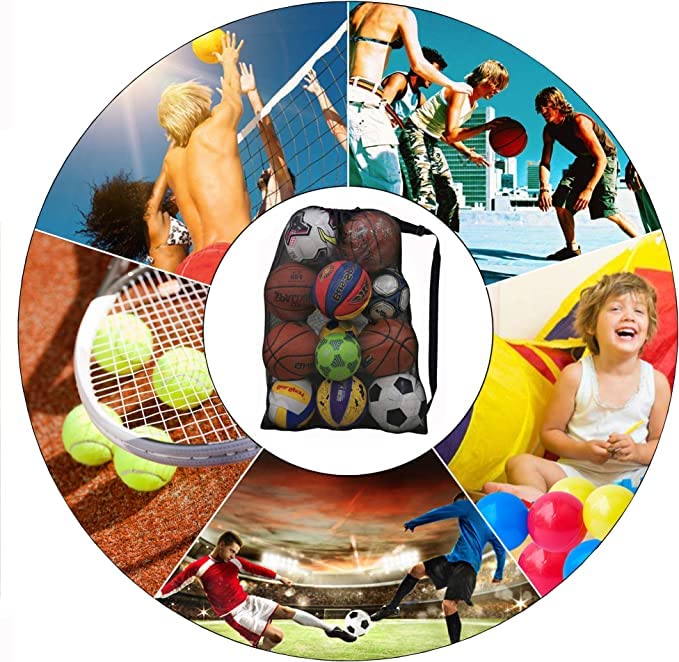 Details: Heavy Duty Mesh Bag Sturdy Drawstring Bags Extra Large Sports Equipment Team Work for Basketball, Soccer, Volleyball,and Swimming Gears with Adjustable Strap Size:30x40inches Color: Black Material:Polyester Mesh Closure: Drawstring Pack: one piece ball bag This Sports equipment ball bag is the professional choice of equipment bag for all your sports equipment bag needs. It is perfect as a basketball equipment bag for adults or a basketball equipment bag for kids. can be used for soccer basketball,yoga ball, volleyball training and diving goods, equipment storage. Noted: All balls displaying in pictures for illustration only, not with the item for sale.