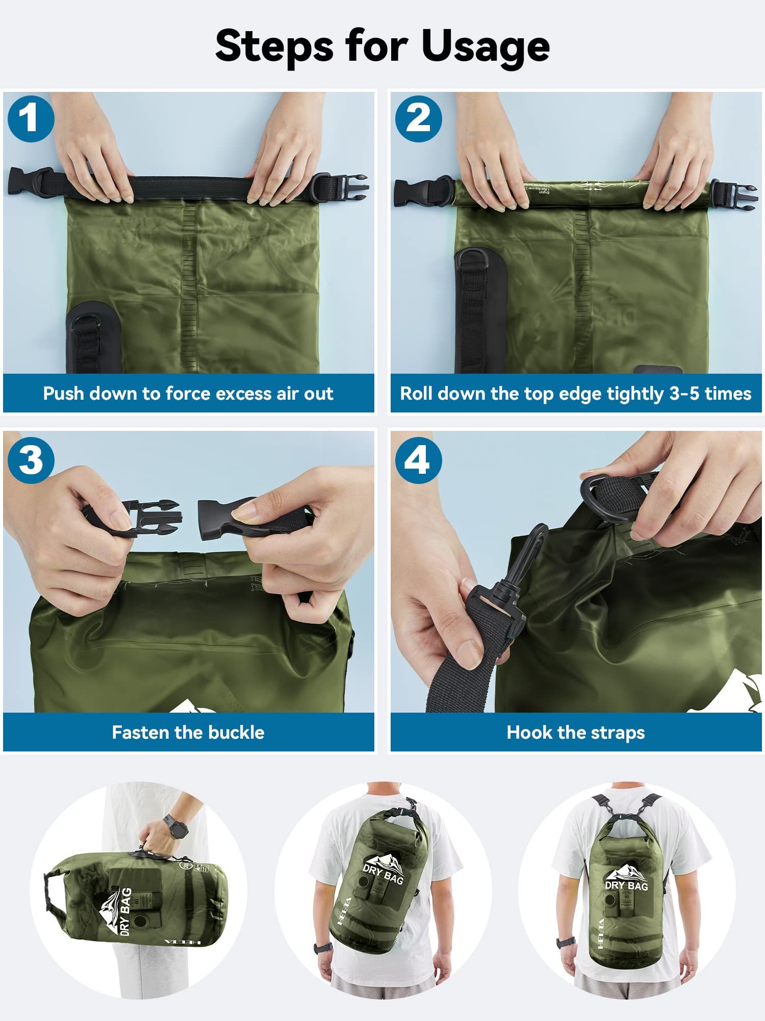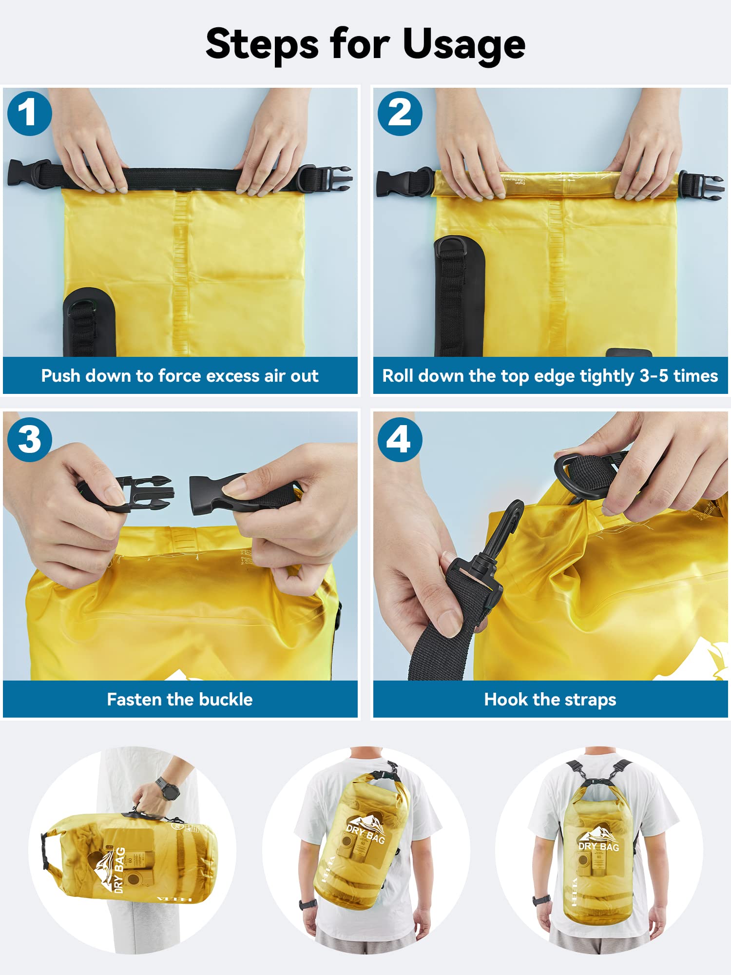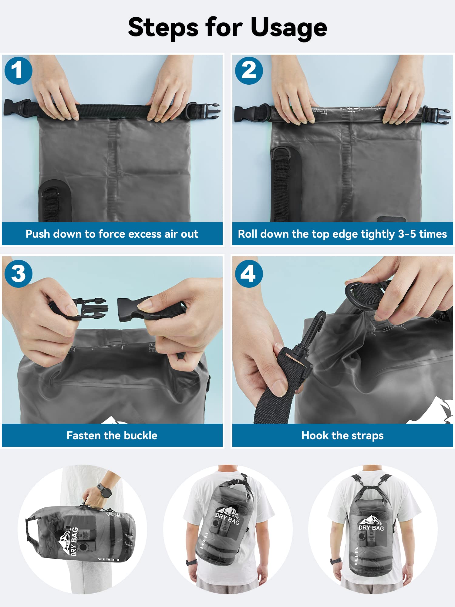 - 5 Sizes (5L/ 10L/ 20L/ 30L/ 40L) to choose - Great beach vacation and cruise ship essentials, a right choice for the gift to women and men, each bag comes with a free waterproof cell phone case, bring comprehensive waterproof protection to your water sports. You can control the size of the dry bag by the number of times you roll the top edge