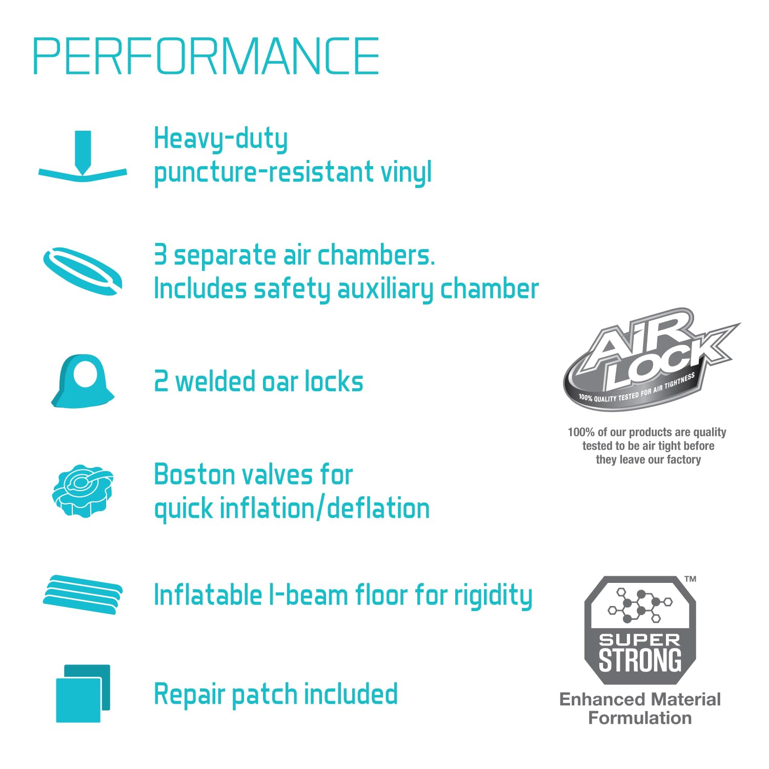 - TRIPLE AIR CHAMBERS – Three air chambers, including one inner auxillary chamber for added safety; inflation and deflation is made easy constructed with two quick-fill Boston valves to get you on the water faster
