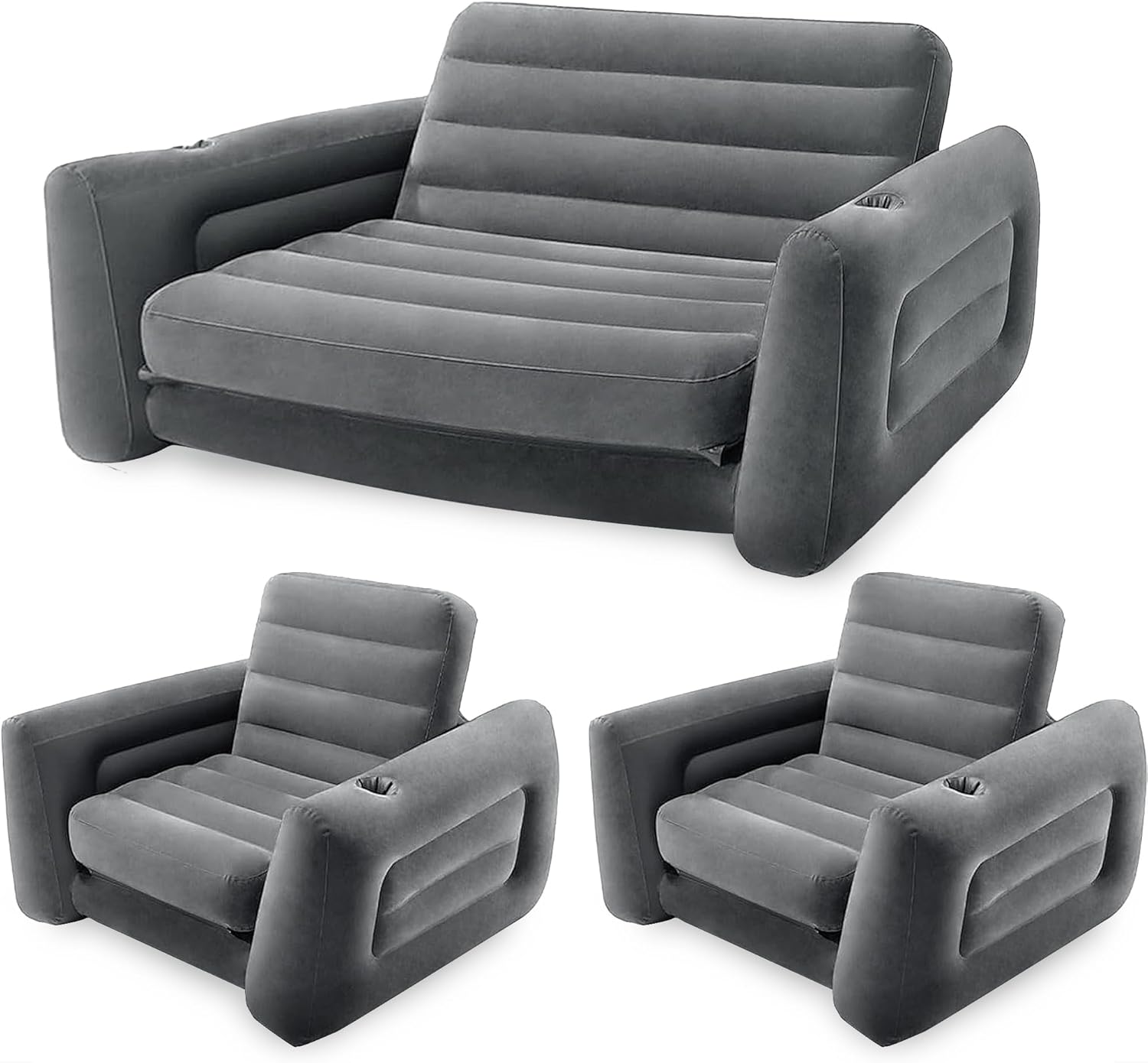 - INFLATABLE FURNITURE SET: Luxury inflatable furniture set includes a pull-out sofa that offers a comfortable sleeping solution and 2 sofa sleepers that both inflate within minutes (air pump sold separately)