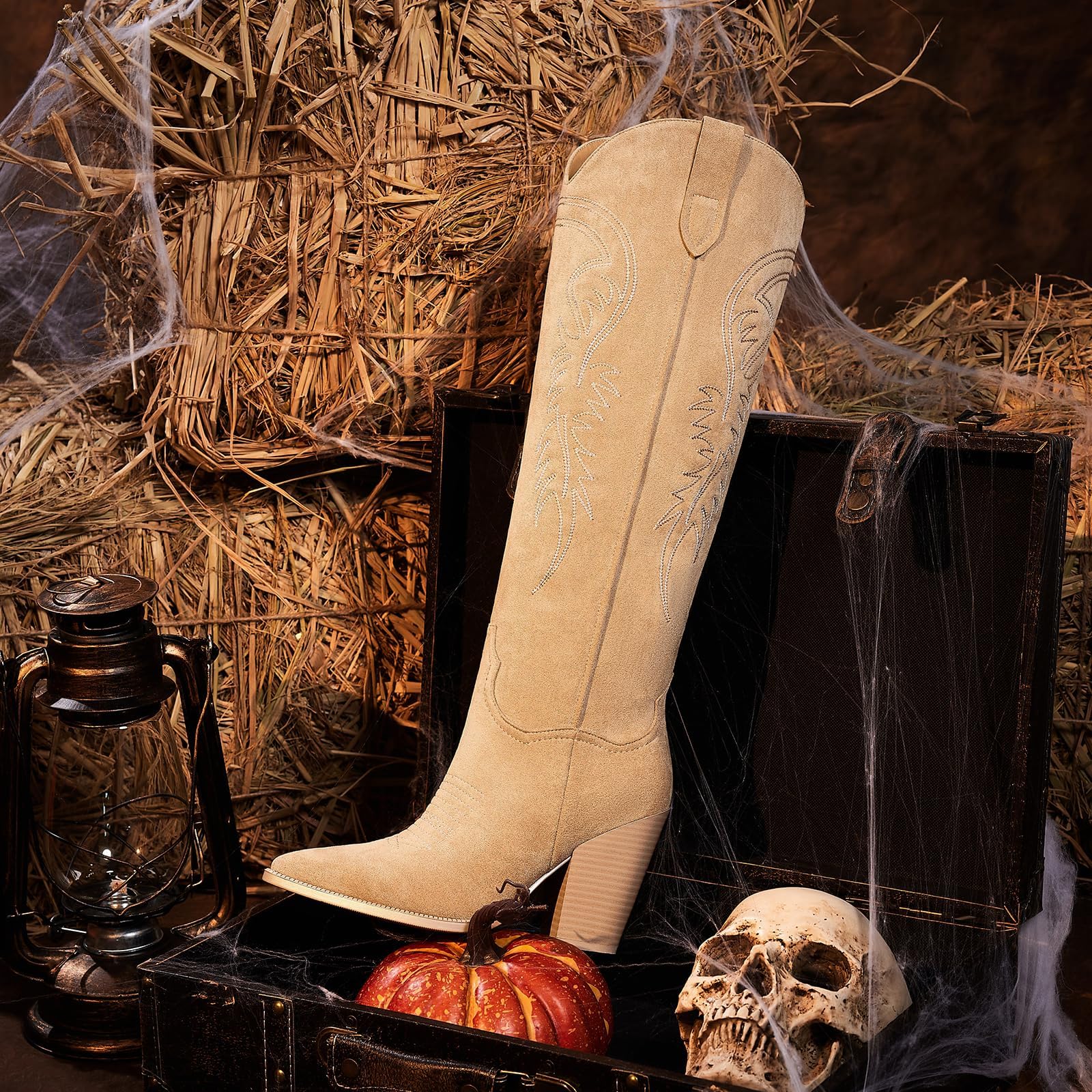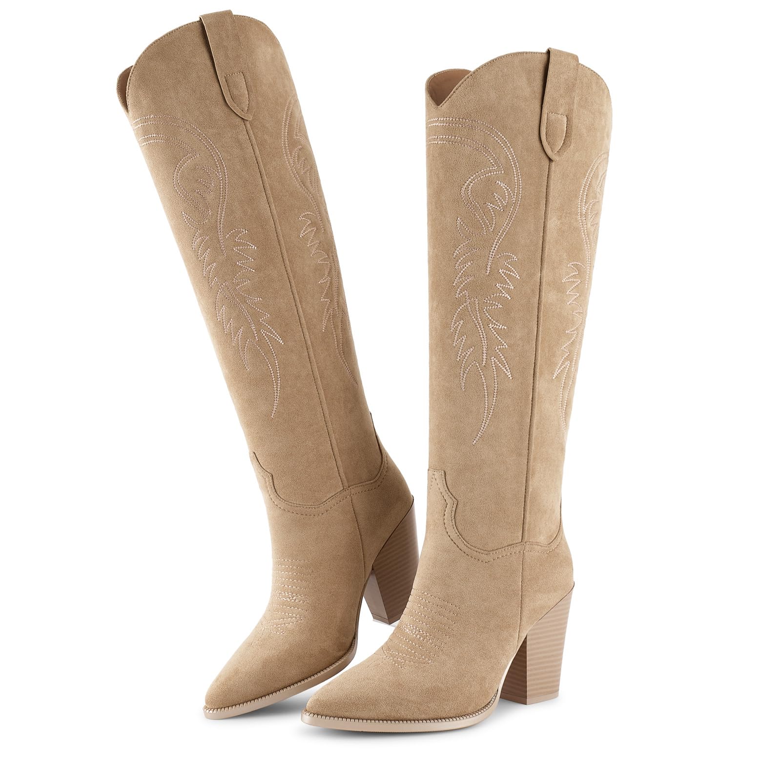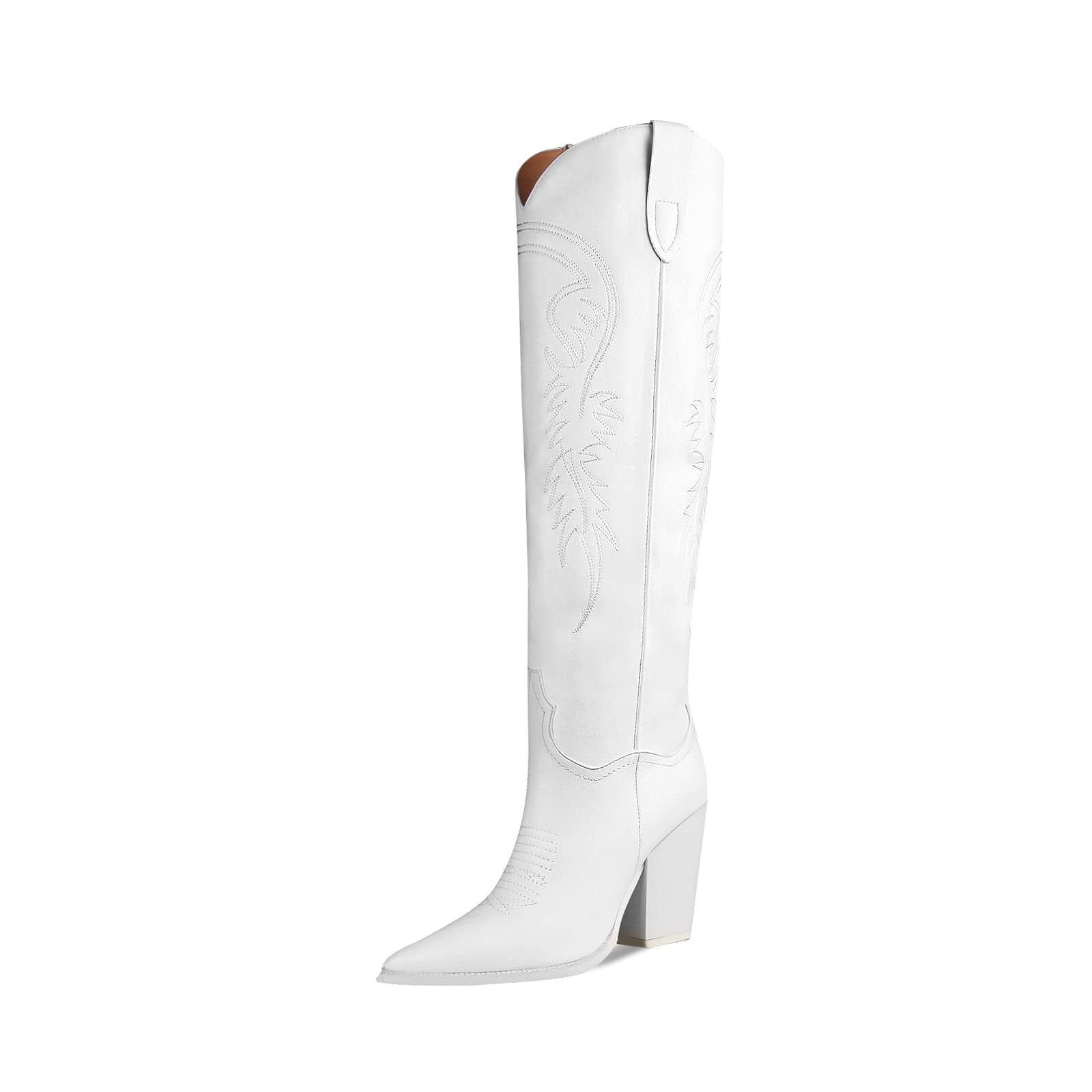 ISNOM Women's Cowgirl Boots Pull On Knee High Boots, Cowboy Western Embroidered Chunky Block Heel Pointed Toes Boots