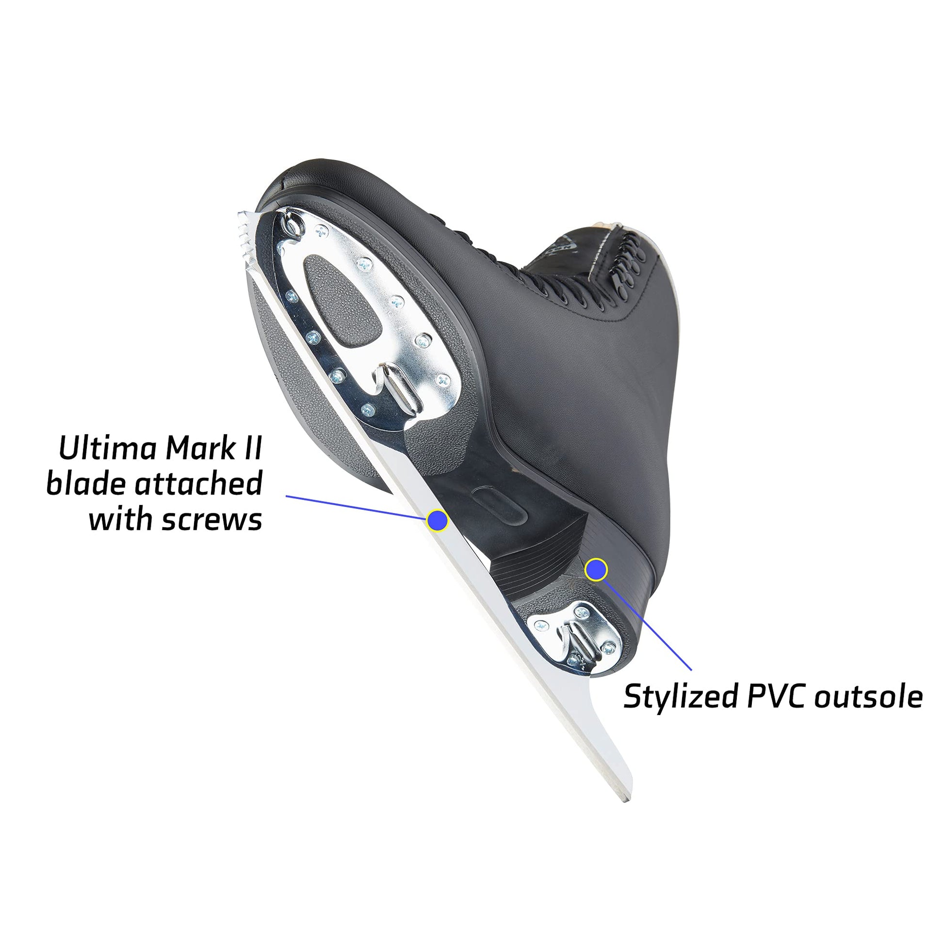 - Factory sharpened Ultima Mark II blade allows for use in learn to skate programs. Attached to PVC sole with screws.