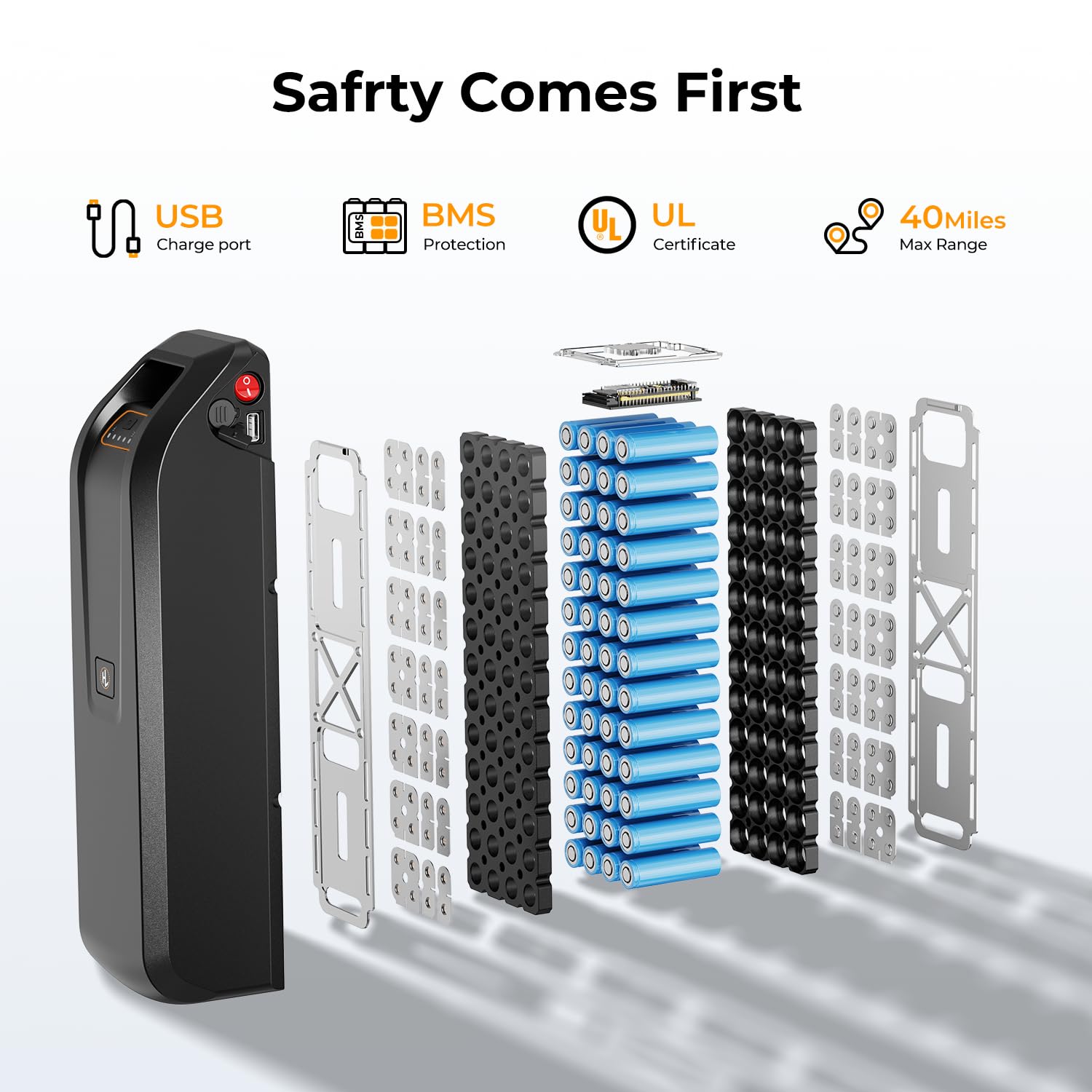- Removable Large Battery: The EB5 e-bike is equipped with a 360 Wh battery, which covers a range of up to 25-40 miles per charge for 5-6 hours so that it can meet travel or daily commute needs. Removable battery makes charging more convenient whether you are at home or in the office