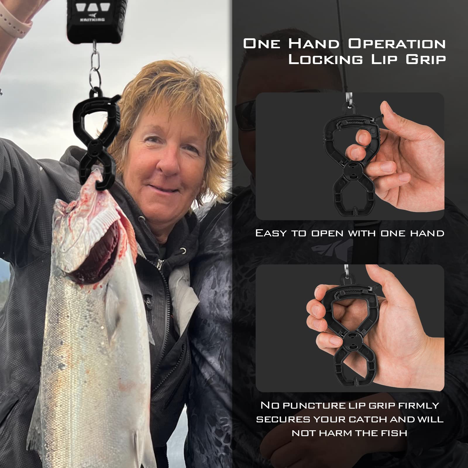 - No-Puncture Lip Grip (select models only) – Includes an easy-to-use a no-puncture lip grip for quick and easy weight measurements after landing your catch. This automatic locking lip grip is easy to use with one hand. Push up on the release lever to open the jaws and simply squeeze the top of the lip grip to lock the gripper onto your fish.