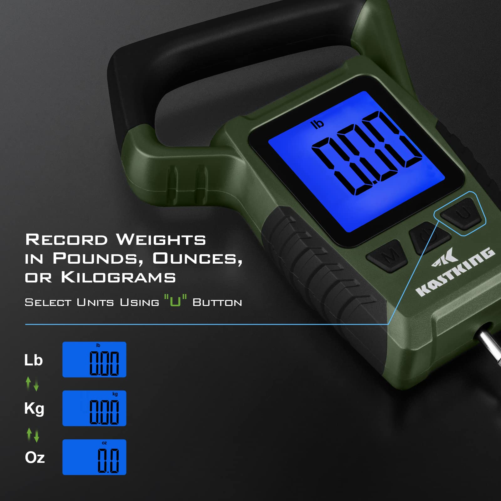 The KastKing WideView digital scale is accurate to 1/10th of a pound and includes a stainless-steel hook and an easy-to-use lip grip for weighing your catch. Accurately weigh fish up to 110 lbs. or 50 kg.