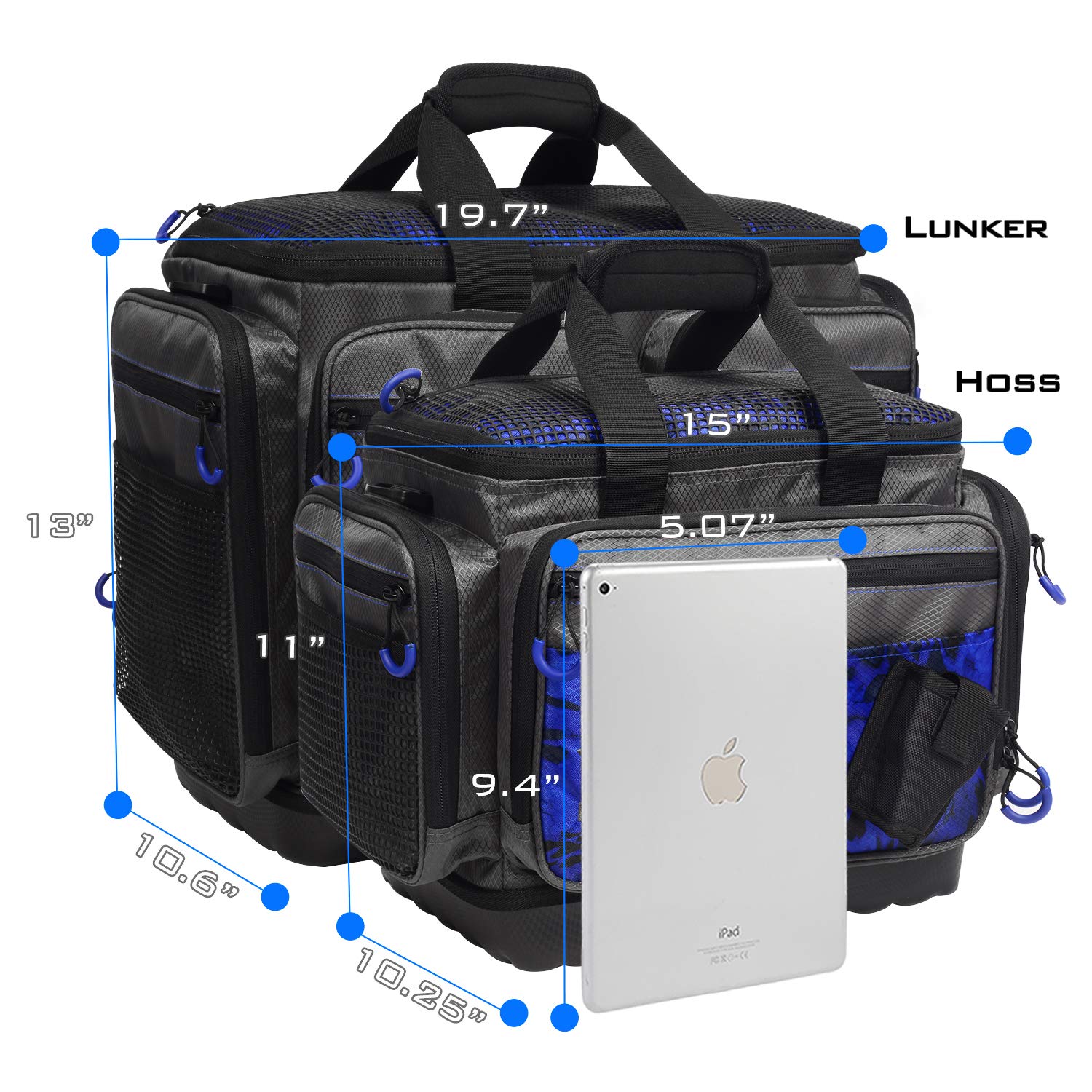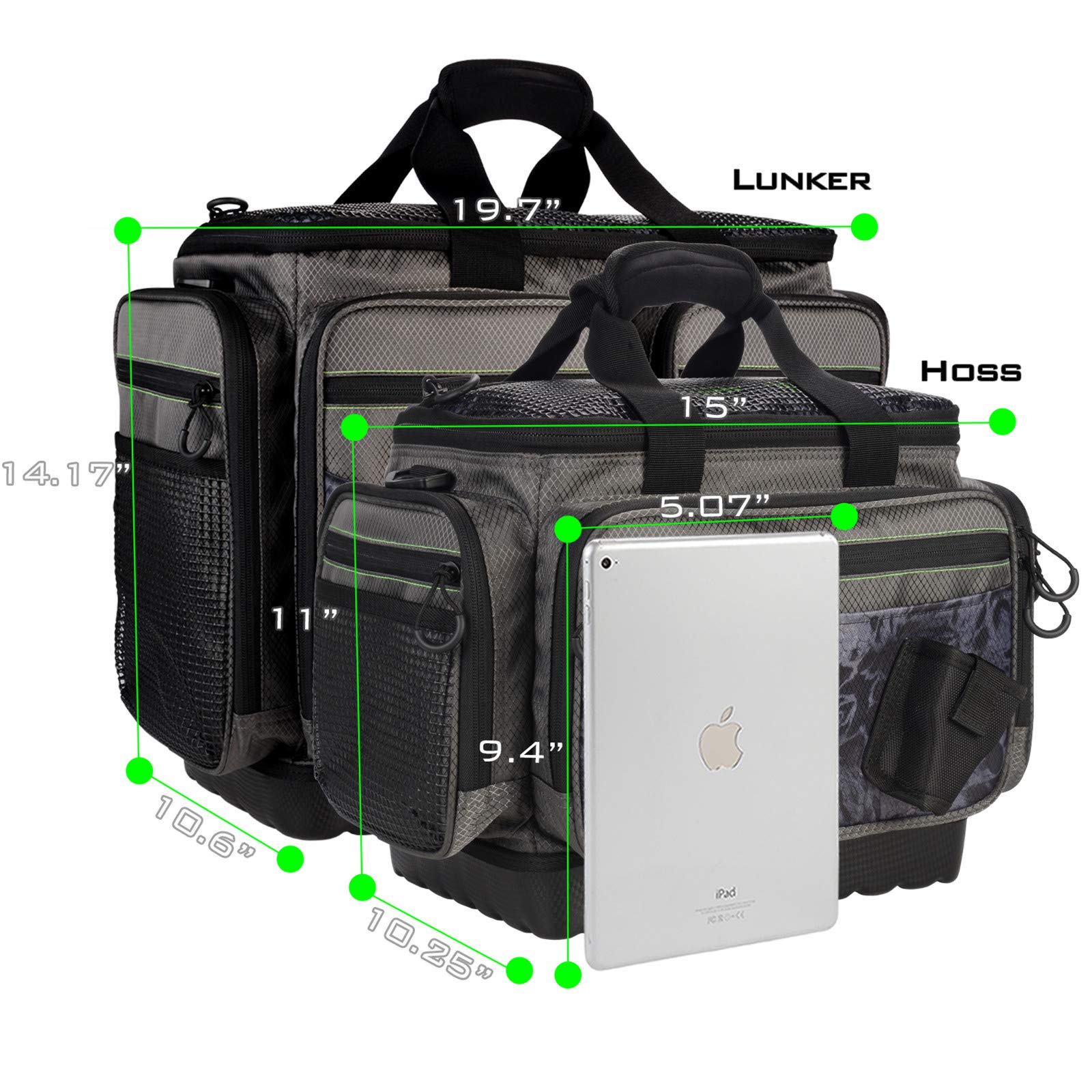 - COMFORT and STORAGE – The unique Neo-grip shoulder strap material grabs hold and won’t let go, the extra padding offers comfort for oversize loads. Unlike a hard fishing tackle box they are comfortable to carry. Best in class capacity! Load up your tackle trays with soft baits, fishing lures, crank baits, jigs, hooks, weights, terminal tackle and rigs. The Hawg can handle up to (12) 3700 trays in the large main compartment and (5) 3600 size trays in the front and side zippered pockets.