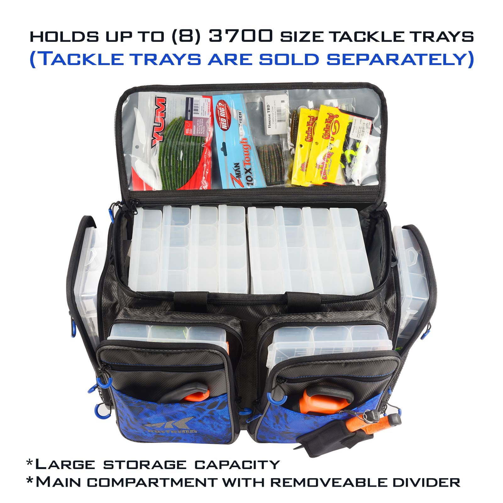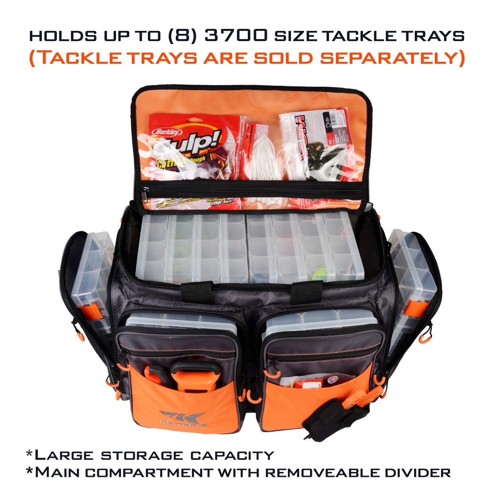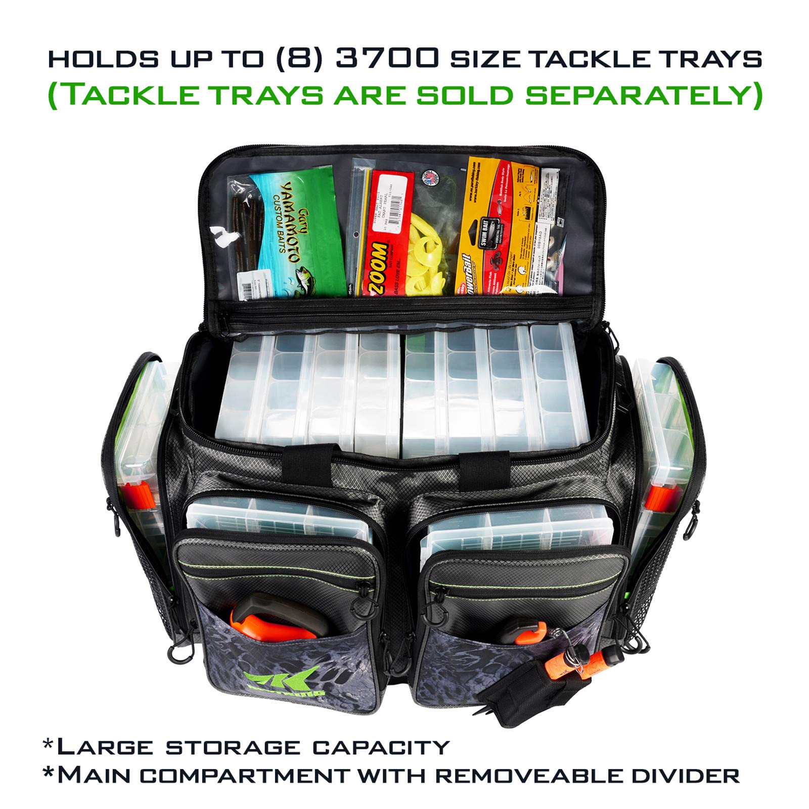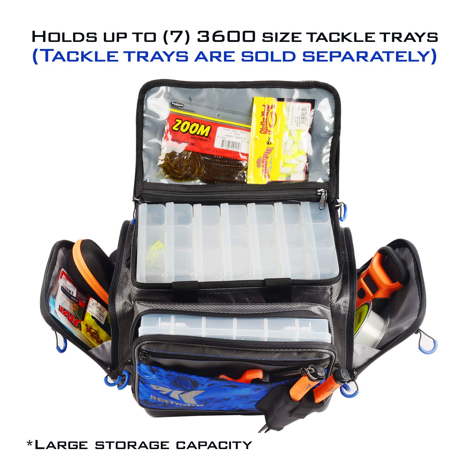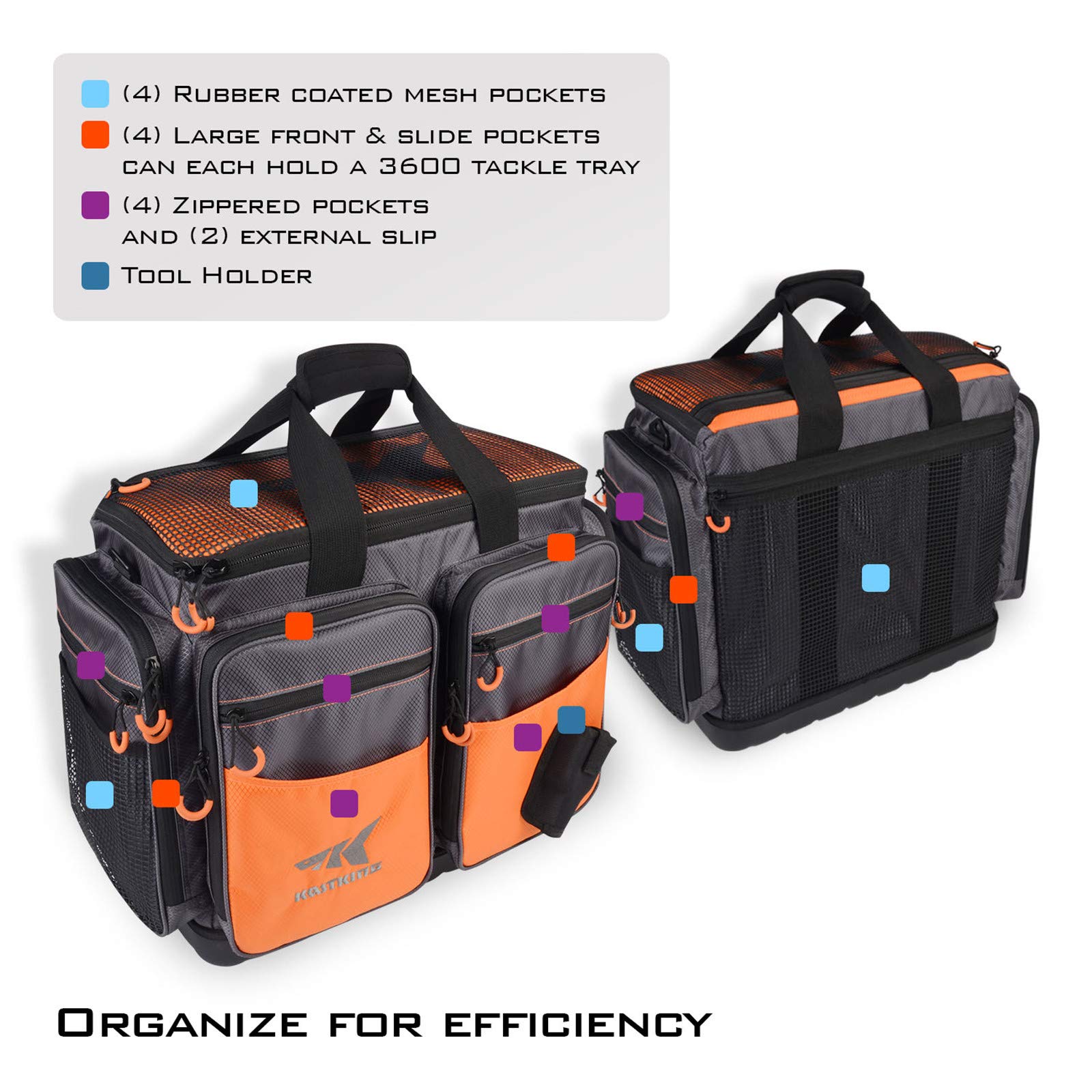 - ORGANIZE – The Hawg tackle bag is perfect for transporting fishing gear. A large main section holds (12) 3700 size tackle box trays (not included, but available separately from KastKing) and internal pockets store other items such as keys, wallet or phone. 12 external zippered and slip pockets provide storage for trays, terminal tackle, tools and more. External rubber coated mesh pockets can secure leader line, rain gear, pliers, or any other items for quick access.