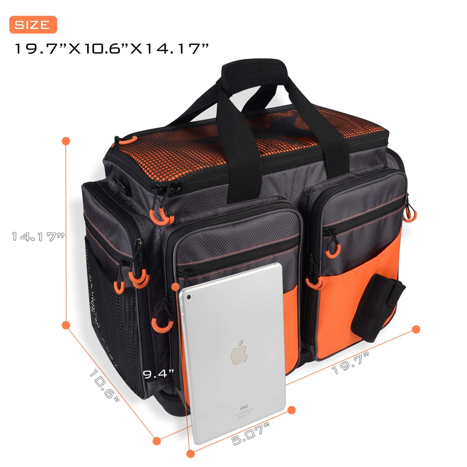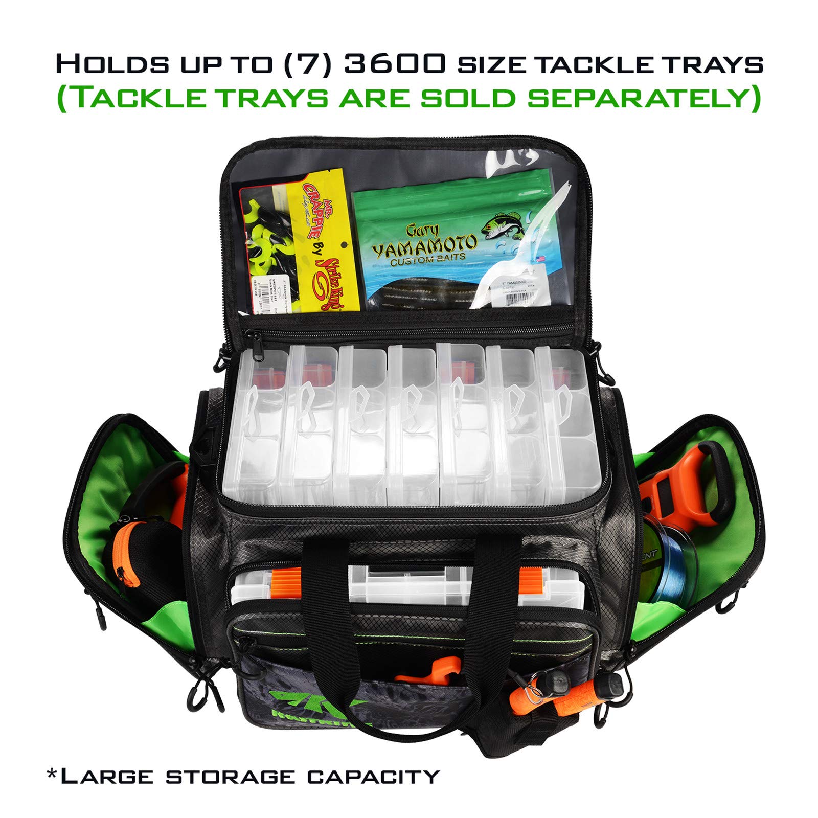 - KEY FEATURES - Store up to (12) 3700 and (5) 3600 size lure boxes with terminal tackle, fishing lures, and fishing tools - Super tough water resistant long-lasting 420D ripstop nylon material - 20 internal and external storage pockets for fishing tackle - Neo-grip anti-slip shoulder bag strap for comfort - Waterproof non-slip compression molded bottom - Resilient no rust, self-healing zippers - Tackle bag dimensions 26.4” x 11” x 15.4”