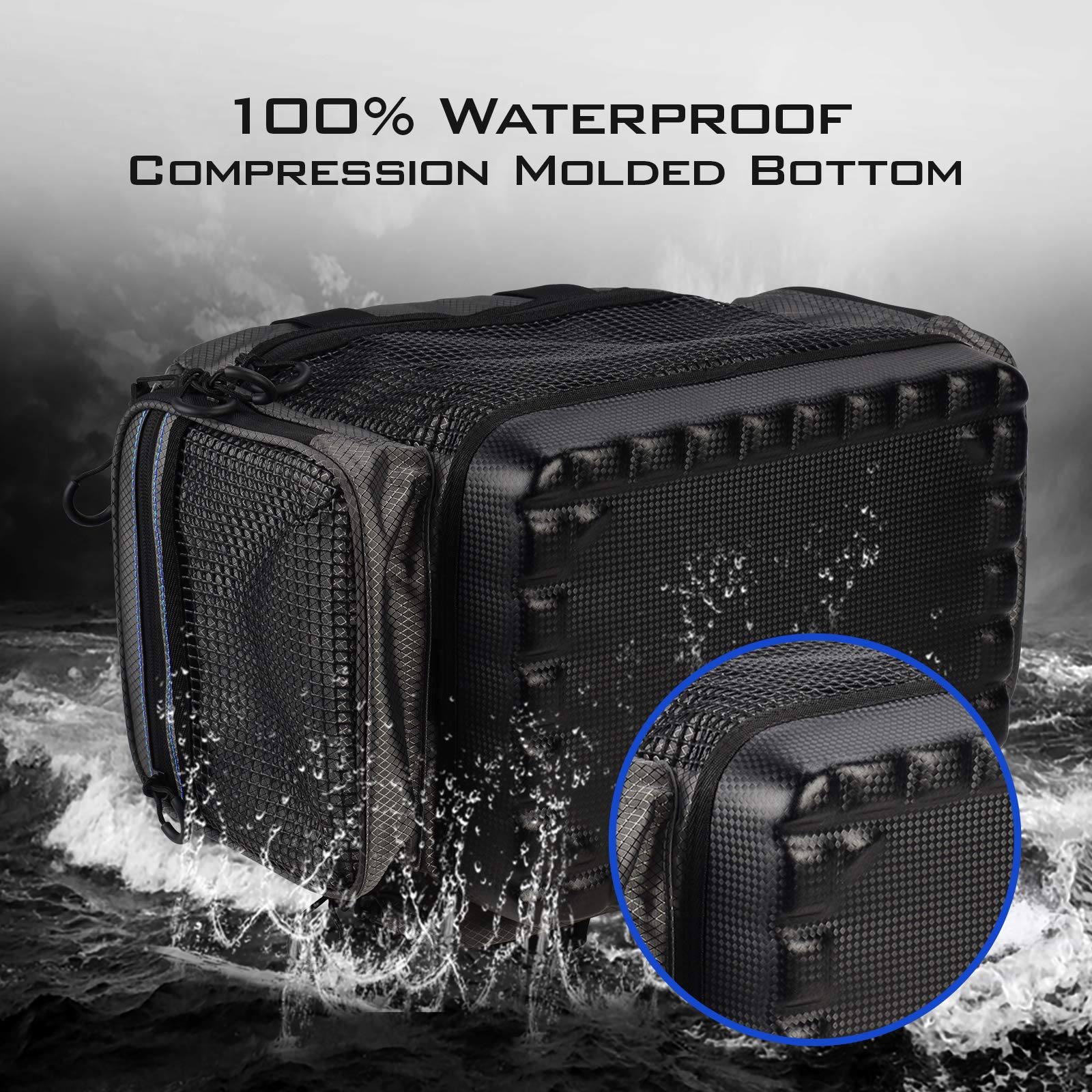 Like the bottom of a hard fishing tackle box, its compression molded bottom is 100% waterproof to ensure your gear stays dry even in standing water and tacky feet grip any surface to ensure your bag isn’t sliding around inside your boat.