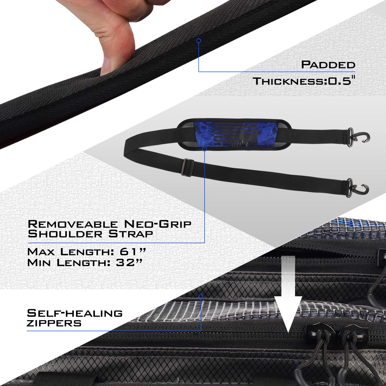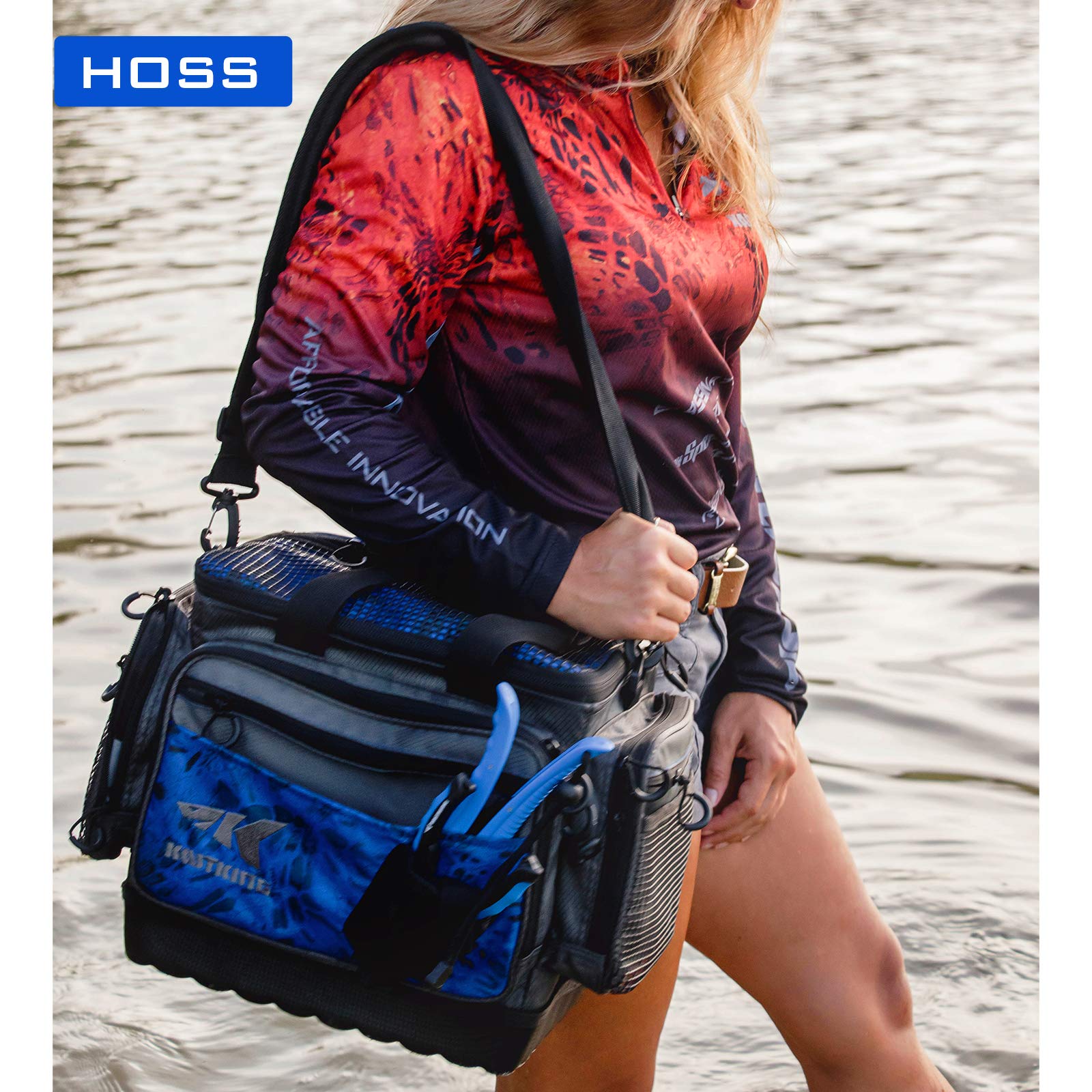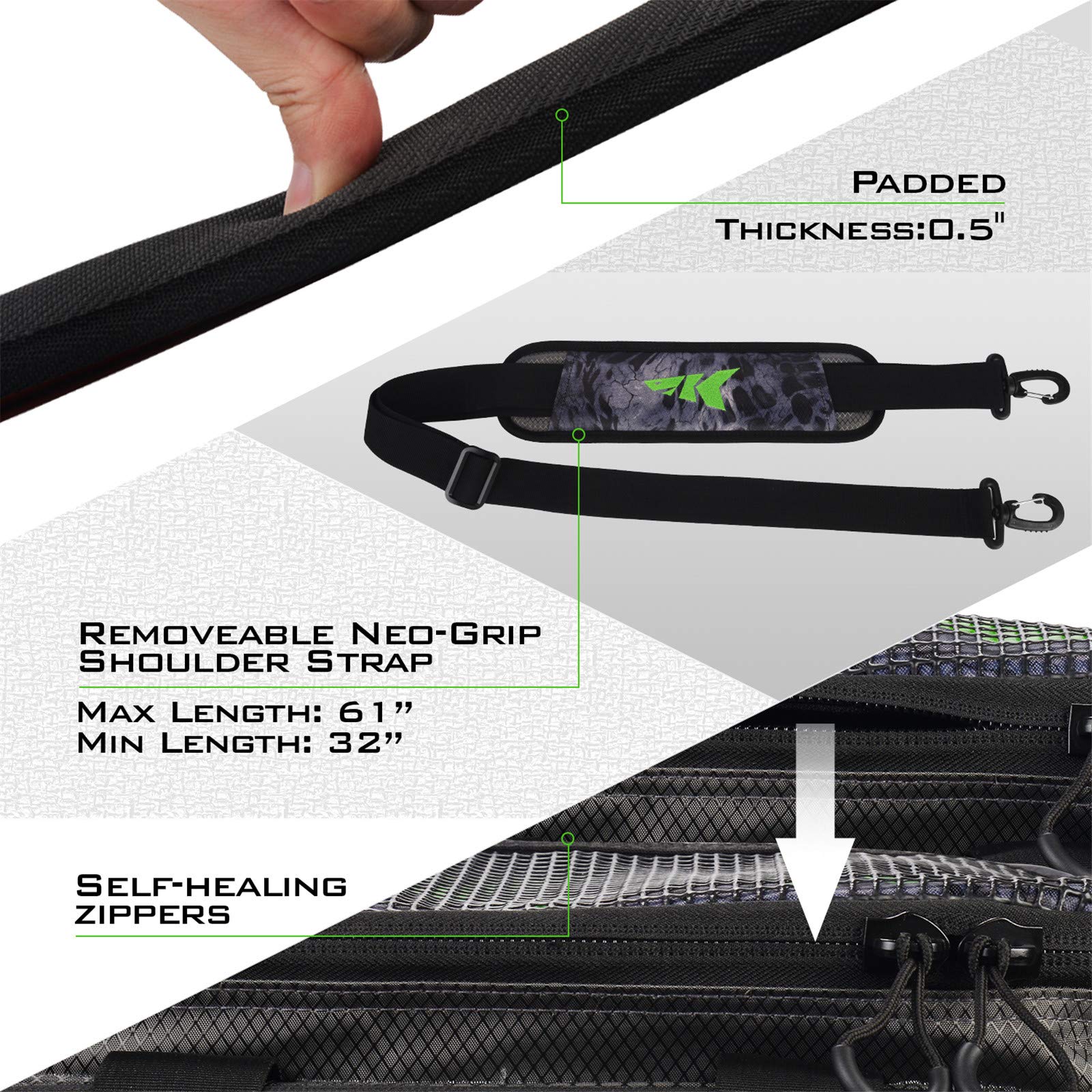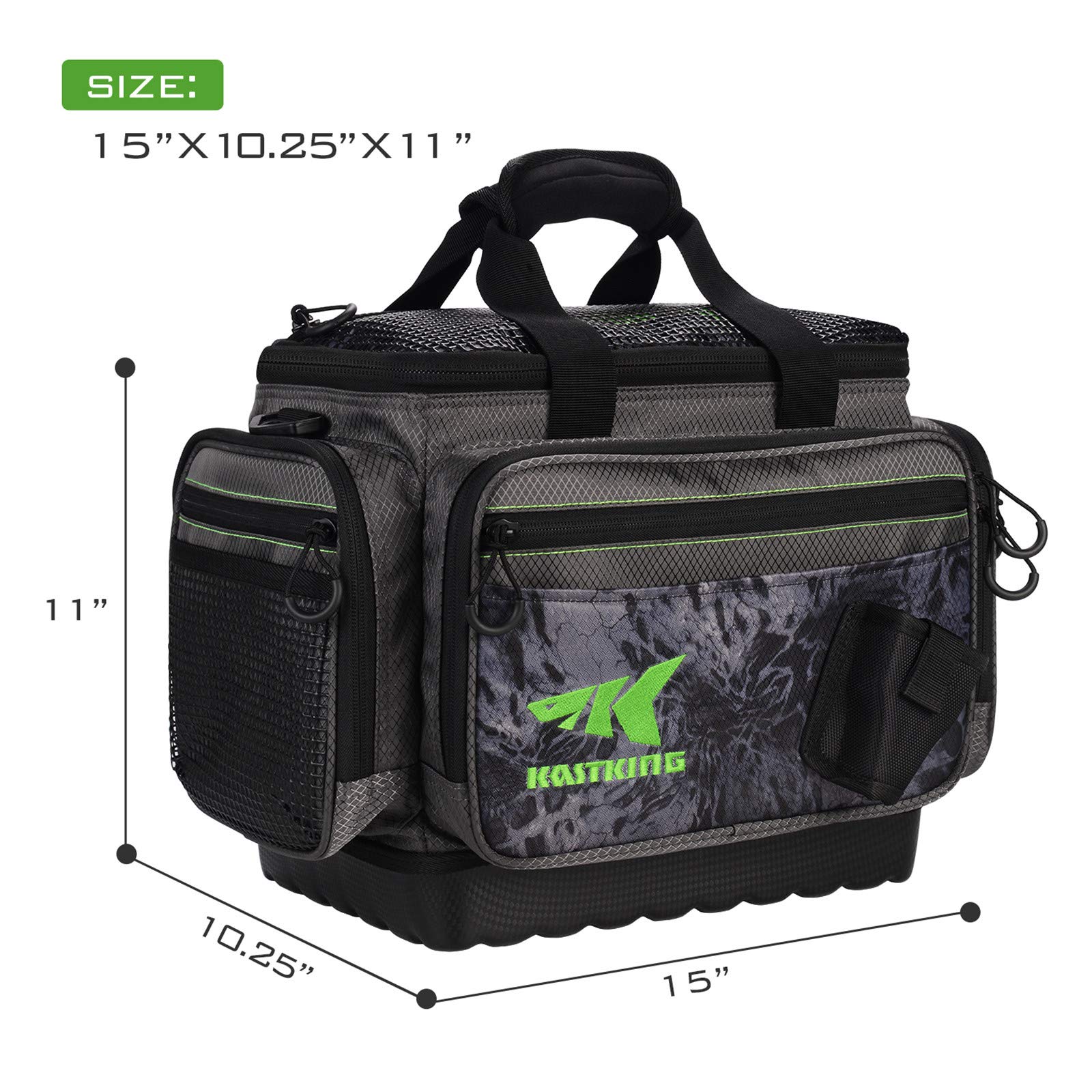 - TOUGH and WATER RESISTANT – KastKing Hawg soft tackle bags are made from tough 420D rip-stop nylon material for exceptional long term performance and reliability. A hydrophobic coating sheds moisture from the outside and an inner PVC layer provide double protection to ensure your fishing tackle is protected from damage and the elements. KastKing’s compression molded waterproof bottom repels standing water and the tacky material grips any surface to ensure the bag doesn’t slide.