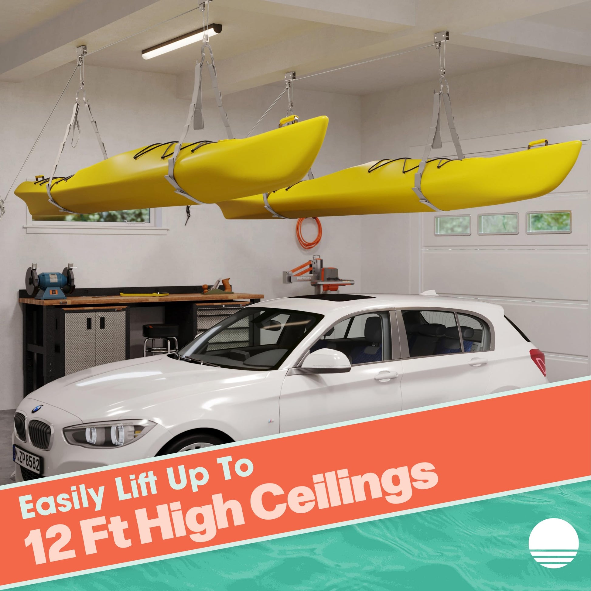 - ►INDOOR USE - For indoor ceilings up to 12 ft. high. Once the kayak is out of the way you free up so much floor space you won't know what to do with it all.