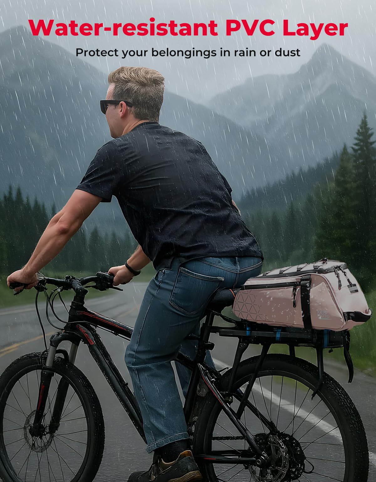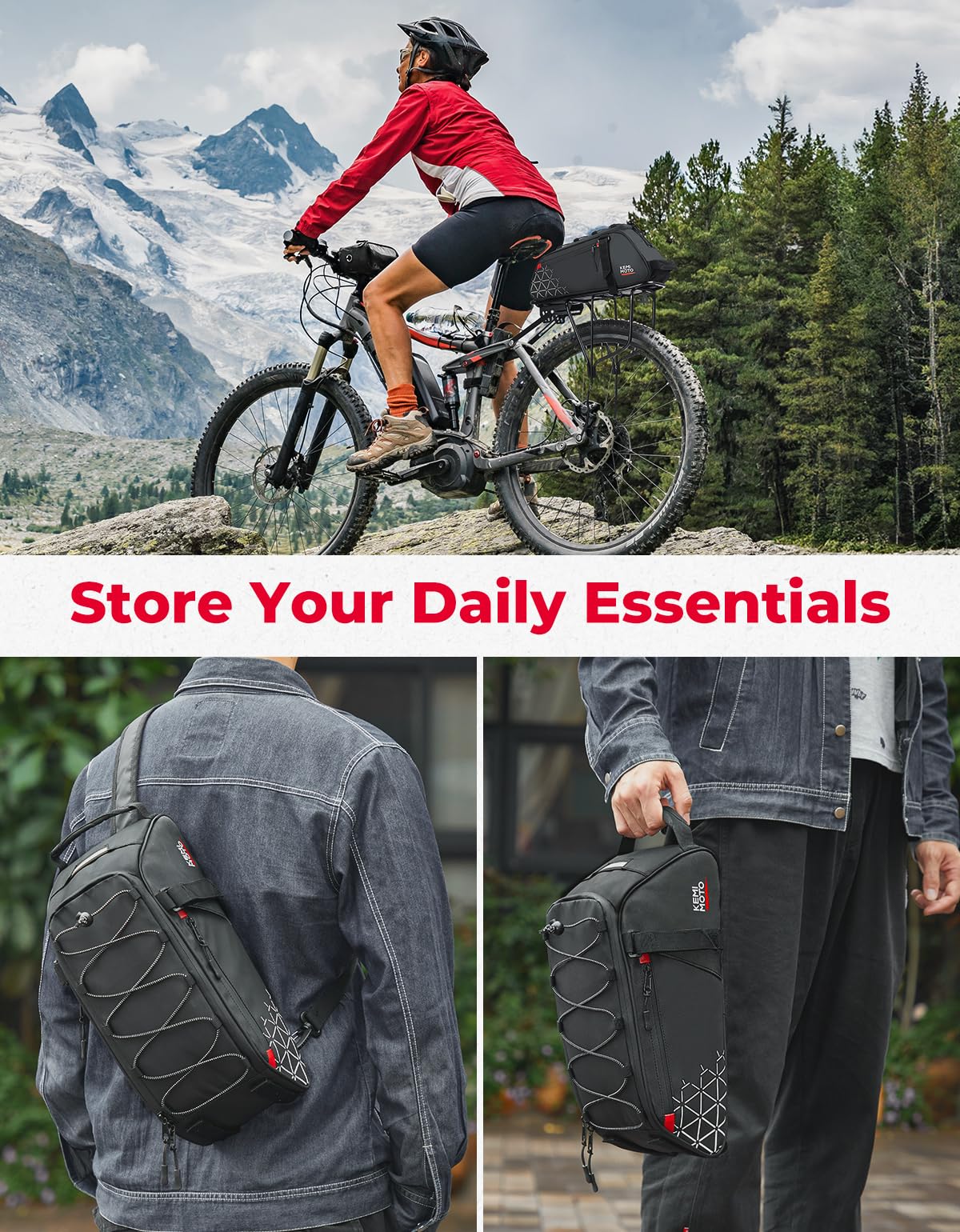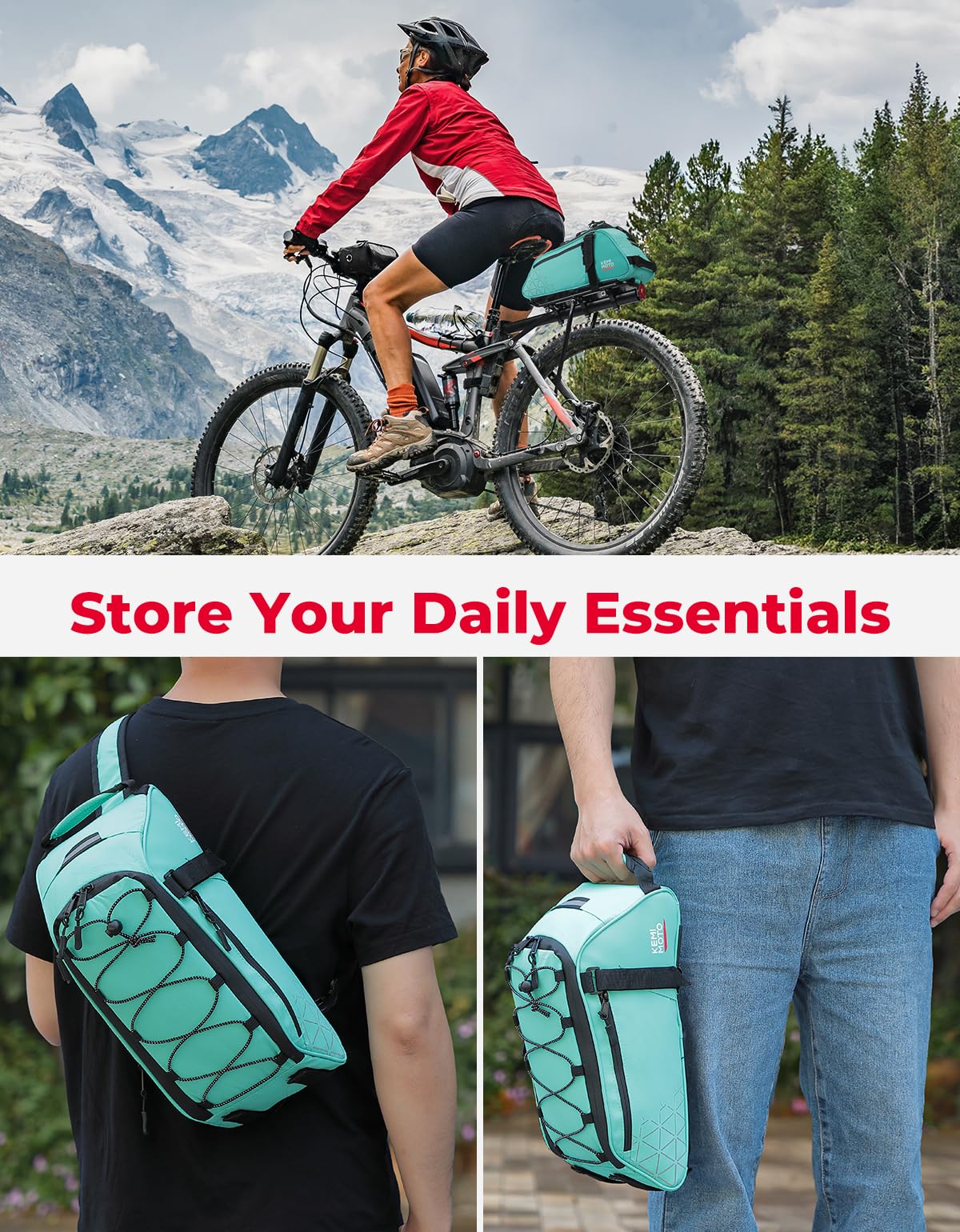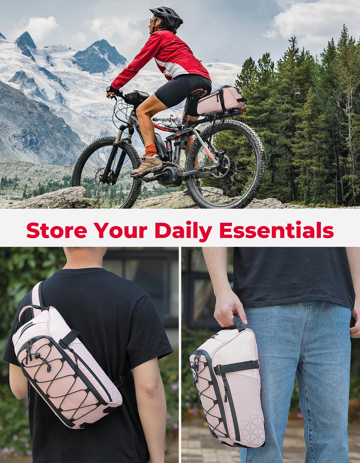 - 3-in-1 Bike Rack Bag: The bike rear rack bag comes with hand straps and a simple shoulder strap, allowing it to transform into a crossbody bag, handbag, or ebike bag for various situations. Its portable design makes carrying easy when you're not riding. Beyond cycling, this versatile pannier bag is perfect for travel, camping, picnics, and other outdoor activities, making it an essential companion for all your adventures