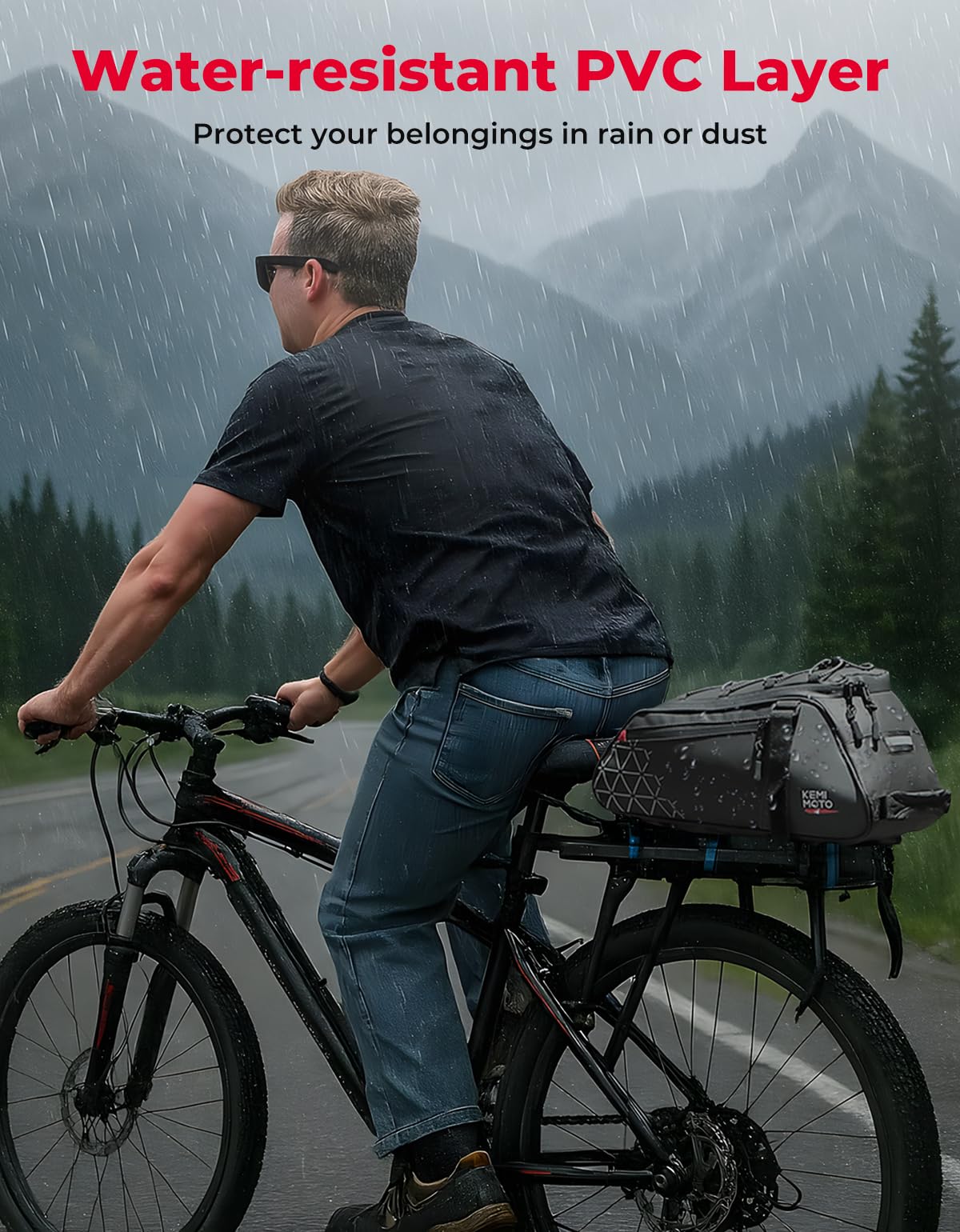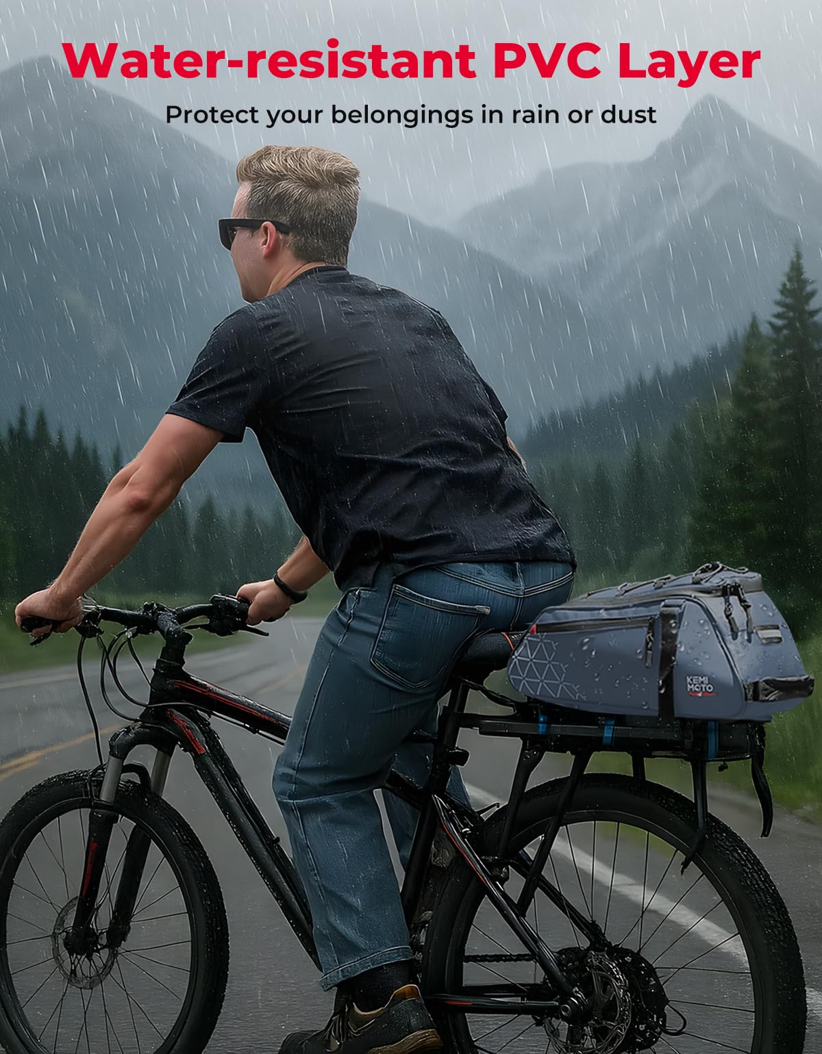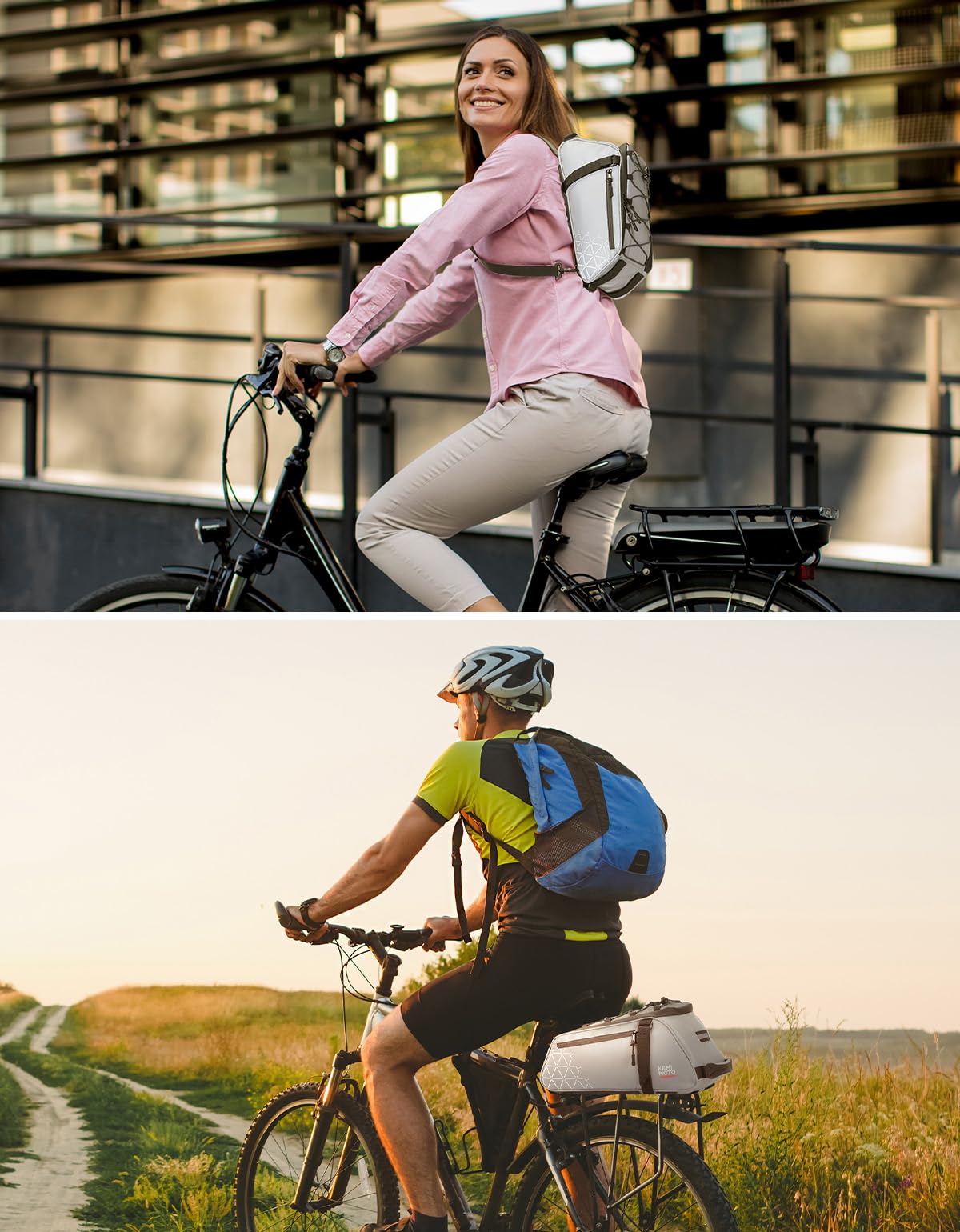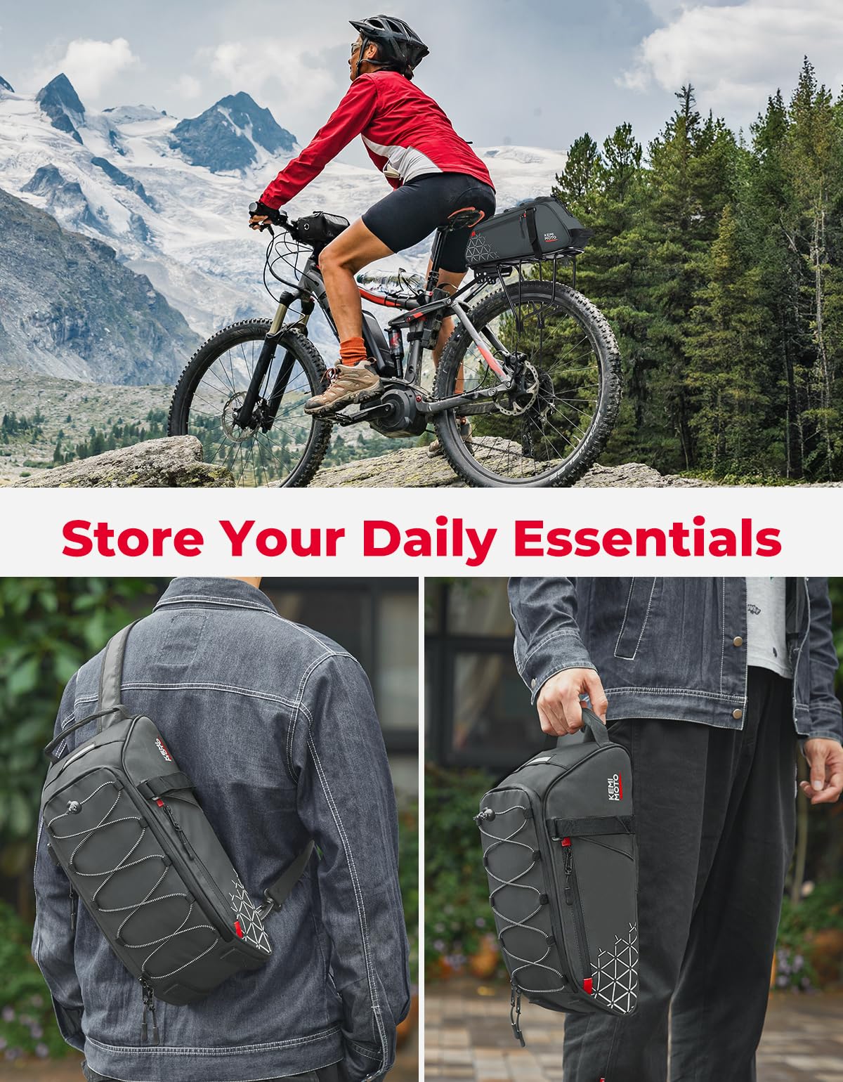 - 3-in-1 Bike Rack Bag: The bike rear rack bag comes with hand straps and a simple shoulder strap, allowing it to transform into a crossbody bag, handbag, or ebike bag for various situations. Its portable design makes carrying easy when you're not riding. Beyond cycling, this versatile pannier bag is perfect for travel, camping, picnics, and other outdoor activities, making it an essential companion for all your adventures