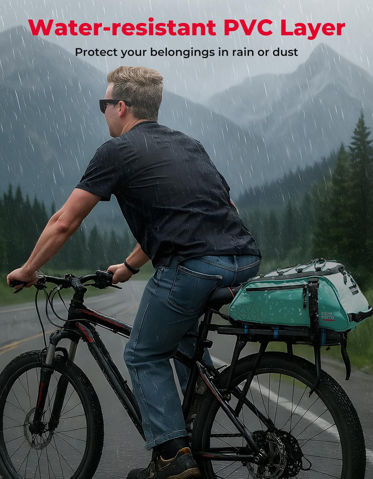 - Water Resistant: The bike rear rack bag is made of water-resistant smooth PVC oxford and leather fabric. However, the seams are not water-resistant. Avoid prolonged outdoor exposure to rain and direct sunlight when not in use