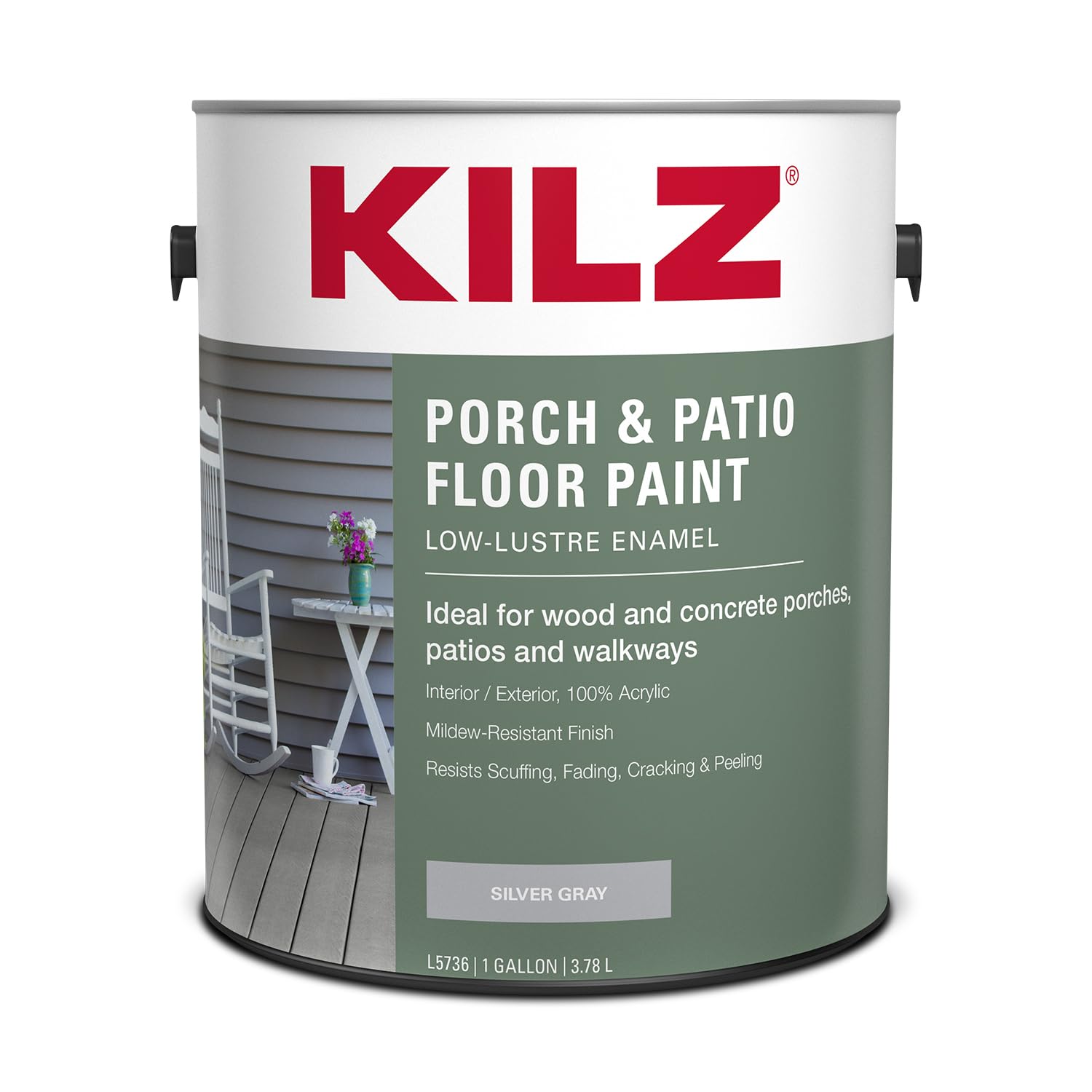 A good porch and patio floor paint is highly durable, easy to clean and resistant to scuffing, fading, cracking and peeling in variable conditions. This acrylic paint offers a low-lustre enamel surface that is formulated to endure on deck, porch, and patio siding and floors through variable weather conditions. Appropriate for all previously primed or painted surfaces including wood and masonry. It also can be used on trim, siding and trellises. KILZ enamel floor paint delivers a low-upstream finish that applies smoothly and evenly surfaces in Slate Gray. Dries to touch in 1 hour. Recoat in 4-6 hours. This is a 1-Gallon can of KILZ enamel porch and patio latex paint in Slate Gray with a low-lustre finish.