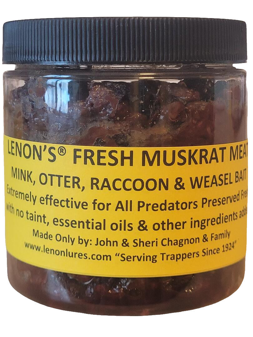 Lenon Lures® Fresh Preserved Muskrat Meat Bait Especially for trapping Weasel, Mink & Otter. Our process for putting up this bait will keep the bait smelling fresh when Mr. Mink or Weasel visits your set. The odor of fresh muskrat meat is attractive to all canine furbearing animals. This bait contains odors not to be found in any other other bait on the market.