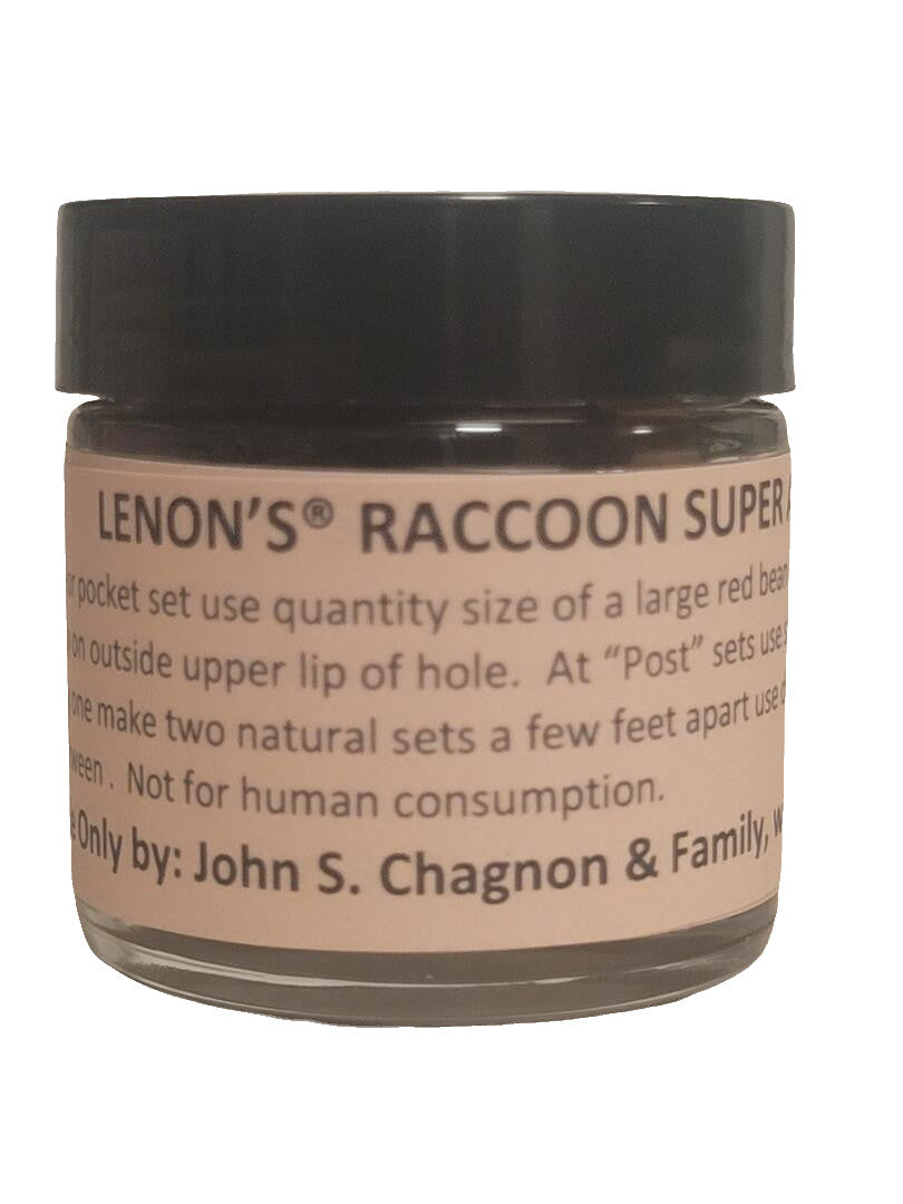Instructions for using Lenon's Raccoon Super All Call Lure - At hole or pocket set use quantity size of a large red bean down the hole, same quantity on outside upper lip of hole. At "Post" sets use same quantity. For Trap shy one make two natural sets a few feet apart use double the amount half way between them.