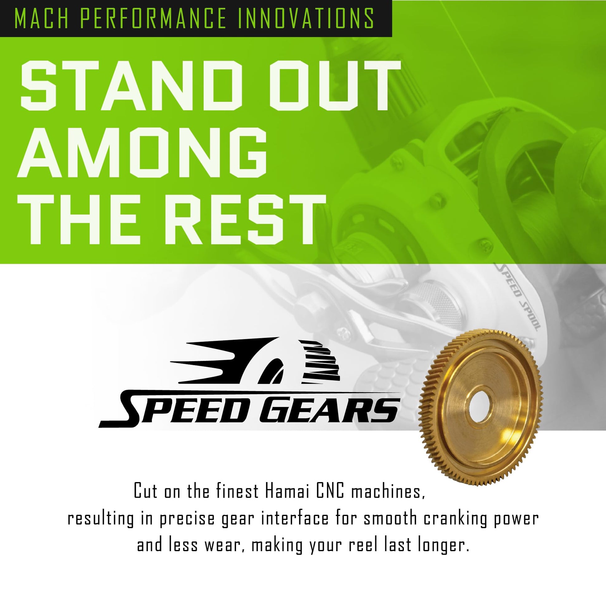 - HEAVY-DUTY REEL CONSTRUCTION: Built with a tough one-piece graphite frame and side plates, and an 8-bearing system featuring stainless steel double shielded ball bearings, the MACH Smash boasts a durable, sturdy build with extended gear life. The skeletal graphite rotor paired with solid brass precision cut Speed Gears offer a smooth, consistent retrieve in all conditions. The 2nd Generation of the MACH Smash is ready for anything thrown at it.
