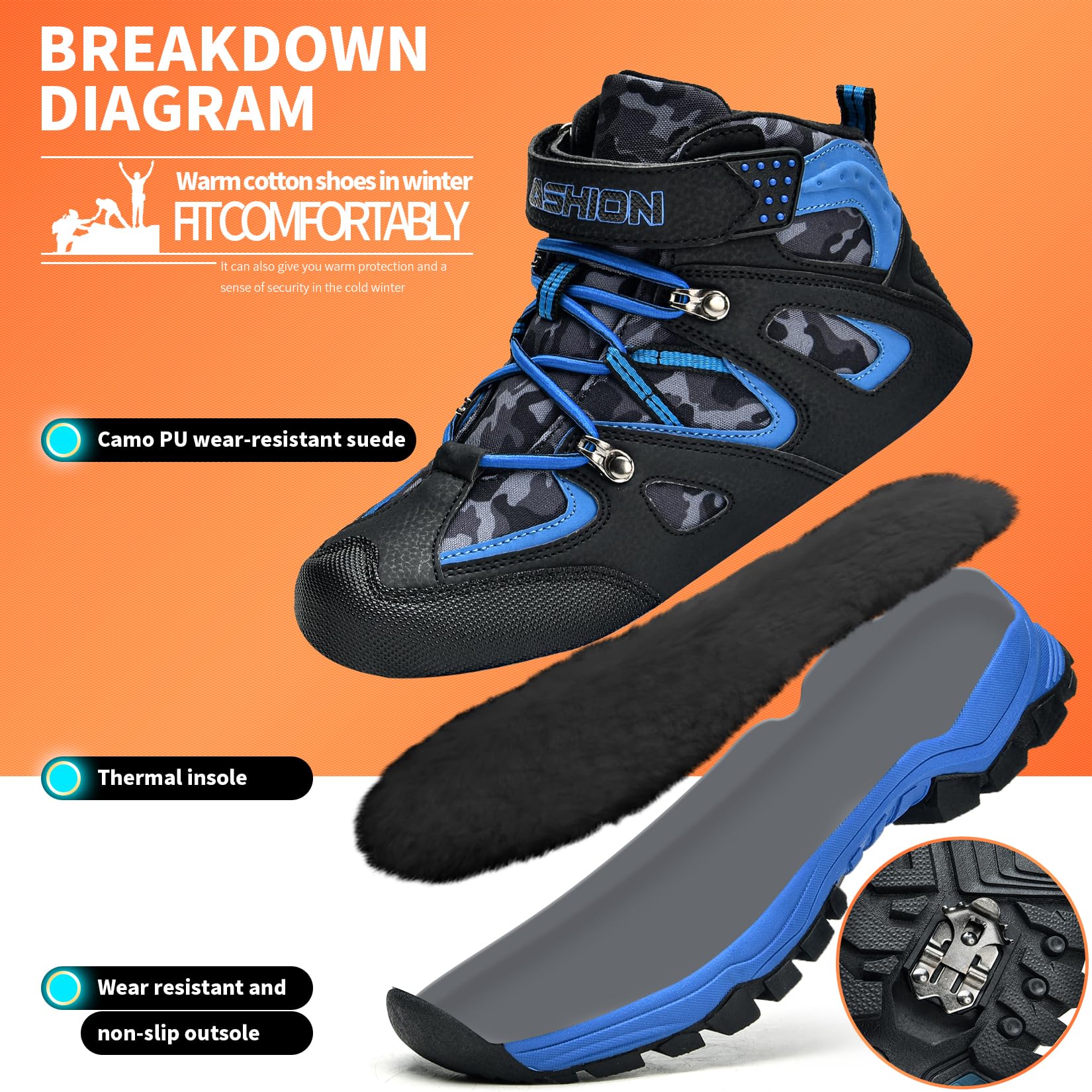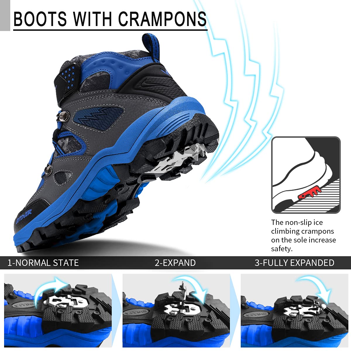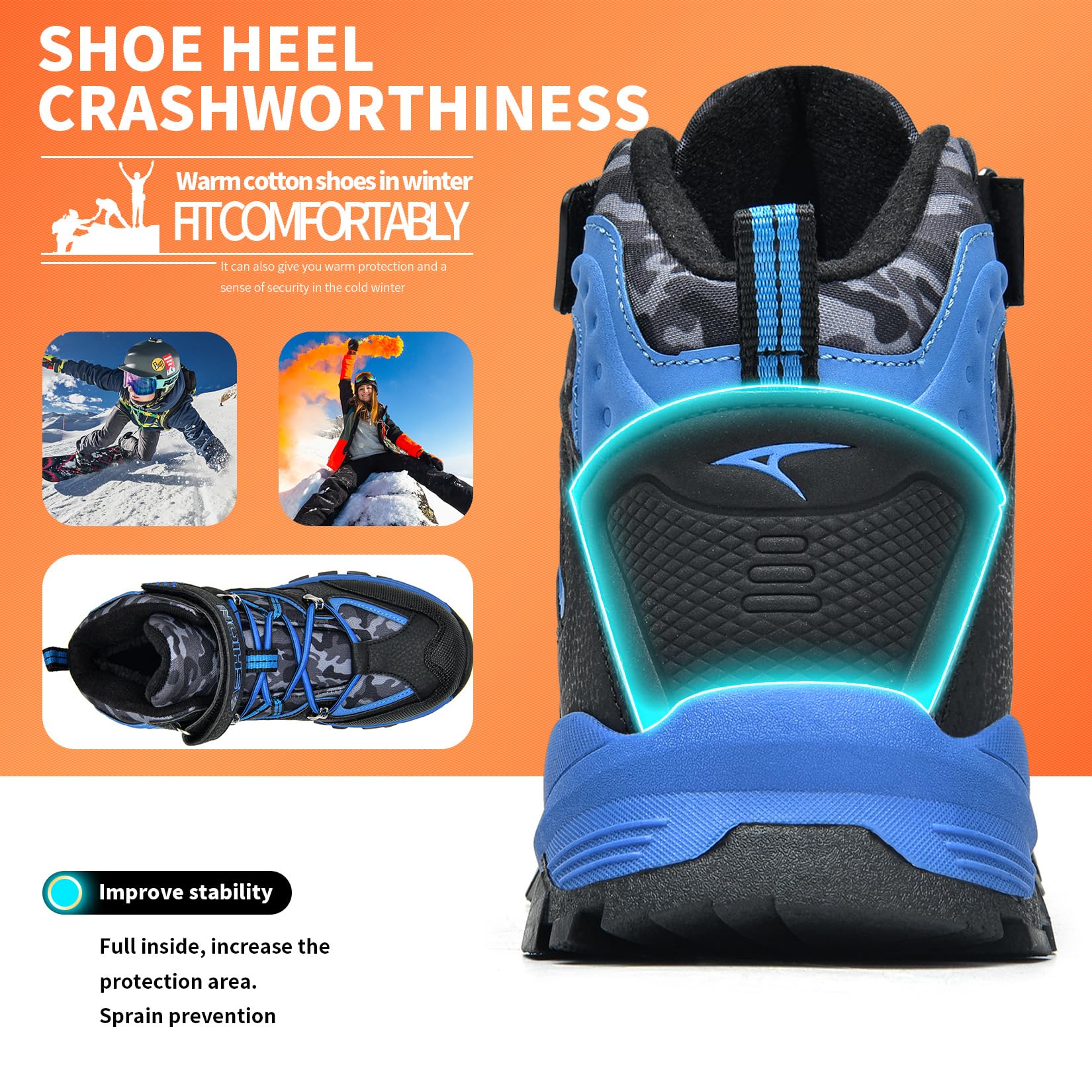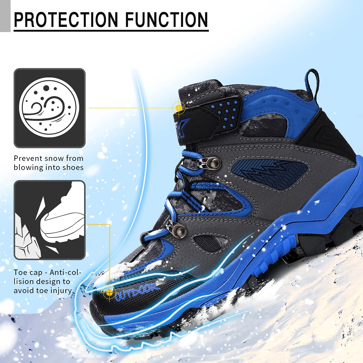 - 【Boys Snow Boots with Anti-slip Ice Climbing Crampon Sole】Boys Boots with anti-slip rubber sole with ice clleats is designed to meet the special anti-slip requirements such as snow walking shoes and outdoor hiking shoes make kids walking more safe