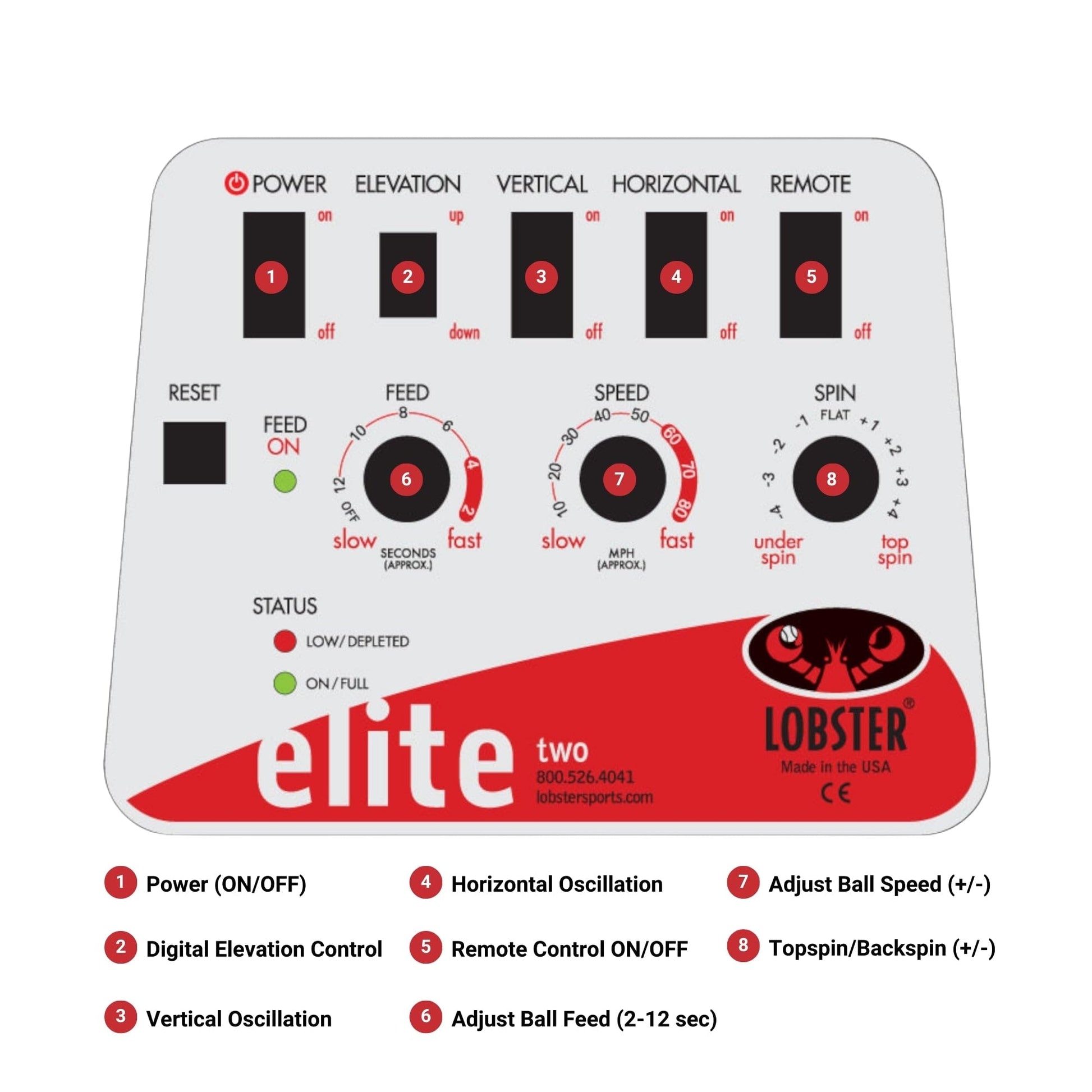- EXTENDED LONG BATTERY LIFE: The battery-operated Elite Two tennis machine has a rechargeable battery that offers 4 to 6 hours of gameplay and includes a Lobster Sports standard battery charger.