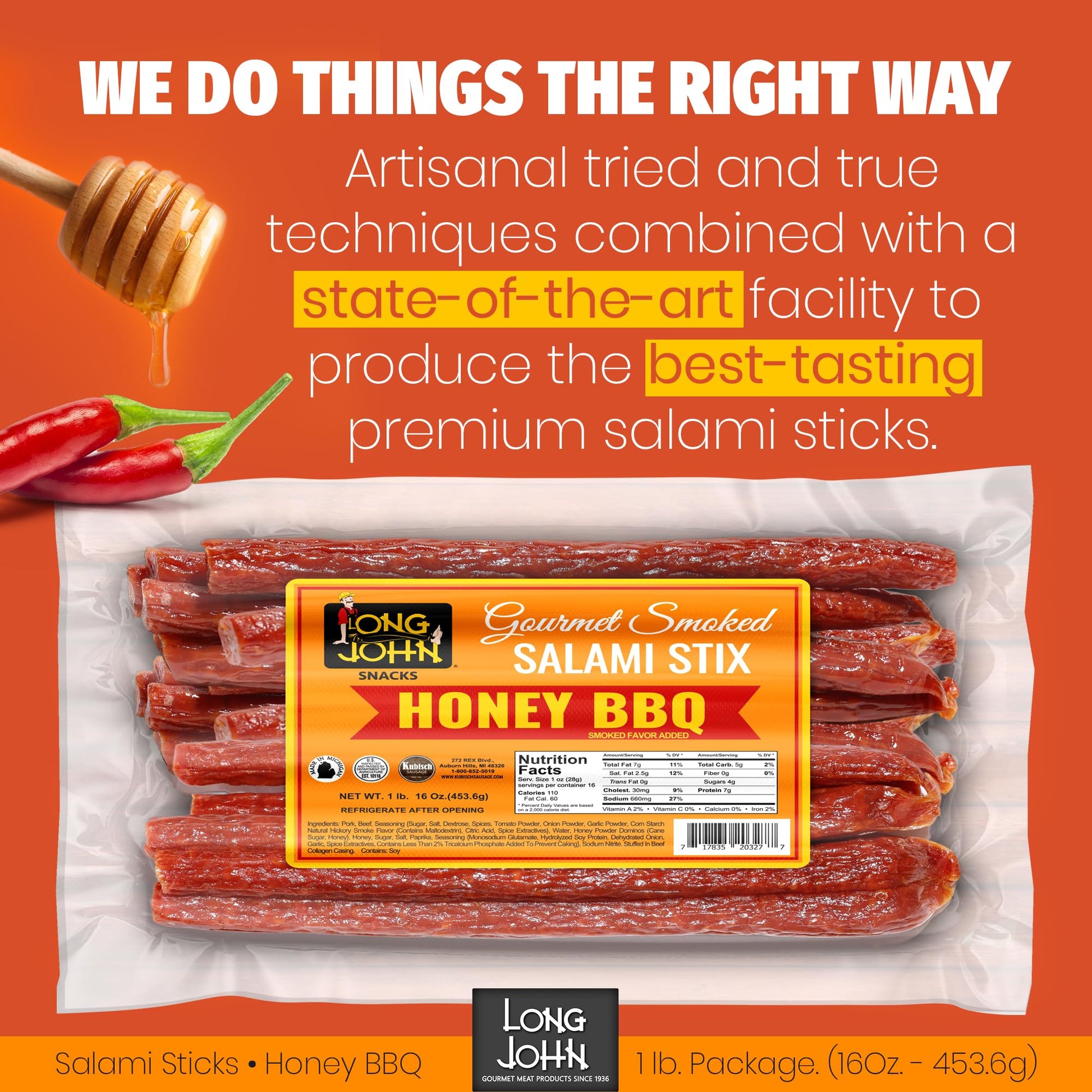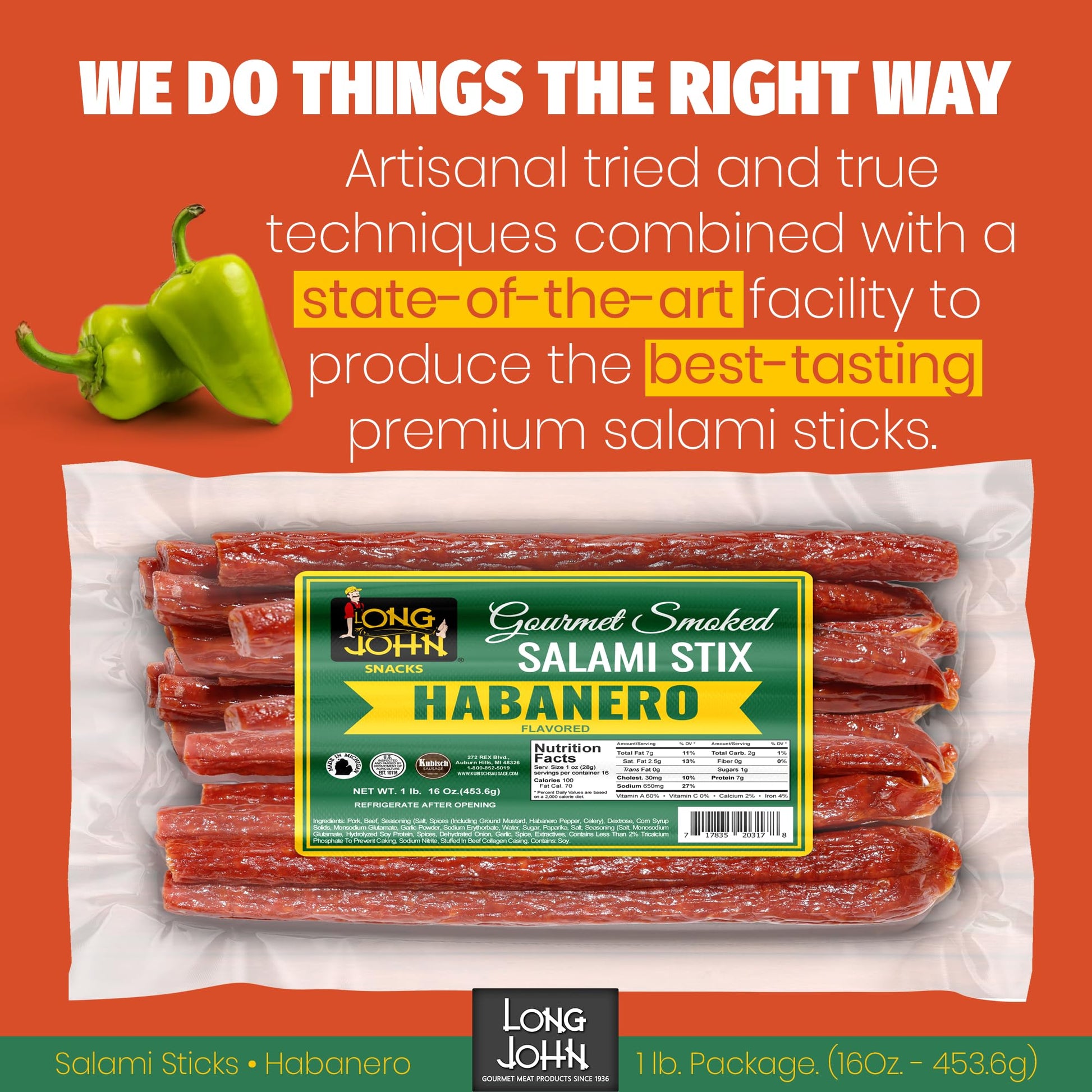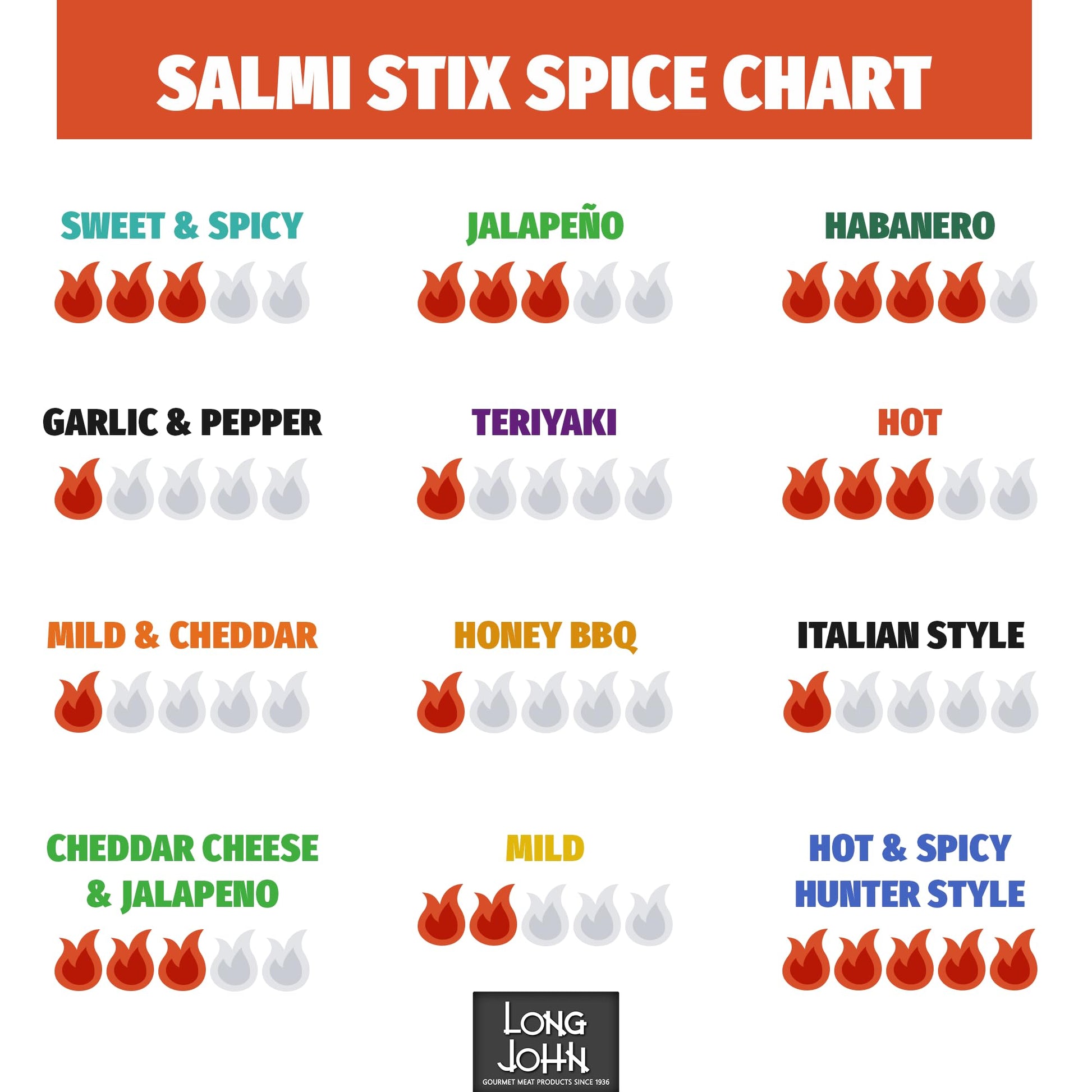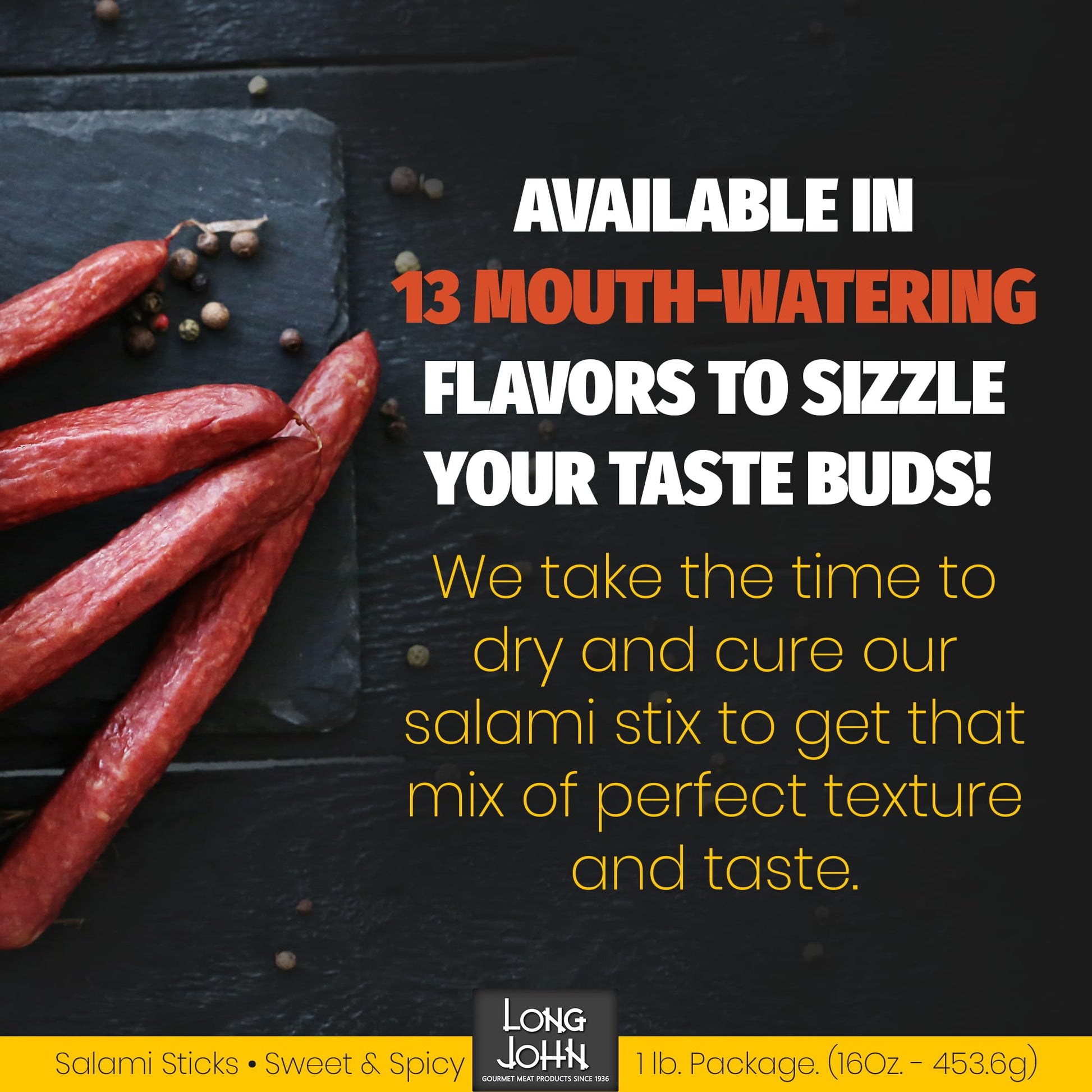 Long John dry salami sticks come in 13 exciting flavors to better match your tastebuds, including spicy “Hot” and Habanero, Honey BBQ, Garlic & Pepper, and even mild.