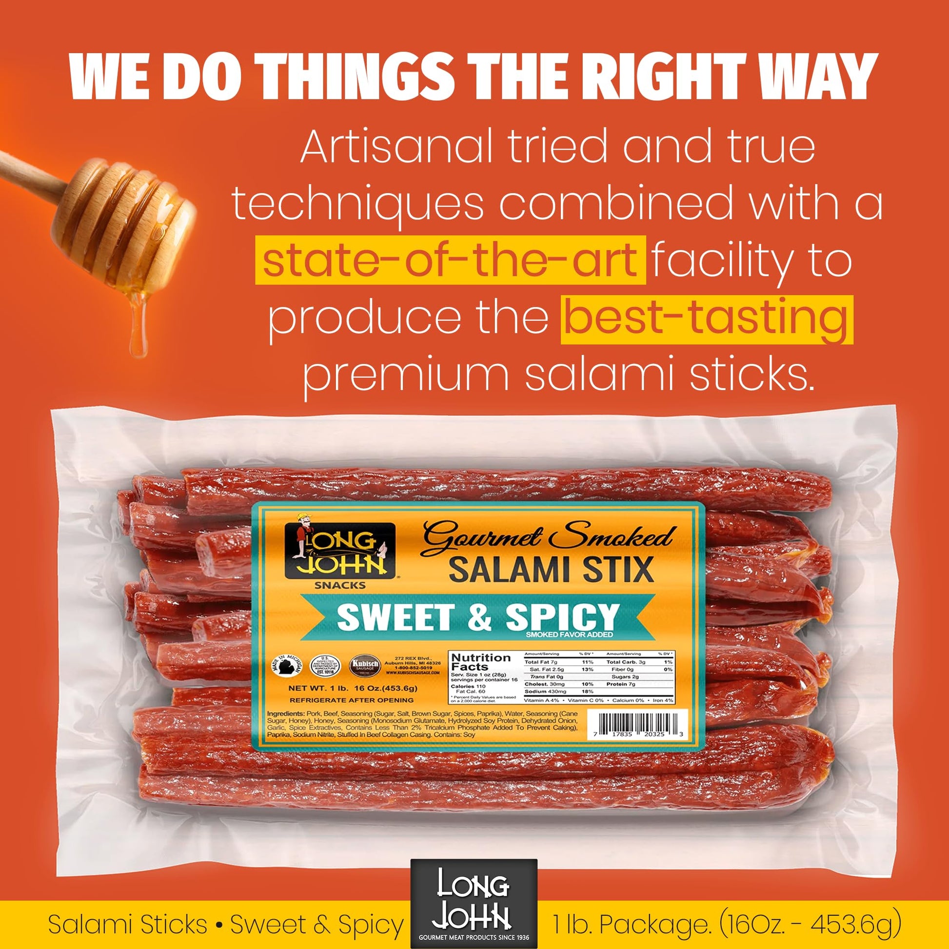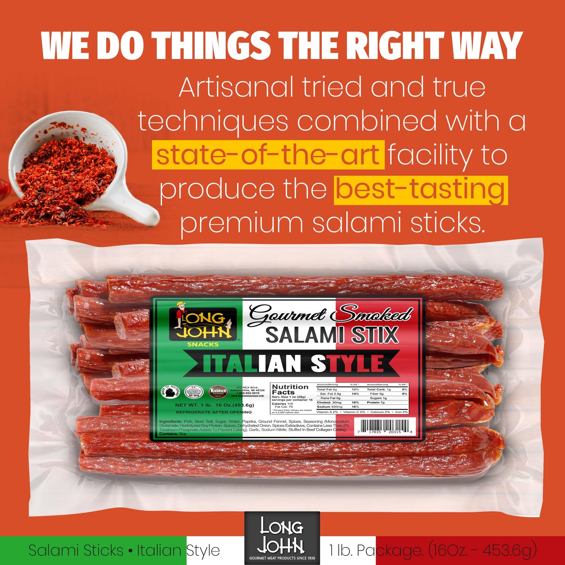 - FRESHNESS ABOVE ALL: Our commitment to using fresh, USA sourced, and never frozen meats sets us apart and ensures that every bite of our Dried Salami Sticks burst with unparalleled taste. The secret to extraordinary flavor lies in the quality of our ingredients, that’s why we never settle for anything less than premium, whole cuts of pork and beef, delivered fresh to our kitchens.