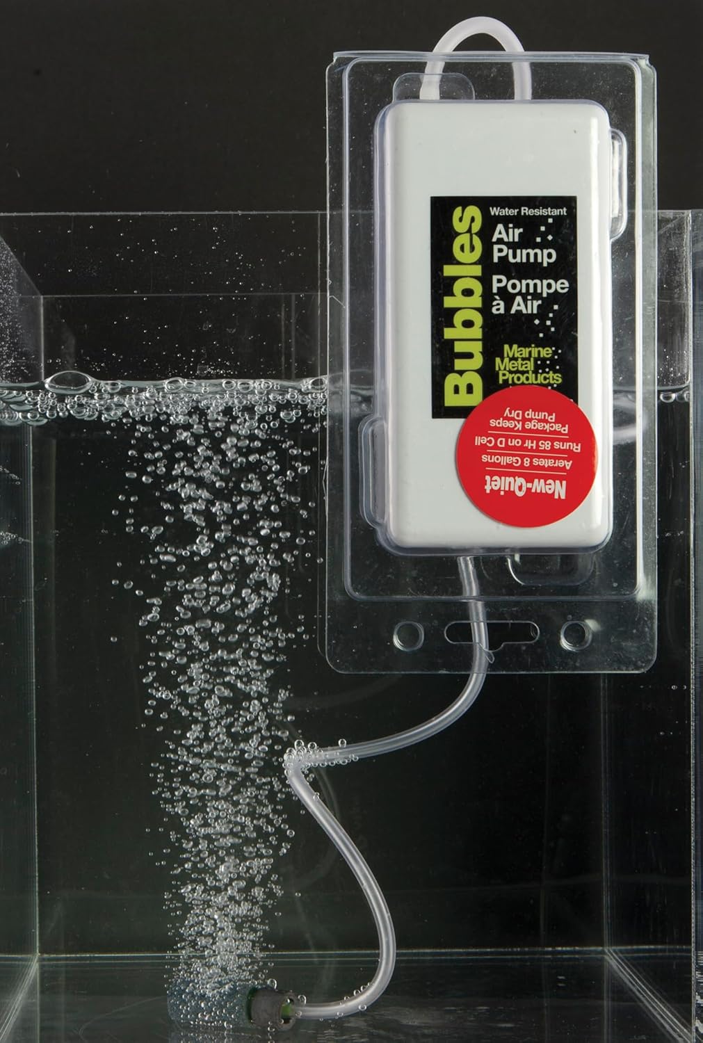 Marine Metal Bubbles Air Pump has a precision motor that runs +/- 100 hours on 2 alkaline D cell batteries. Featuring a booted waterproof switch, this air bubbler is water-resistant and long lasting. Its included weighted glass bead airstone with 30" of airline tubing. Marine Metal Bubbles Air Pump is a portable, affordable oxygen diffuser to keep live bait fresh or as a back up pump for aquariums. Includes an impact-resistant case and adjustable stainless steel clip for attaching to any bucket.