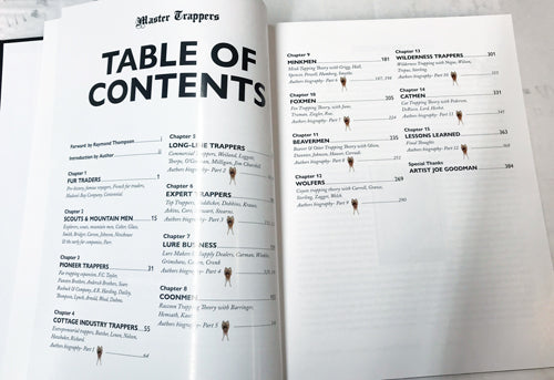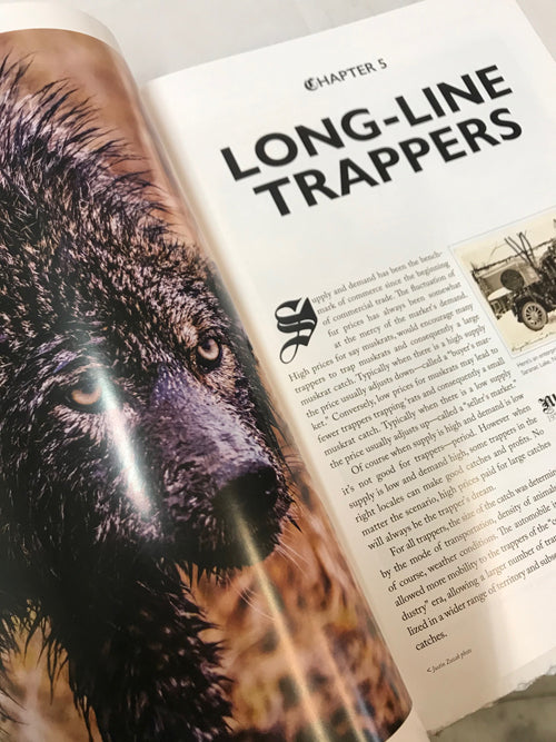To give you an idea of the magnitude of materials in this book, here's a short list of the biographies, methods and trappers included: Hudson's Bay Company, Hugh Glass, Jedediah Smith, Jim Bridger, Kit Carson, John Johnson, Sewell Newhouse, The Fur Companies, A.R. Harding, E.J. Dailey, Raymond Thompson, Walter Arnold, Dick Wood, O.L.Butcher, Bill Nelson, Curtis Grigg, Bud Hall, Herb Lenon, Stanley Hawbaker, Pete Rickard, Garold Weiland, Pete & Ron Leggett, Johnny Thorpe, Craig O'Gorman, Ray Milligan, Slim Pedersen, Major Boddicker, Charles Dobbins, Ken Smythe, Tom Krause, Pete Askins, Odon Corr, Russ Carman, Tim Caven, Paul Grimshaw, Keith Winkler, Oscar Cronk, Neil Olson, Mark June, Wayne Negus, Brandon Johnson, Jim Spencer, Kyle Kaatz, Bernie Barringer, Don Powell, James Lord, Paul Trepus, Scott Welch, Tom Parr,Tracy Truman, Mark Zagger and many, many others.