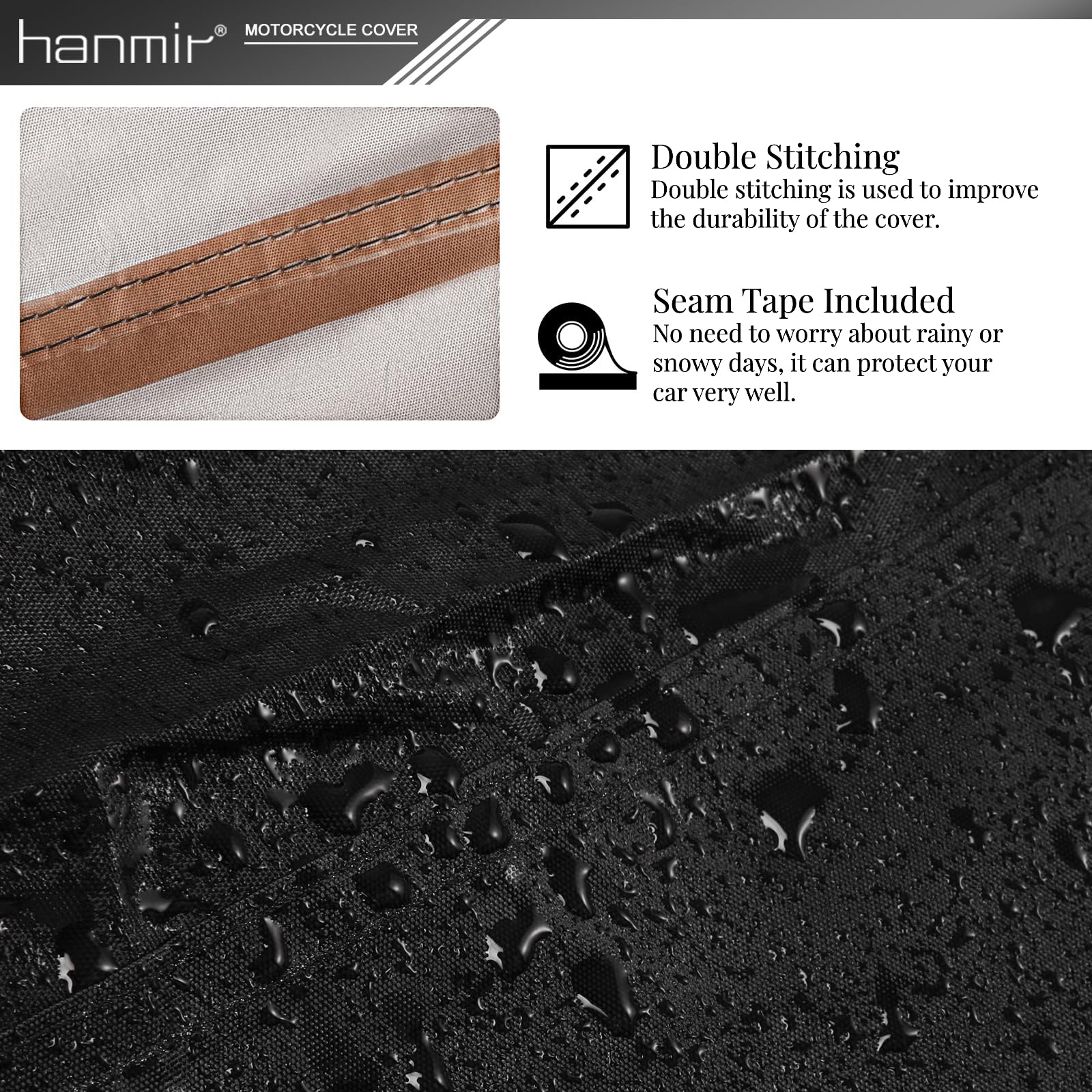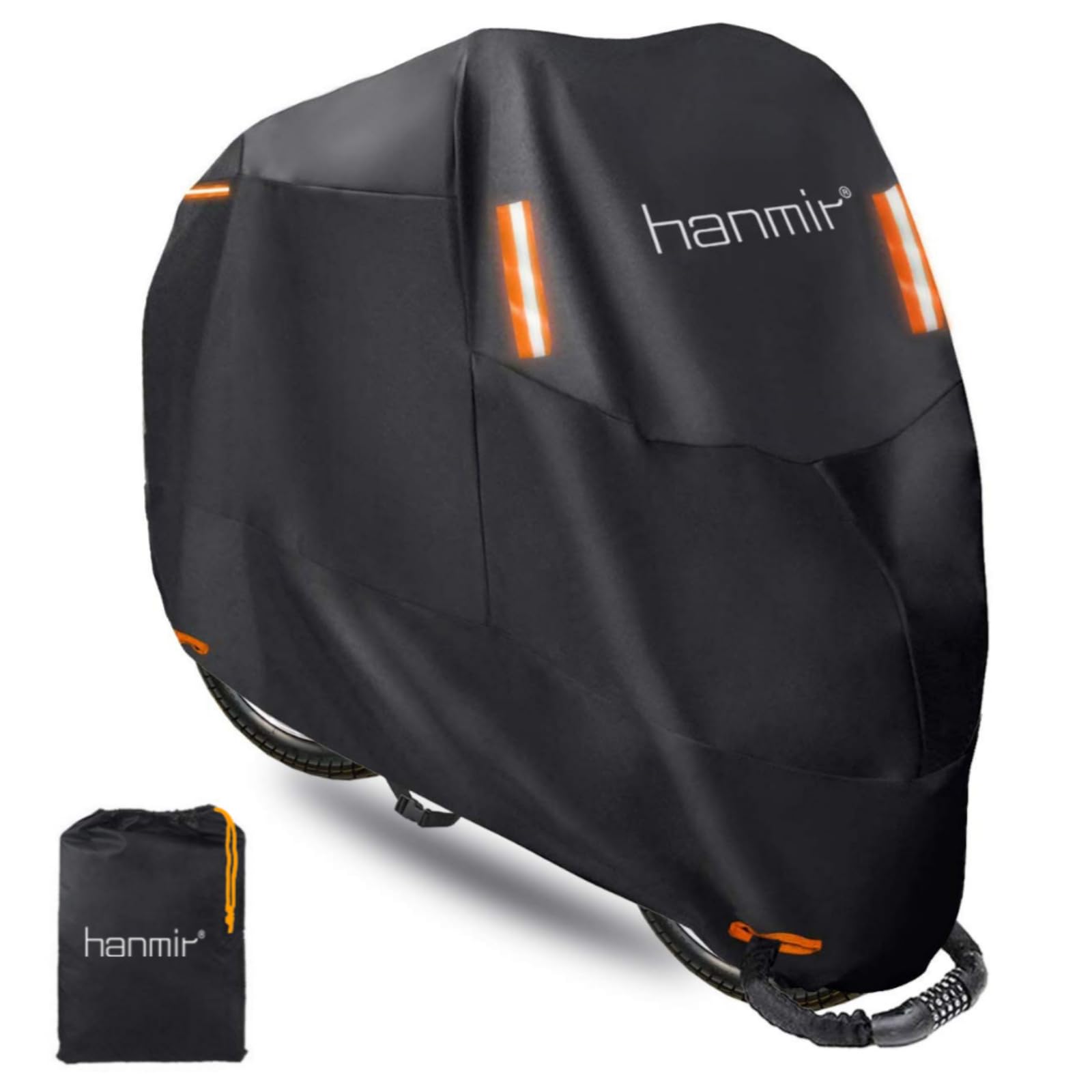 Hanmir All Season Heavy Duty Motorcycle Cover is waterproof, breathable, durable and made to last, providing you with top to bottom protection from rain, dust, heat, ice, snow, damaging uv, tree sap, bird dropping, etc. It has safety hole and windproof buckle to allow for convenient storage. Our motorcycle covers are universal fit for most types of motorcycles like cruisers, sports bike, touring motorcycles, etc.