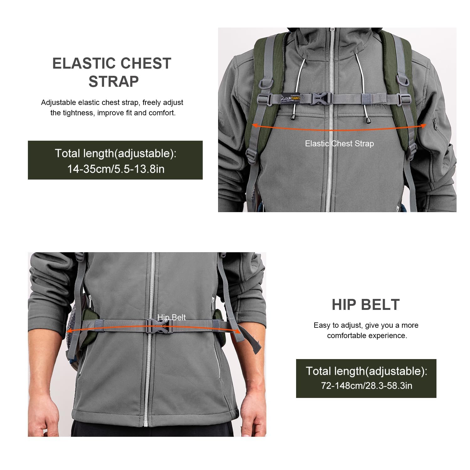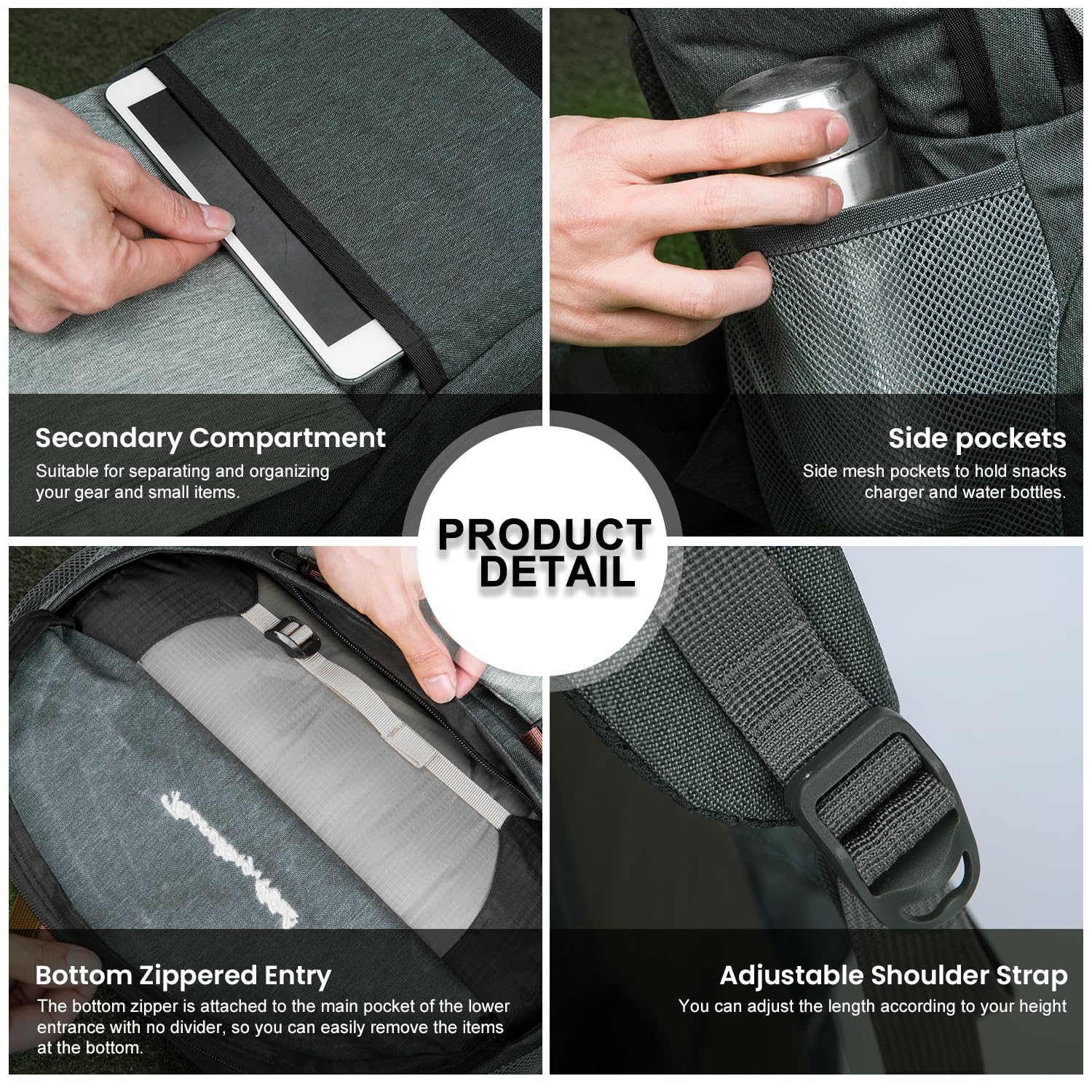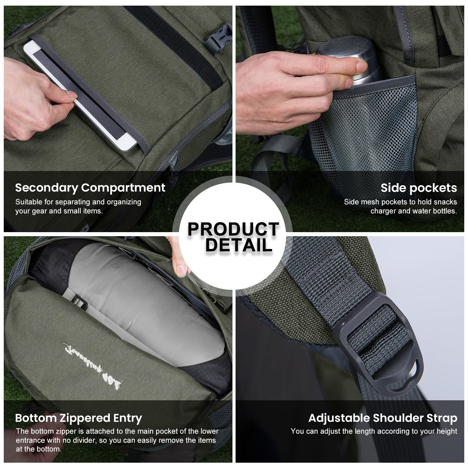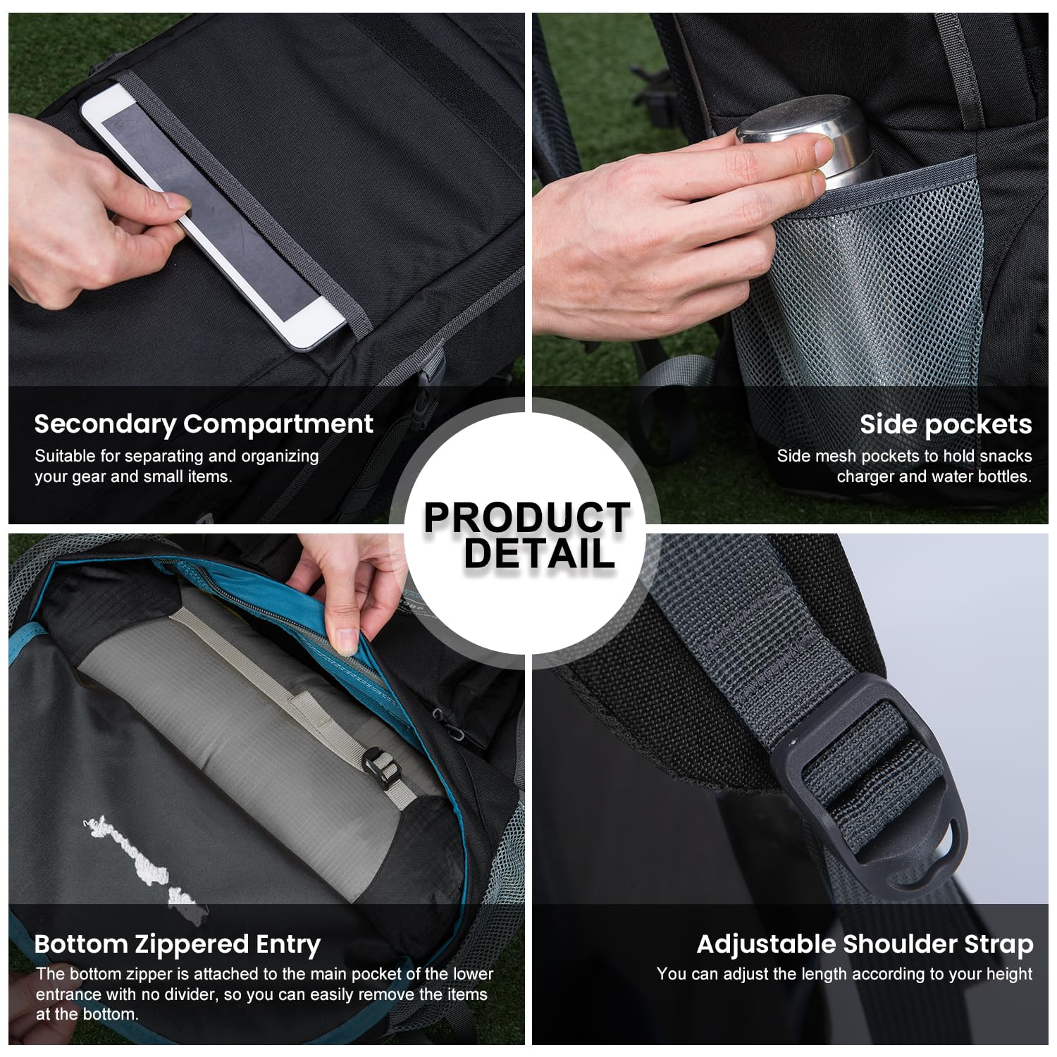 • Well-designed details: This outdoor backpack has many clever and convenient designs. The bottom compartment provides direct access to the main compartment; there is also a dedicated compartment for a water bladder (WATER BLADDER NOT INCLUDED), In addition, various shrink straps can also carry camping equipment such as trekking poles, sleeping bags and tents.