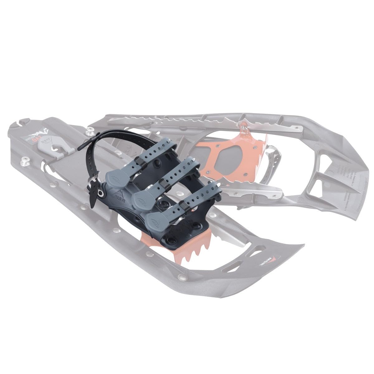 - Steel traction rails and brake bars molded directly into snowshoe decks provide a secure grip
